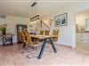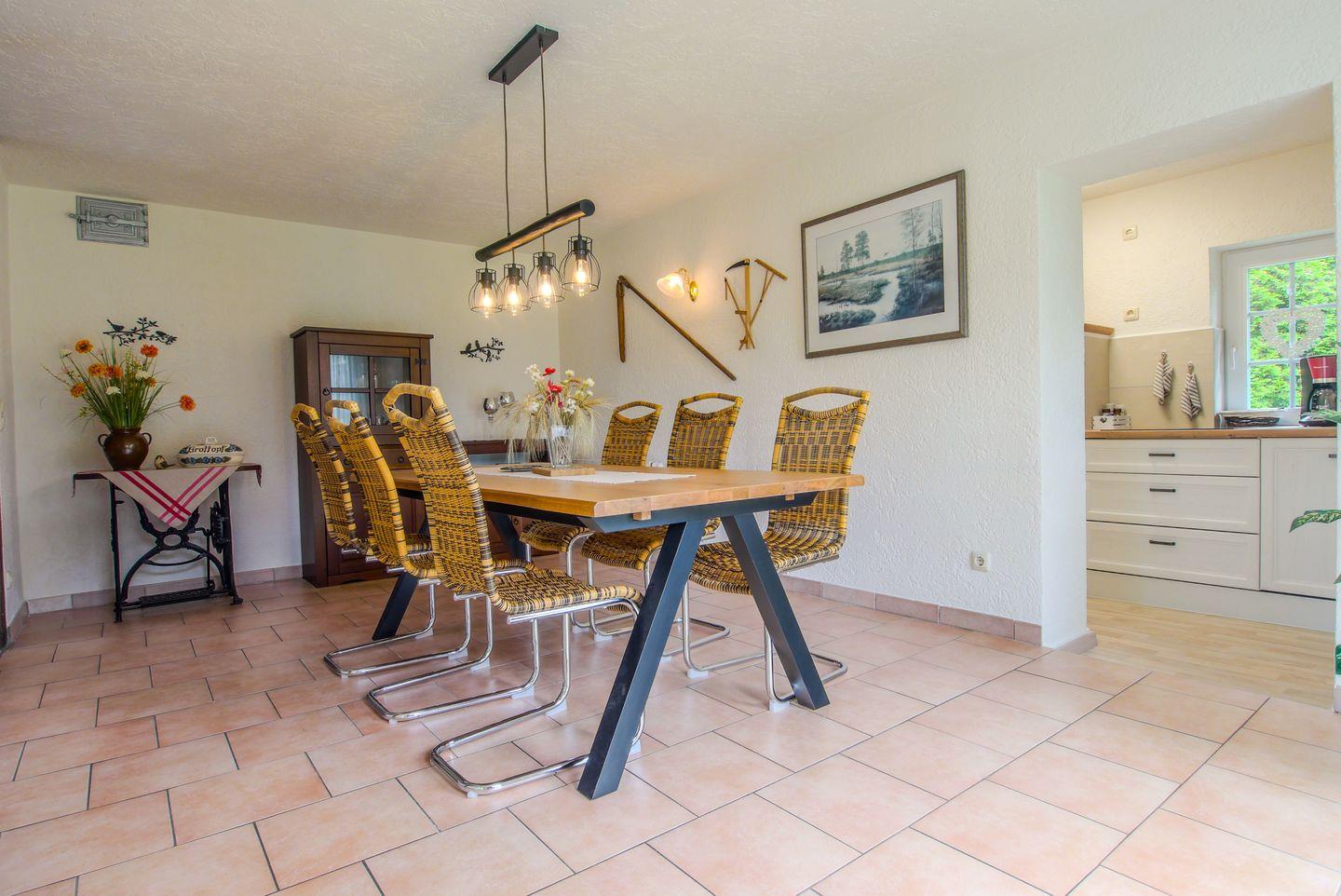 Das Esszimmer ist hell und geräumig gestaltet, mit großen geflochtenen Stühlen und einem massiven Holztisch.
