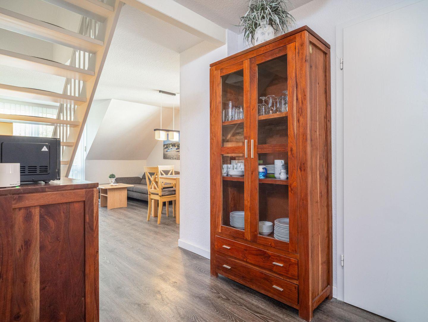 Begeben Sie sich in den gemütlichen Wohn- und Essbereich, der mit einer modernen Einbauküche ausgestattet ist. Hier können Sie gemeinsam kochen und die schönsten Momente teilen. Die Küche bietet alles, was das Herz begehrt: Kochfeld, Spülmaschine, Mikrowelle, Kühlschrank, Toaster, Wasserkocher und sogar eine Filterkaffeemaschine.