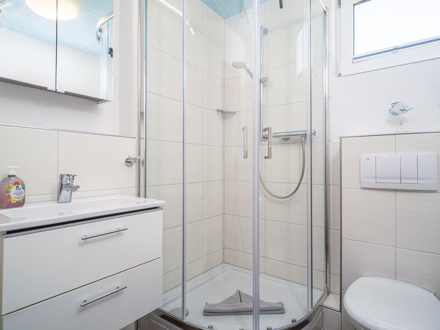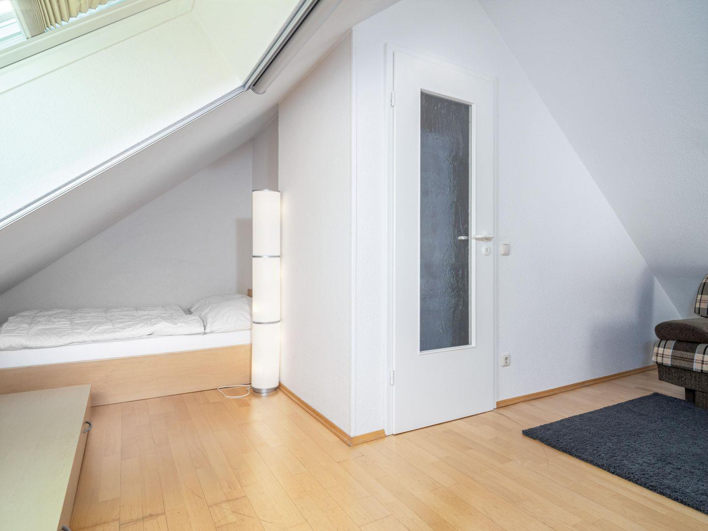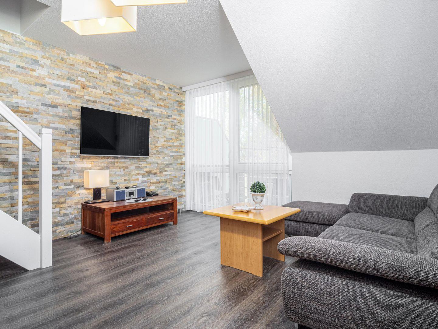 Die Wohnung entfaltet sich auf zwei Ebenen in einem warmen, einladenden Ambiente. Ihr erster Blick fällt auf das charmante Schlafzimmer mit zwei Einzelbetten, ideal für eine ruhige Nacht. Gleich daneben befindet sich das zweite Schlafzimmer mit einem komfortablen Doppelbett, das zum Entspannen einlädt. Das moderne Badezimmer mit Dusche und WC ist ein weiteres Highlight, das keine Wünsche offen lässt.