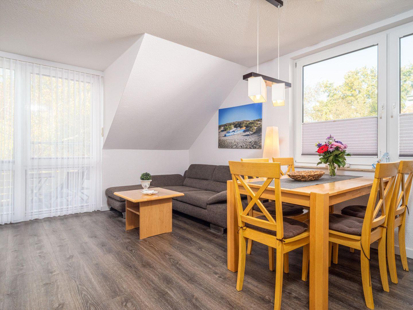 Stellen Sie sich vor, Sie betreten Ihre traumhafte Ferienwohnung, die sich in der idyllischen Dachgeschoss-Etage des Haus 3 einer gepflegten Anlage befindet. Nur wenige Schritte vom Strand entfernt, erwartet Sie hier ein wahrer Urlaubstraum auf 65 Quadratmetern, perfekt für bis zu 6 Personen.