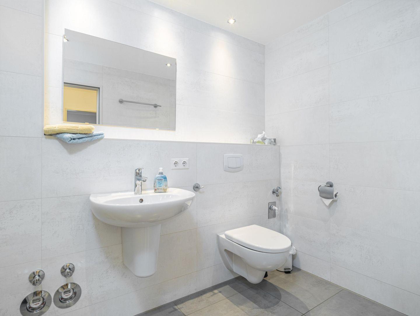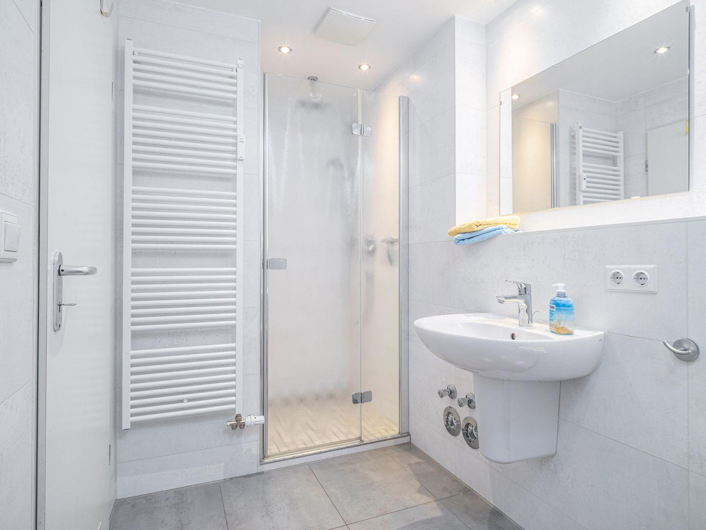 Das renovierte Badezimmer ist hell und freundlich eingerichtet und verfügt über eine ebenerdige Dusche.