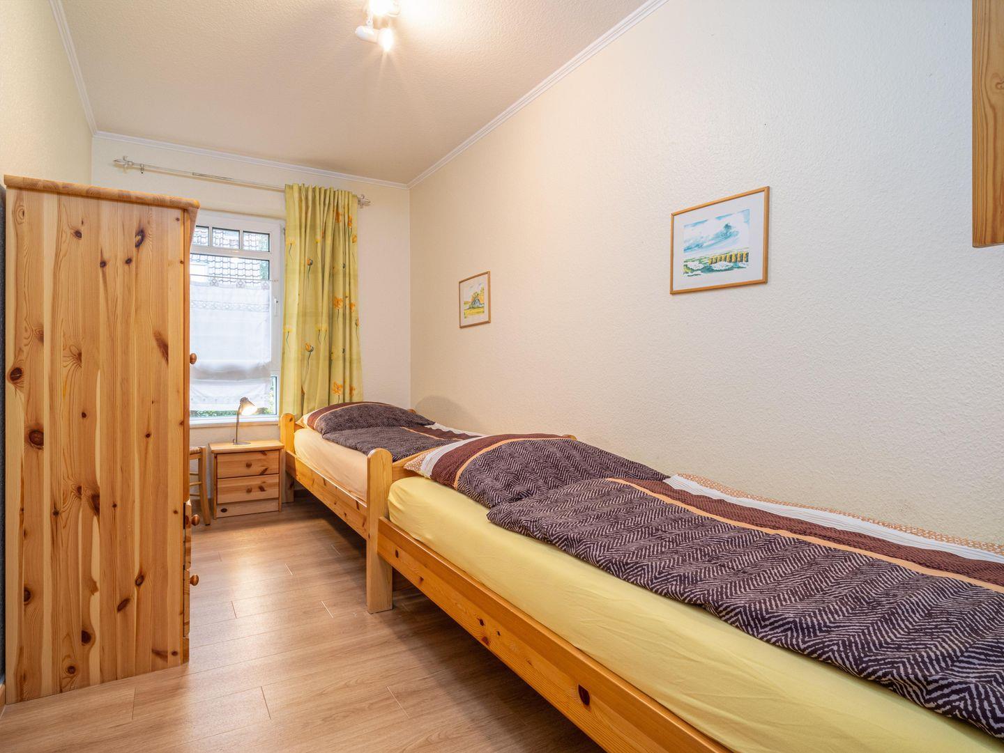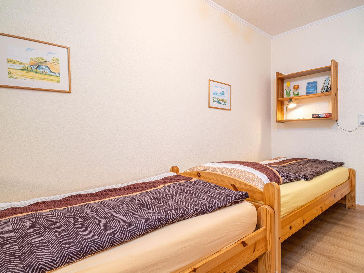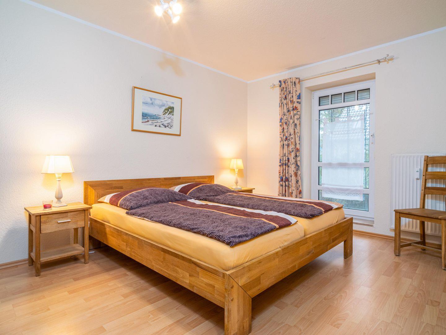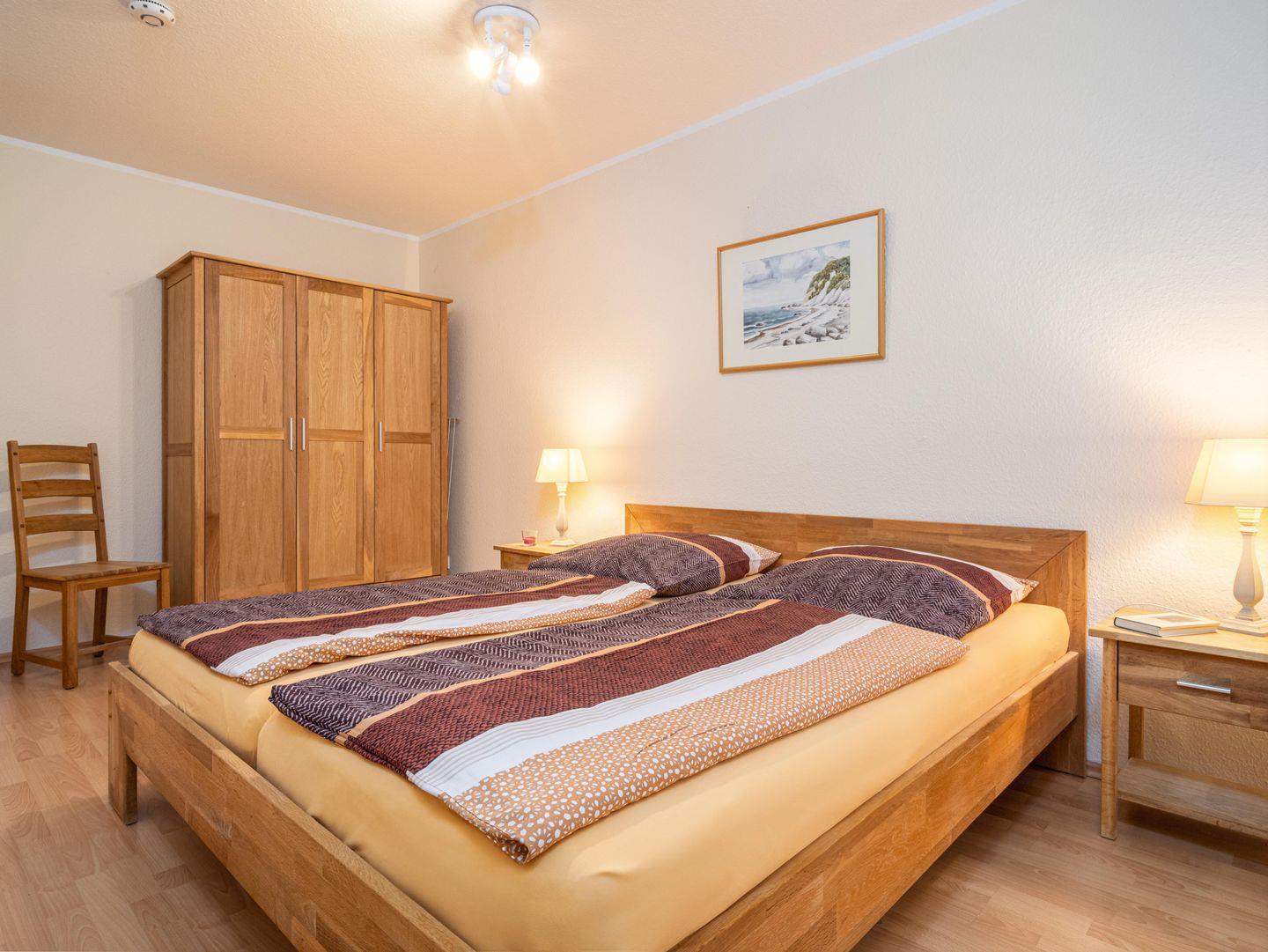 Die Wohnung verfügt über zwei Schlafzimmer, wobei das größere mit einem Doppelbett ausgestattet ist. Im kleineren Schlafzimmer stehen zwei Einzelbetten zur Verfügung.