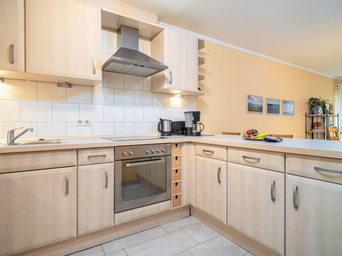 Der helle Wohnbereich mit den beiden Sofas geht nahtlos in den Essbereich und die separate Küche über. Diese ist umfangreich ausgestattet.