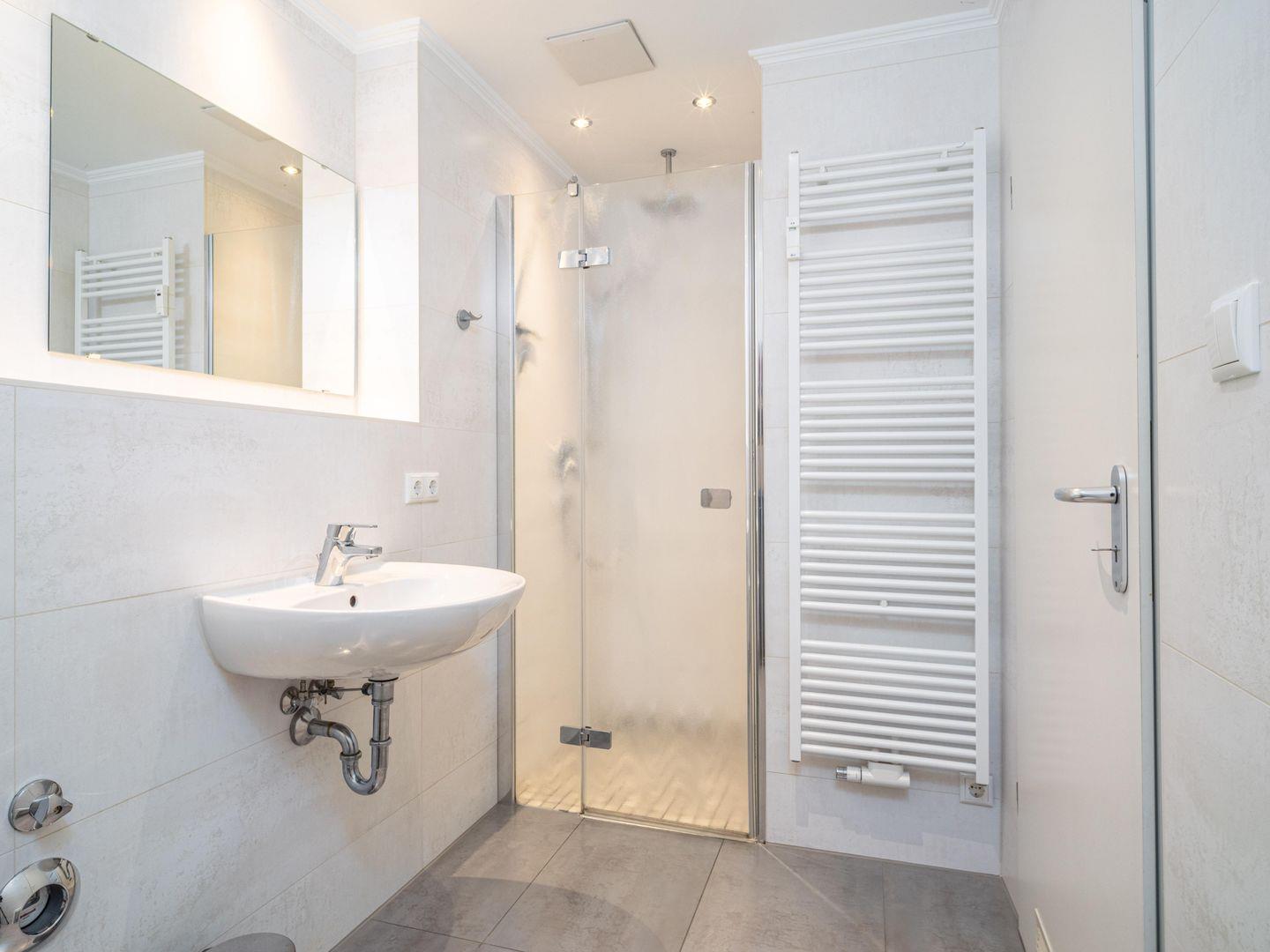 Das Badezimmer ist hell und freundlich eingerichtet und verfügt über eine ebenerdige Dusche.