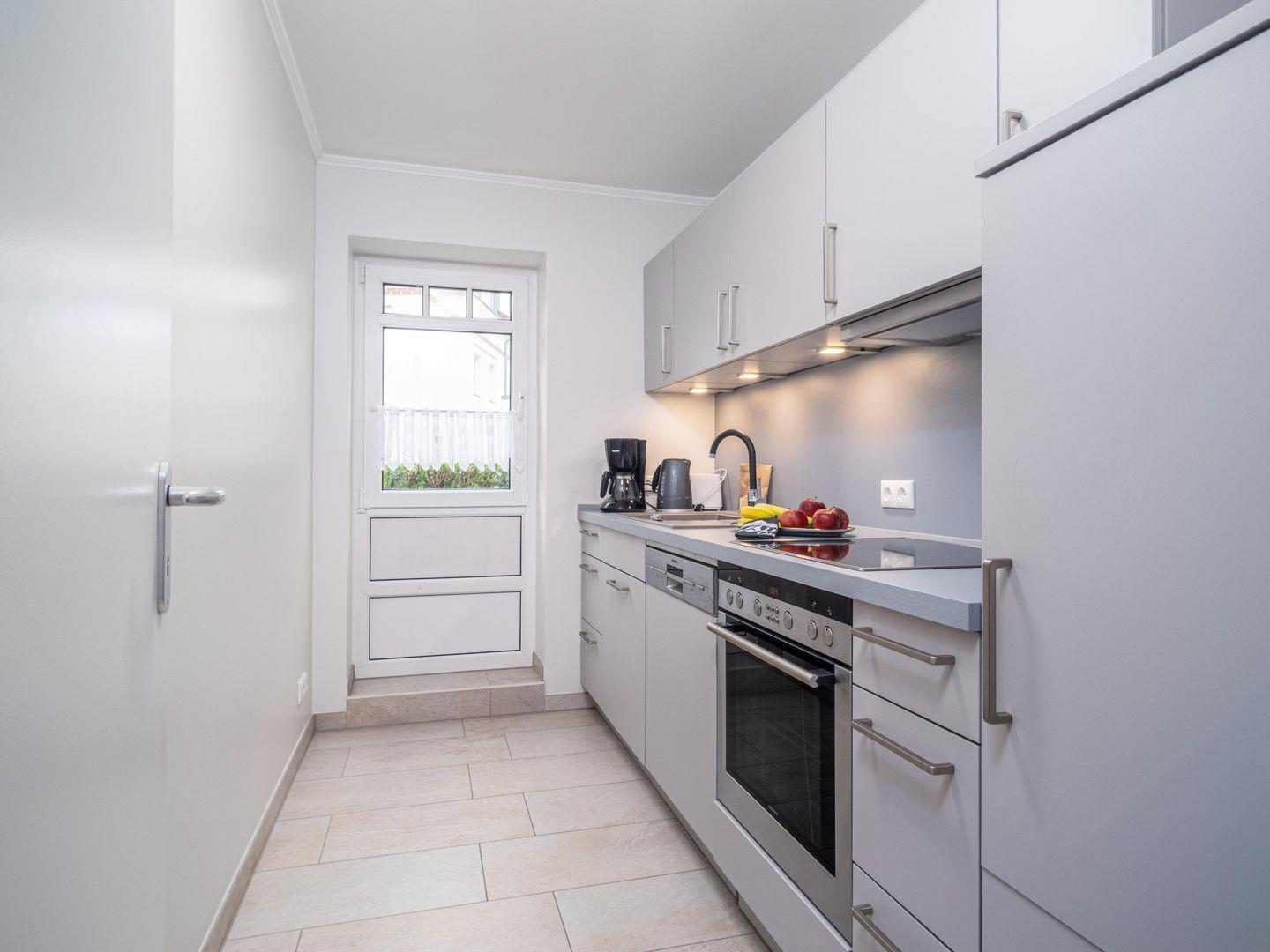 Eine moderne separate Küche in hellem und freundlichen Design rundet die Ausstattung ab.