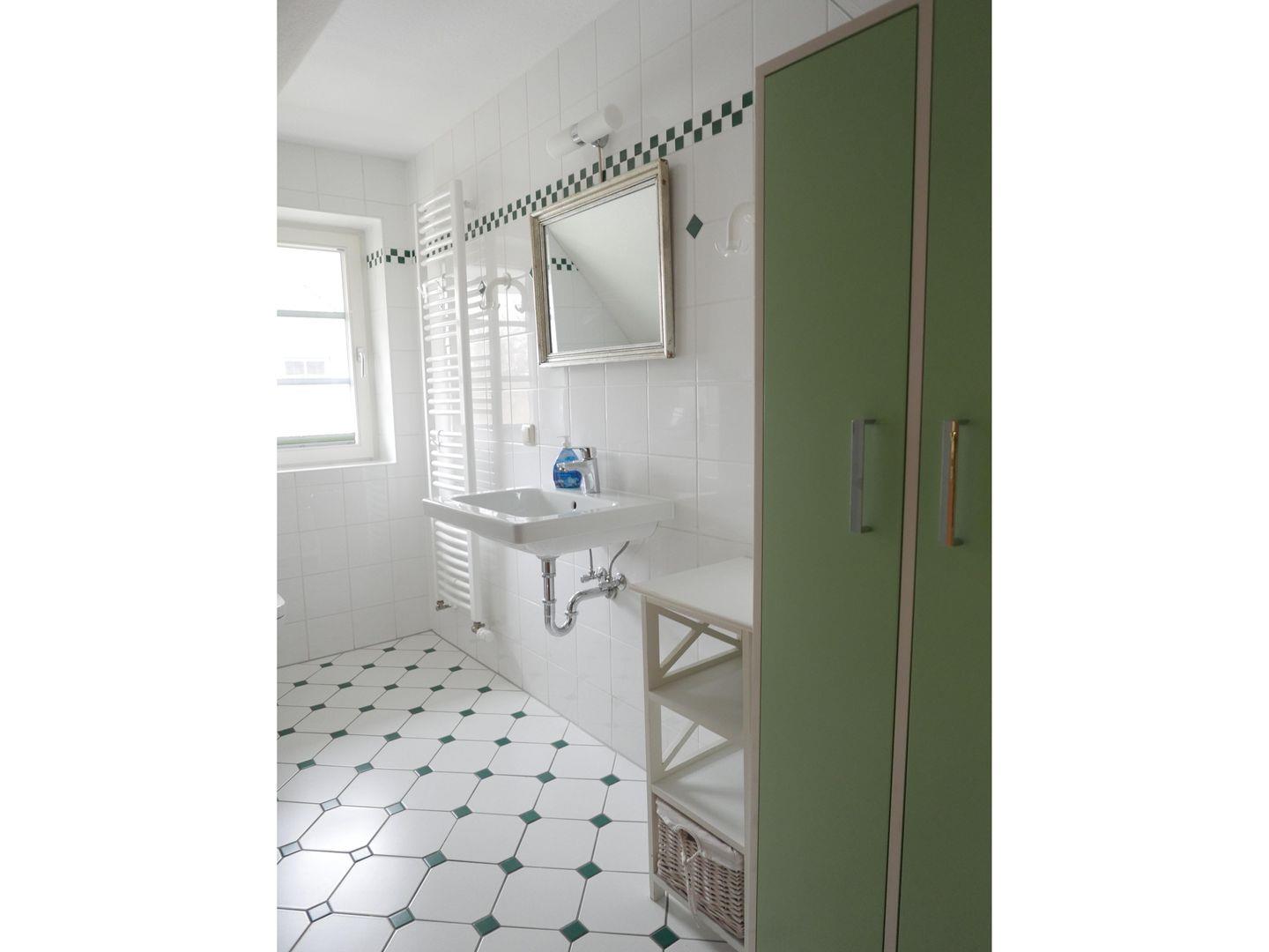 Das Schlafzimmer liegt nach Osten, ist mit einem 180 cm breiten Doppelbett (mit zwei separaten Lattenrosten und Matratzen) sowie einem großen Kleiderschrank möbliert. Das helle Badezimmer mit Fenster hat eine Duschtasse.