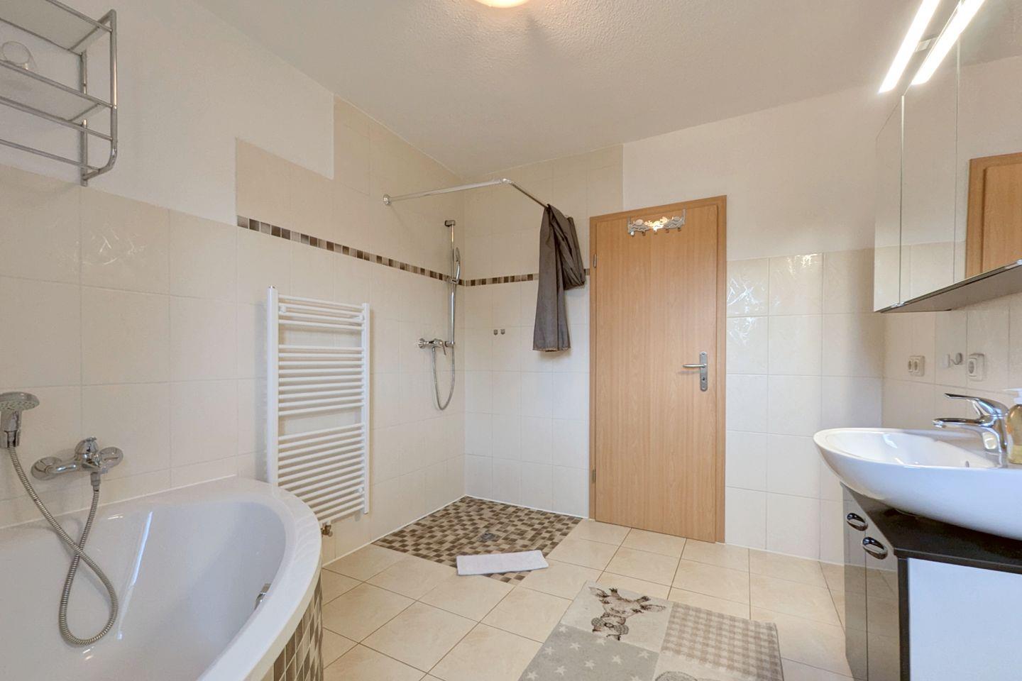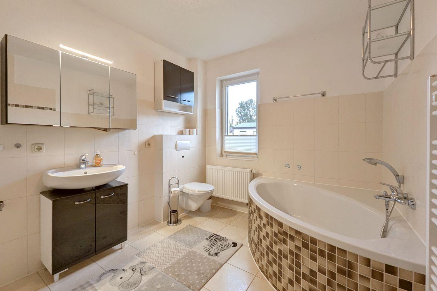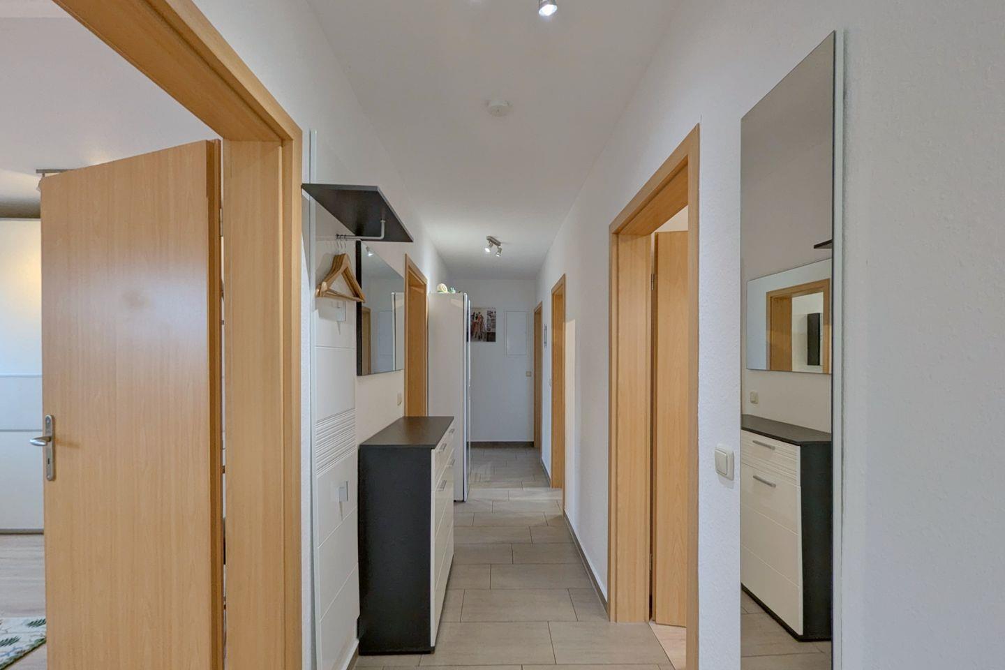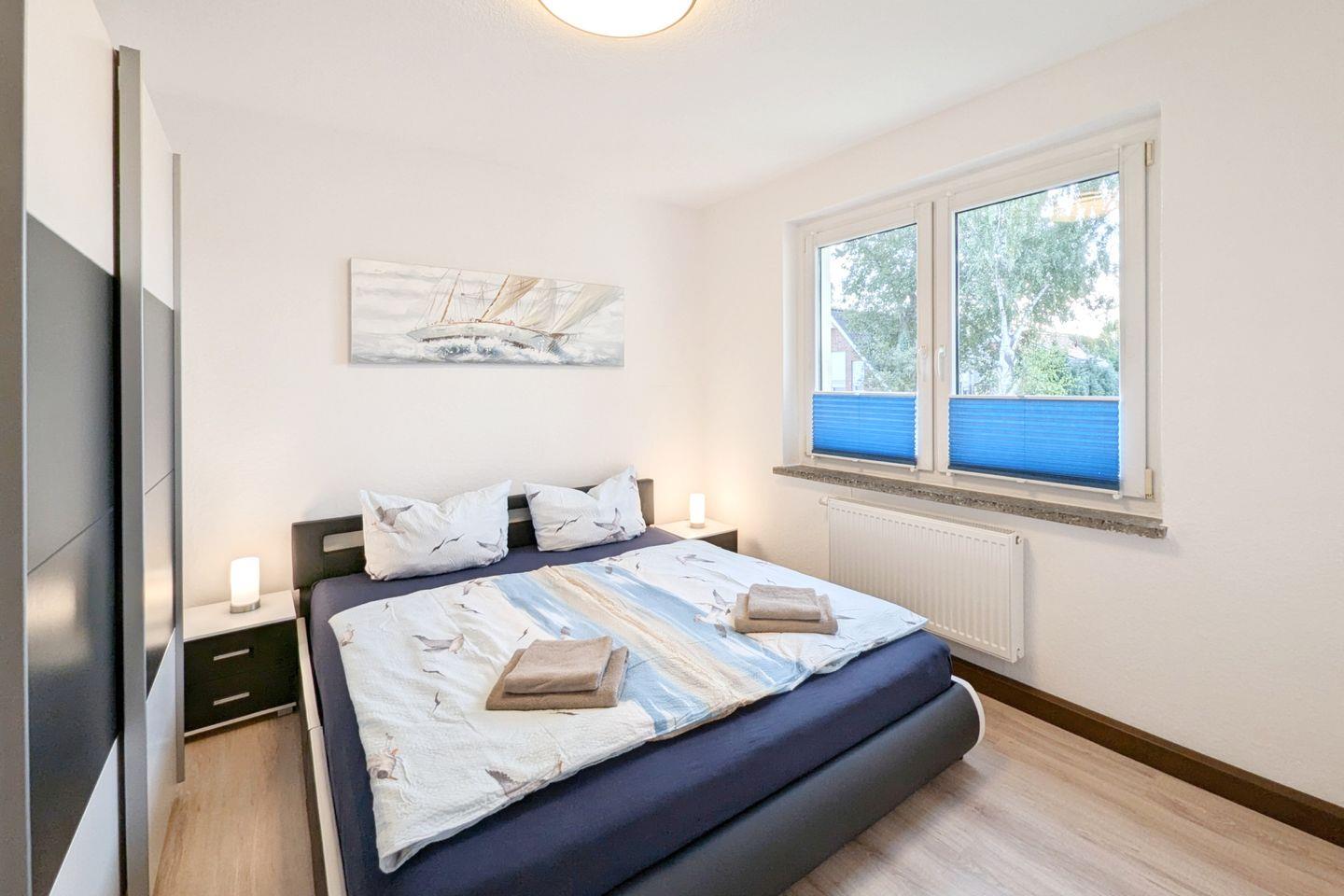 Zwei geschmackvoll eingerichtete Schlafzimmer bieten Ihnen einen erholsamen Schlaf. Die Schlafzimmer sind mit hochwertigem Laminatboden ausgestattet und garantieren durch angenehme Ruhe einen entspannten Schlaf. Darüber hinaus bietet die Wohnung ein modernes Badezimmer mit bodengleicher Dusche und Badewanne, in dem Sie nach einem aufregenden Tag in der Natur wunderbar entspannen können.