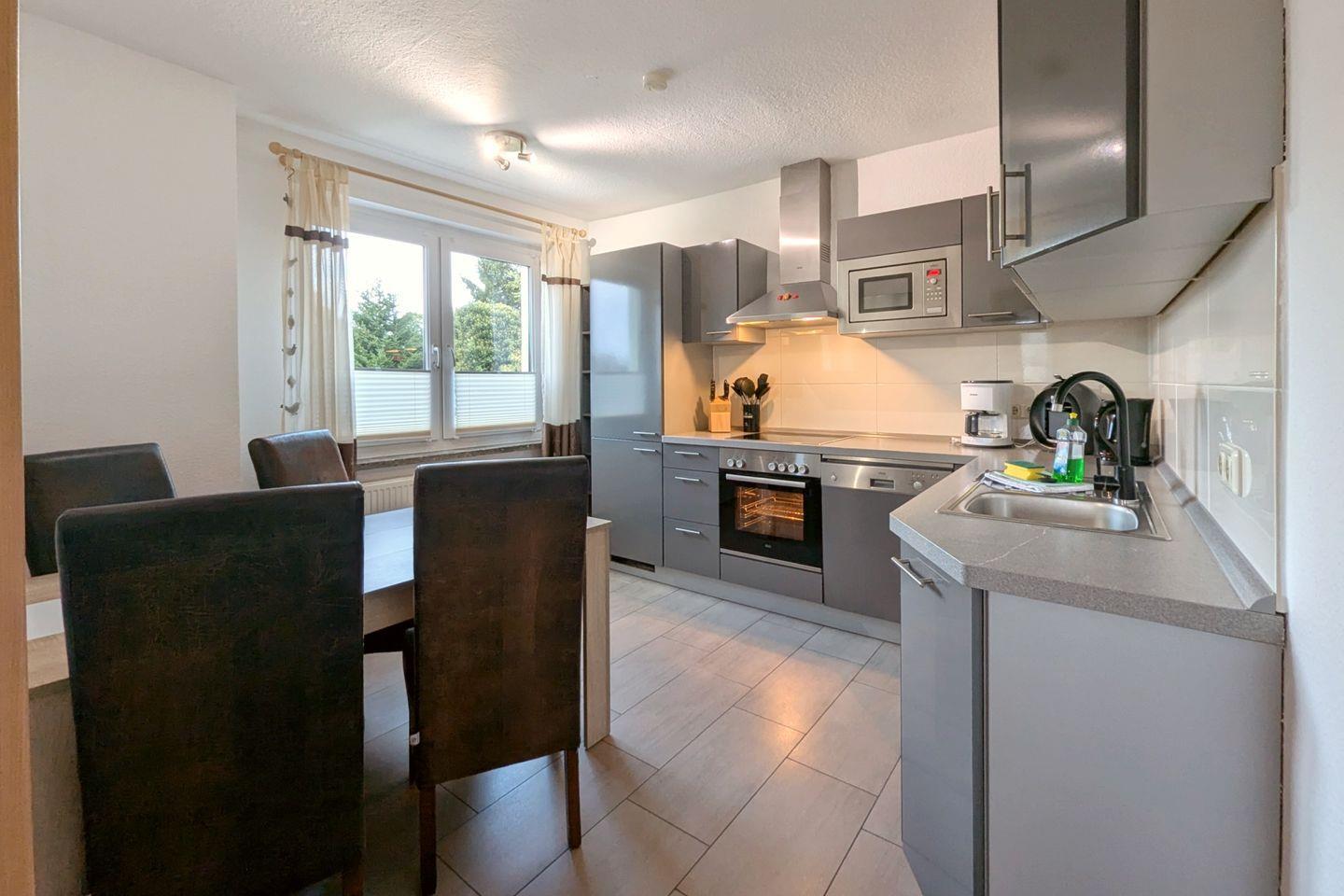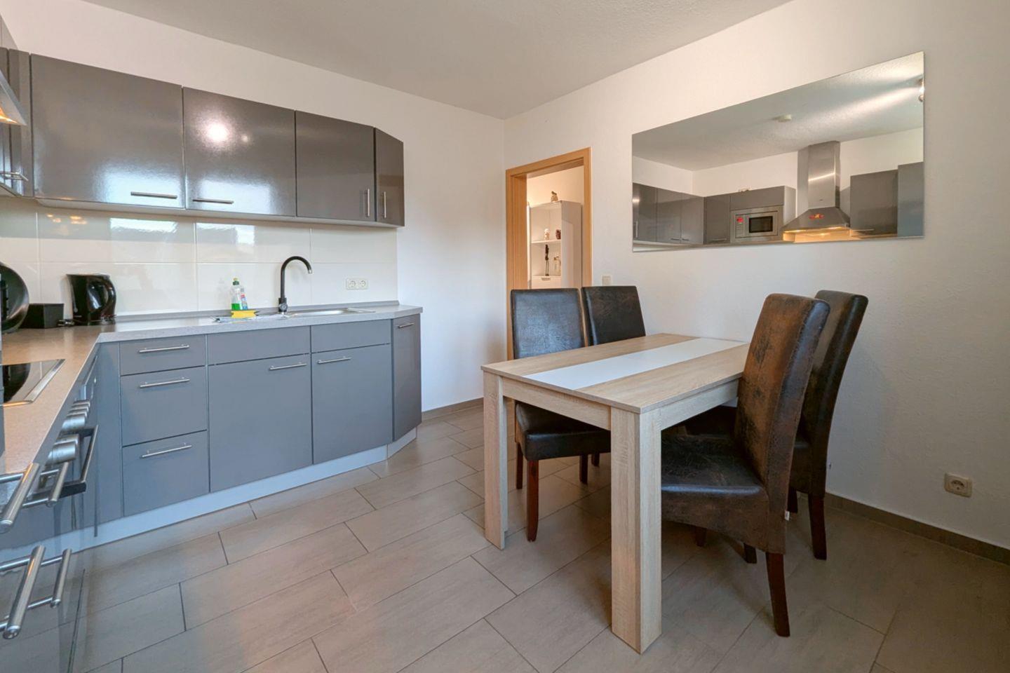 Die Wohnung selbst erstreckt sich über zwei Etagen und überzeugt durch eine moderne Ausstattung. Im ersten Stock finden Sie einen hellen Wohnbereich mit Sofaecke und einem Esstisch, der das Herzstück der Wohnung bildet und zum geselligen Verweilen einlädt. Eine voll ausgestattete, geschlossene Küche mit modernen Geräten wie Mikrowelle, Geschirrspüler und Kaffeemaschine steht für Ihre kulinarischen Abenteuer bereit. Hier können Sie gemütlich frühstücken oder romantische Abendessen zubereiten.