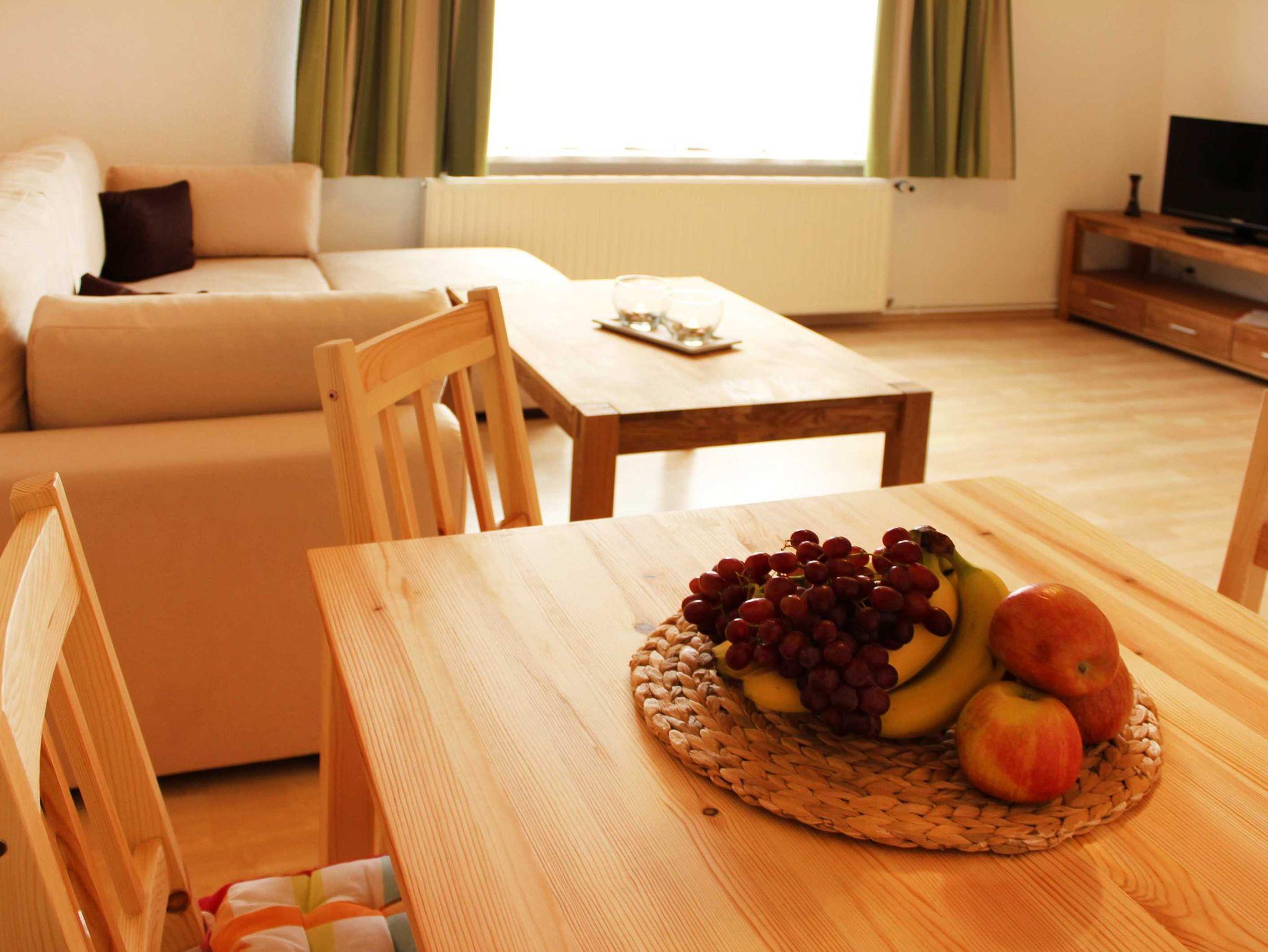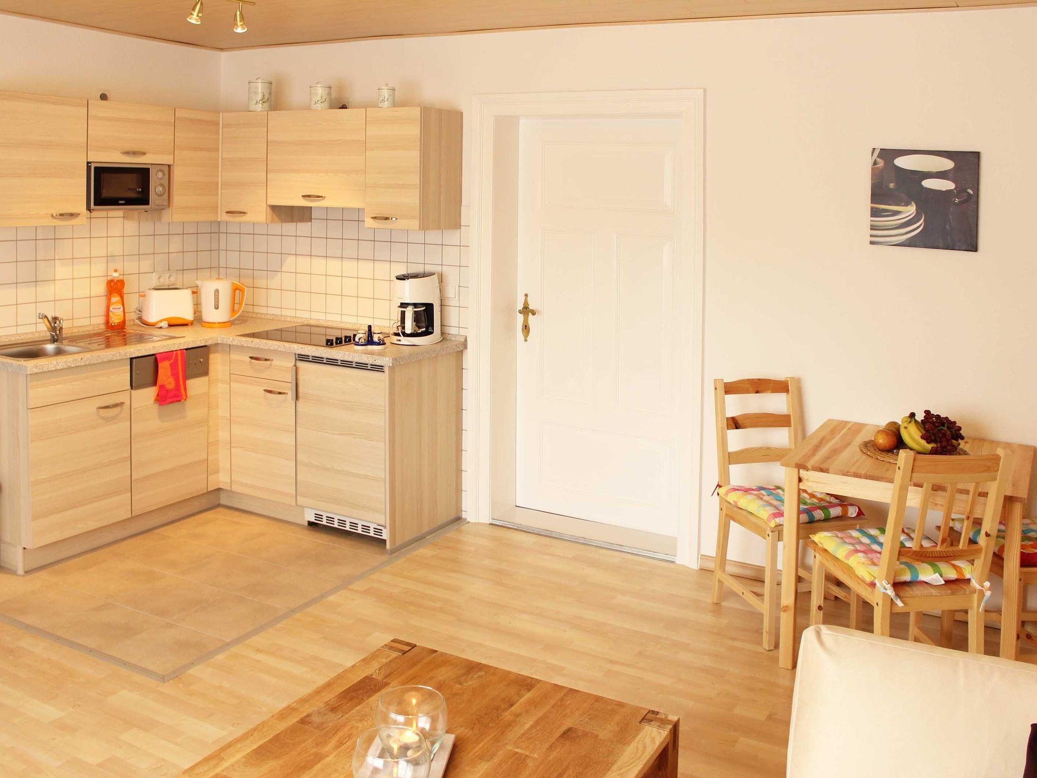 Die Wohnung ist weiterhin mit einer offenen Küche mit 4-Platten-Ceranherd, Spülmaschine, Kühlschrank mit Gefriermöglichkeit, Mikrowelle, Kaffeemaschine, Wasserkocher, Toaster und einem Esstisch ausgestattet. Die Erstausstattung Bettwäsche und Handtücher ist bereits im Gesamtpreis enthalten.