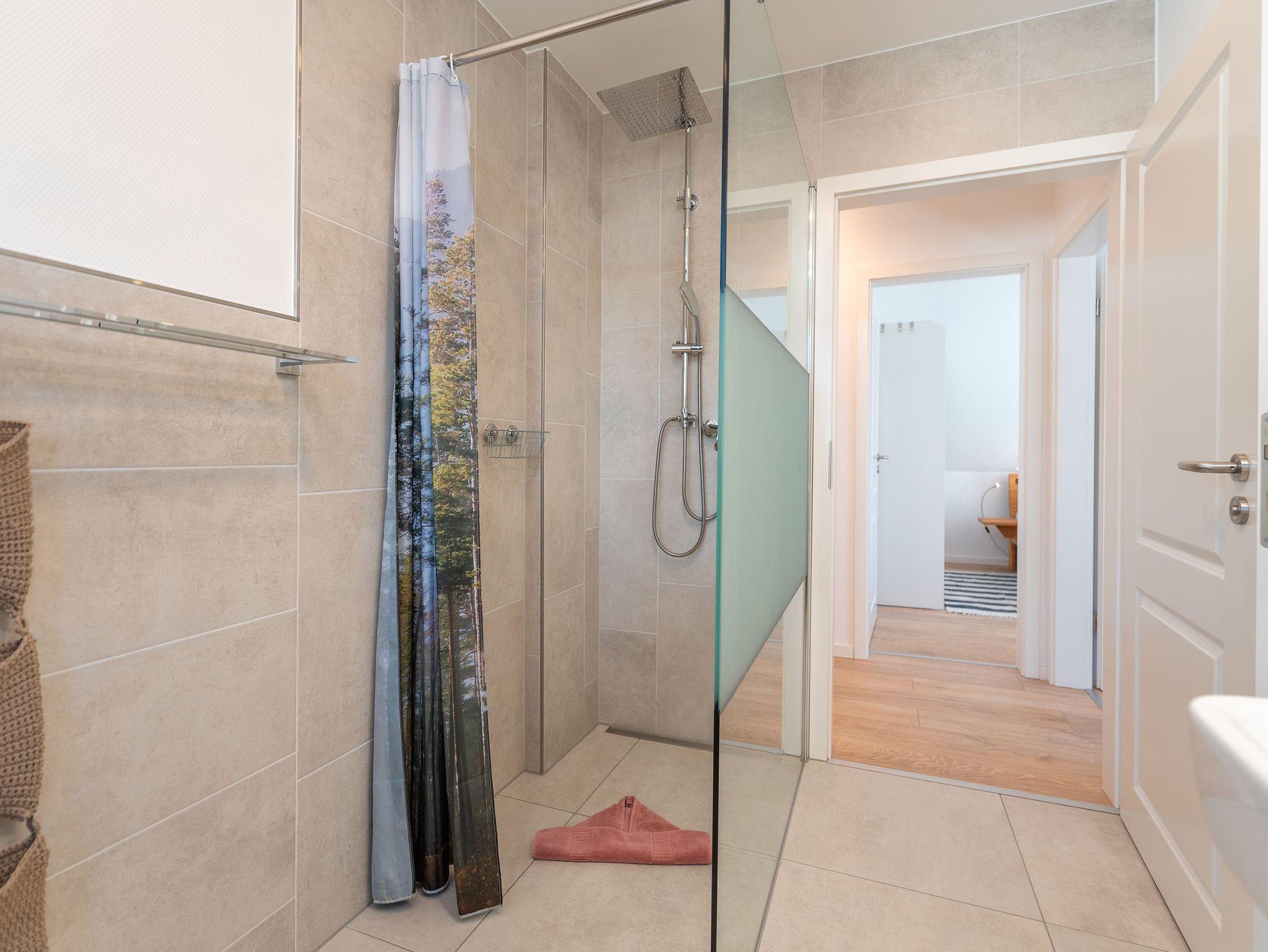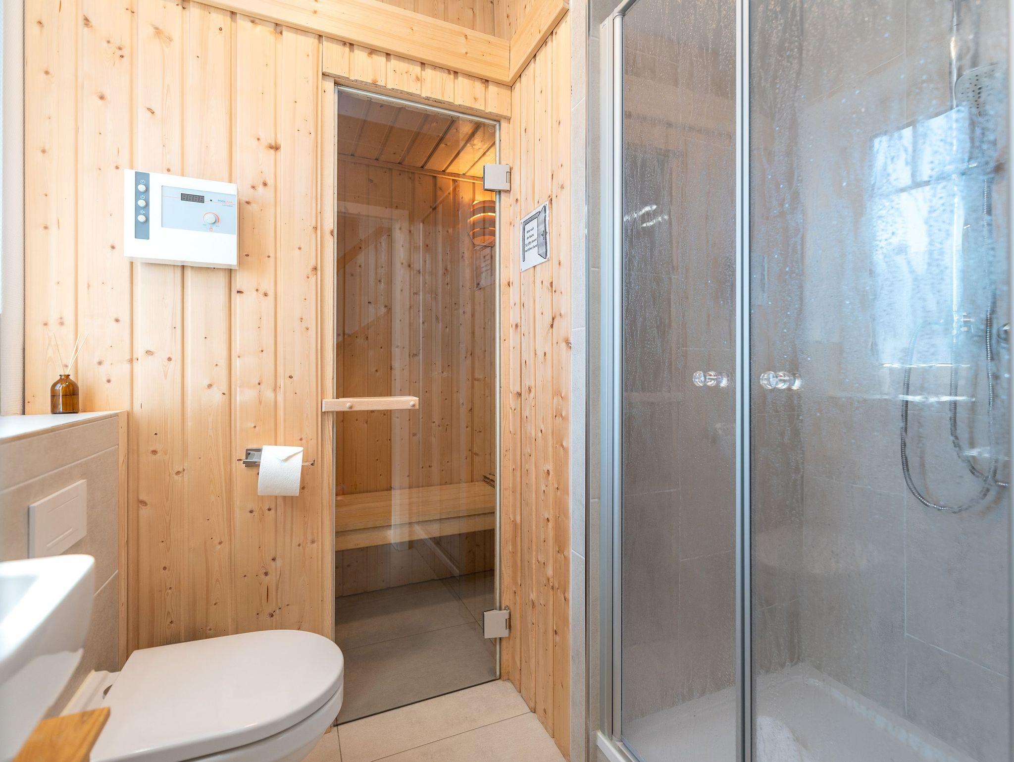 • Zwei Badezimmer, eines im Erdgeschoss mit Sauna, Dusche und WC, und ein weiteres im Obergeschoss mit einer begehbaren Regendusche, WC und Waschmaschine.