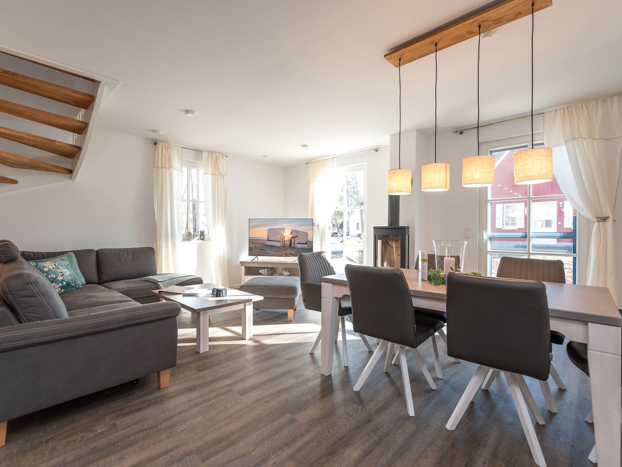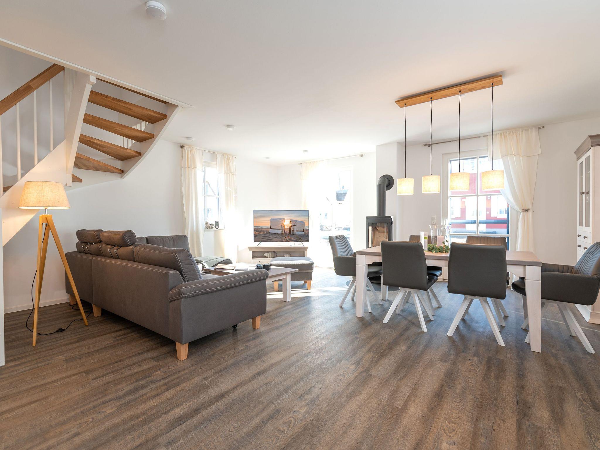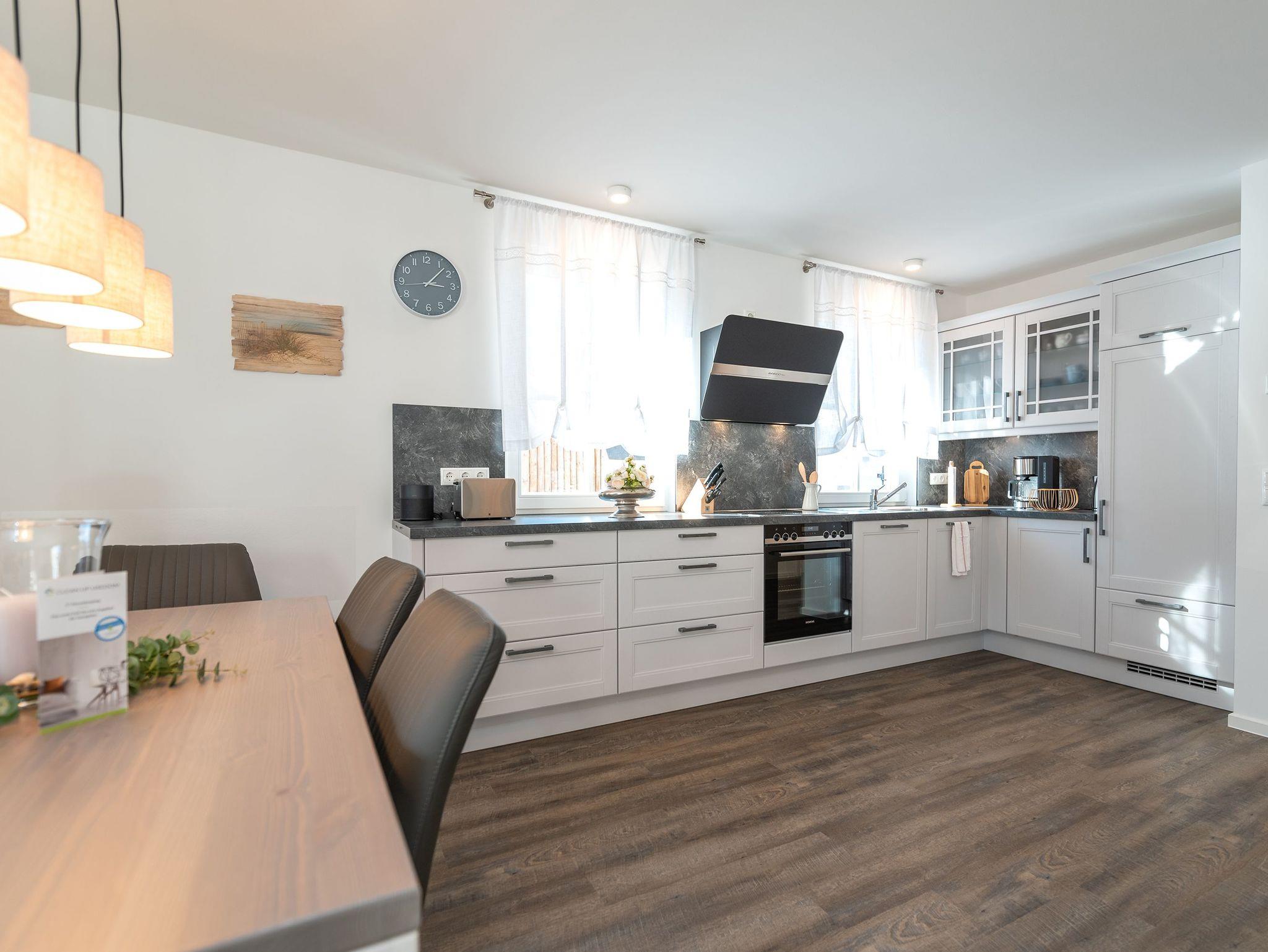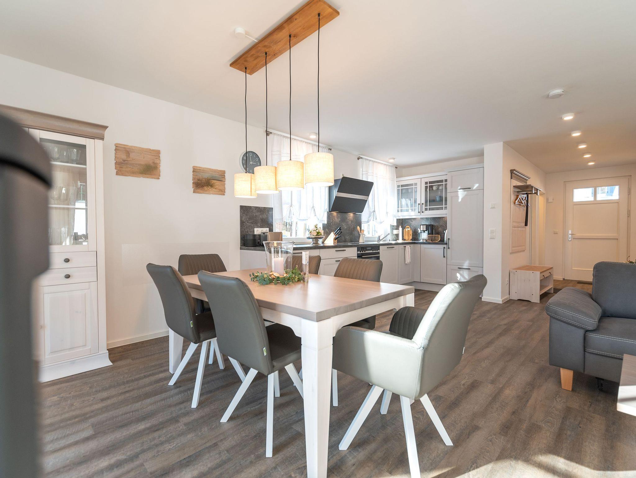 • Der Wohn-/Essbereich ist offen gestaltet und bietet neben einer voll ausgestatteten Küchenzeile einen einladenden Kaminofen, der für gemütliche Stunden sorgt.