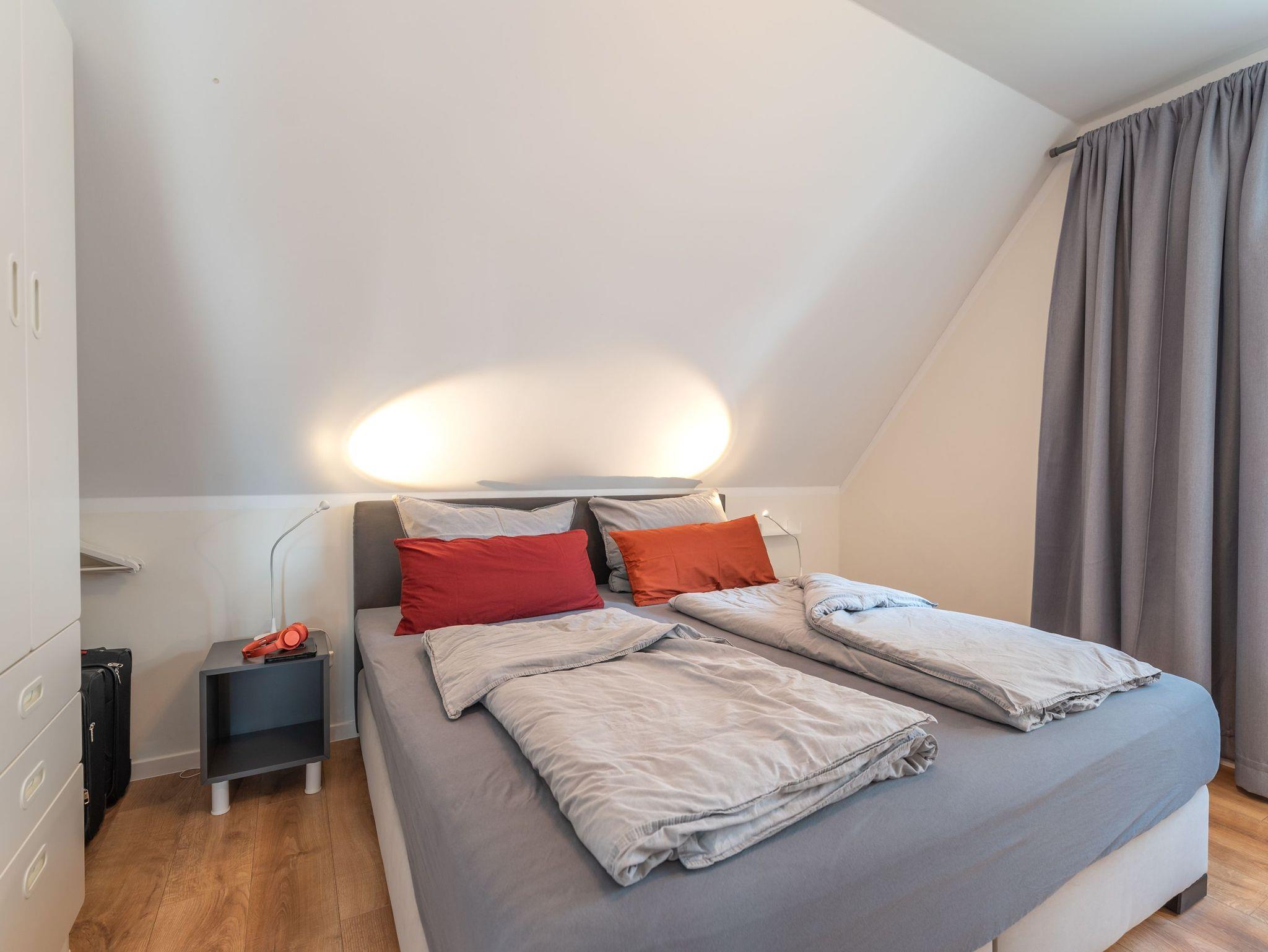 Im Obergeschoss befinden sich ein zweites Bad und zwei Schlafzimmer. Das eine ist mit einem bequemen Boxspringdoppelbett ausgestattet, in dem anderen stehen zwei Einzelboxspringbetten. Fu?r Ordnung sorgen Schränke mit viel Platz fu?r Ihre Urlaubsgarderobe. Kleinkinder bis zu 2 Jahren schlafen kostenfrei im Reisebett. Auch ein Kinderhochstuhl ist vorhanden.