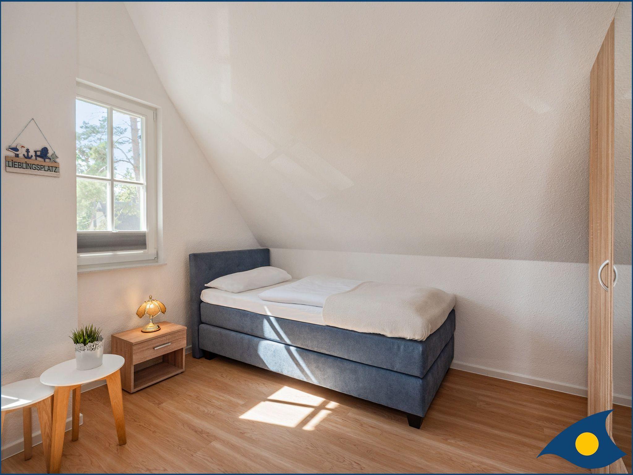 Das Obergeschoss ist aufgeteilt in zwei Schlafzimmer (eins mit Doppelbett und eins mit zwei Einzelbetten) sowie einem großzügigen Badezimmer mit Dusche und Badewanne.