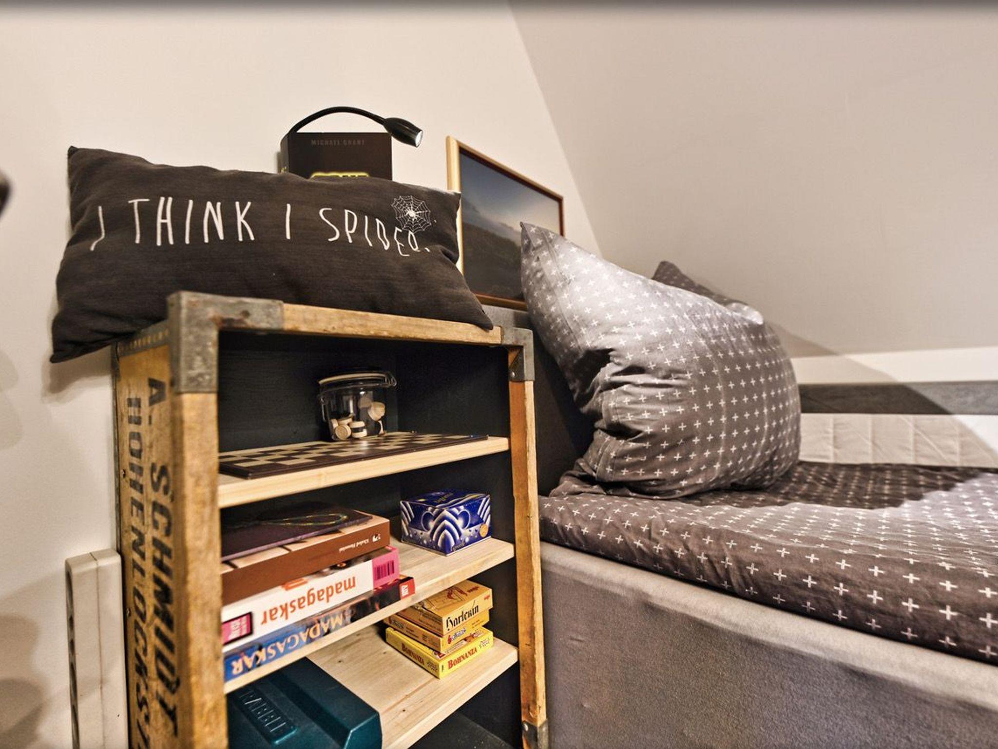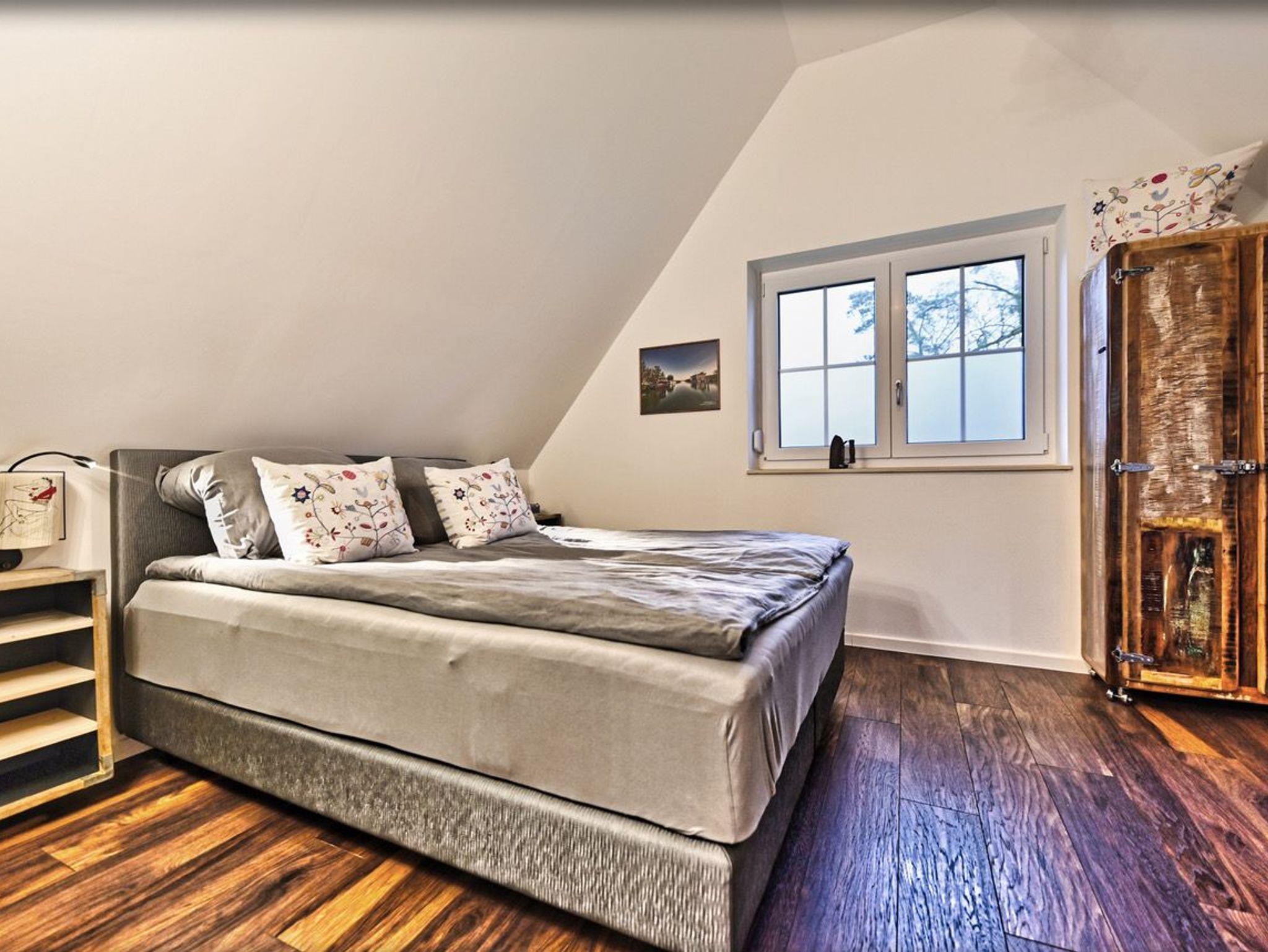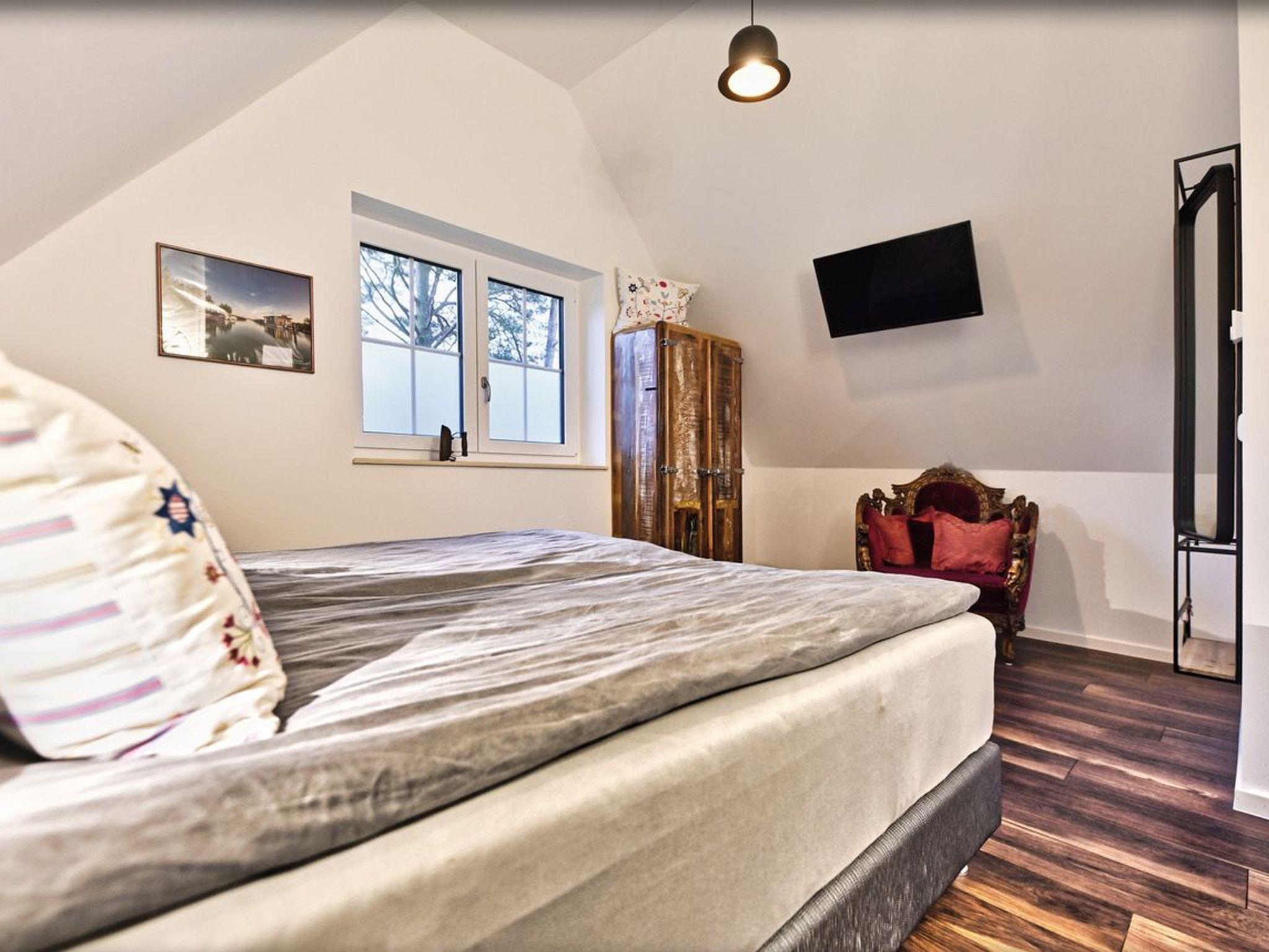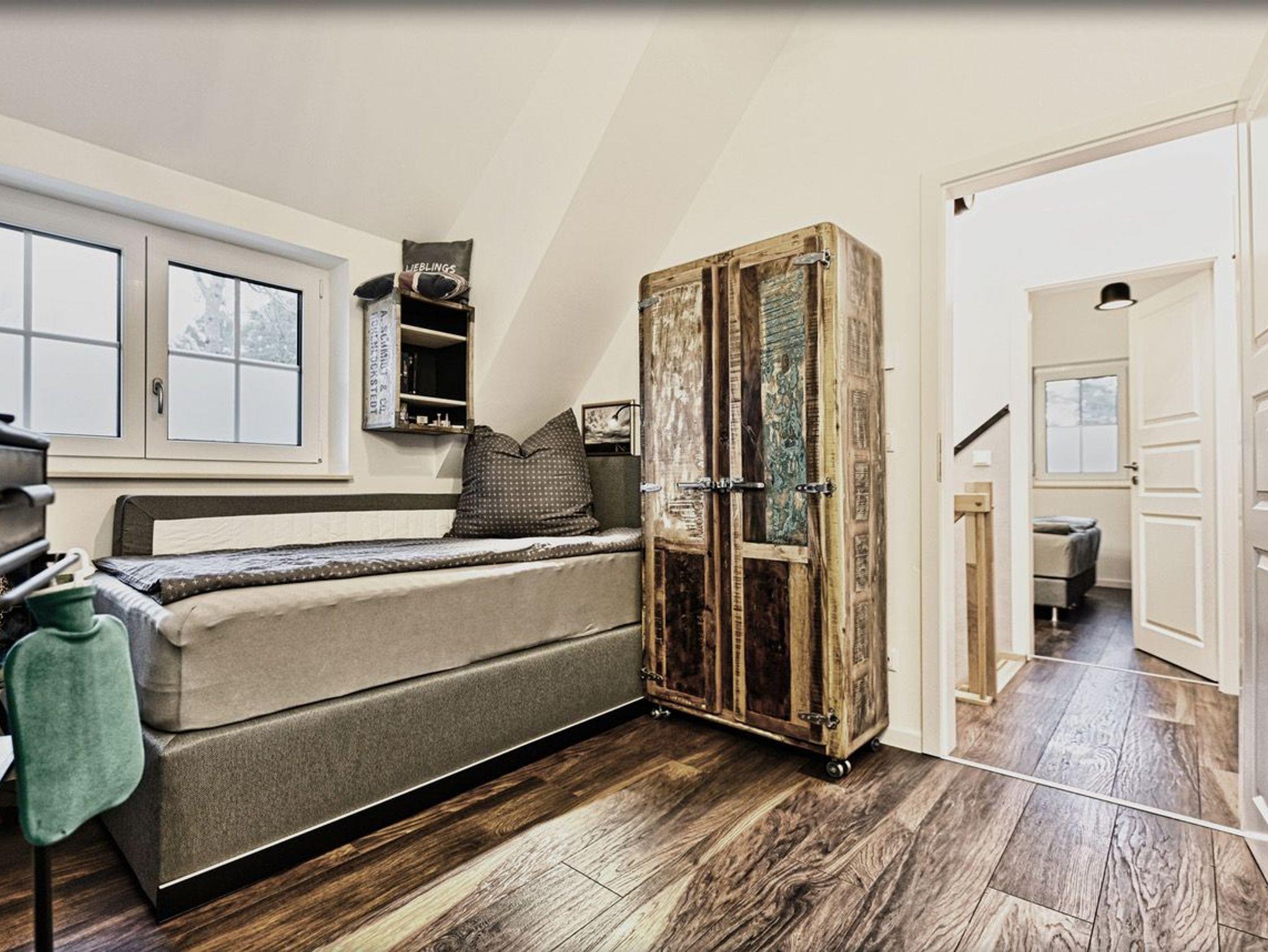 Im Obergeschoss empfängt Sie ein einladendes Schlafzimmer mit einem Doppelbett und einem urigen Kleiderschrank ausreichend Platz für Ihre Urlaubsgarderobe. Ein weiteres Schlafzimmer bietet zwei Einzelbetten mit unterschiedlichen Matratzenhärten, um Ihnen optimalen Schlafkomfort zu gewährleisten. Hier können Sie sich zurücklehnen, fernsehen oder in einem der zahlreichen Bücher schmökern. Dank Außenrollläden lassen sich alle Schlafzimmer komplett verdunkeln, sodass Sie in traumhafte Nächte eintauchen können. Ein modernes Badezimmer mit Badewanne rundet das obere Stockwerk ab.