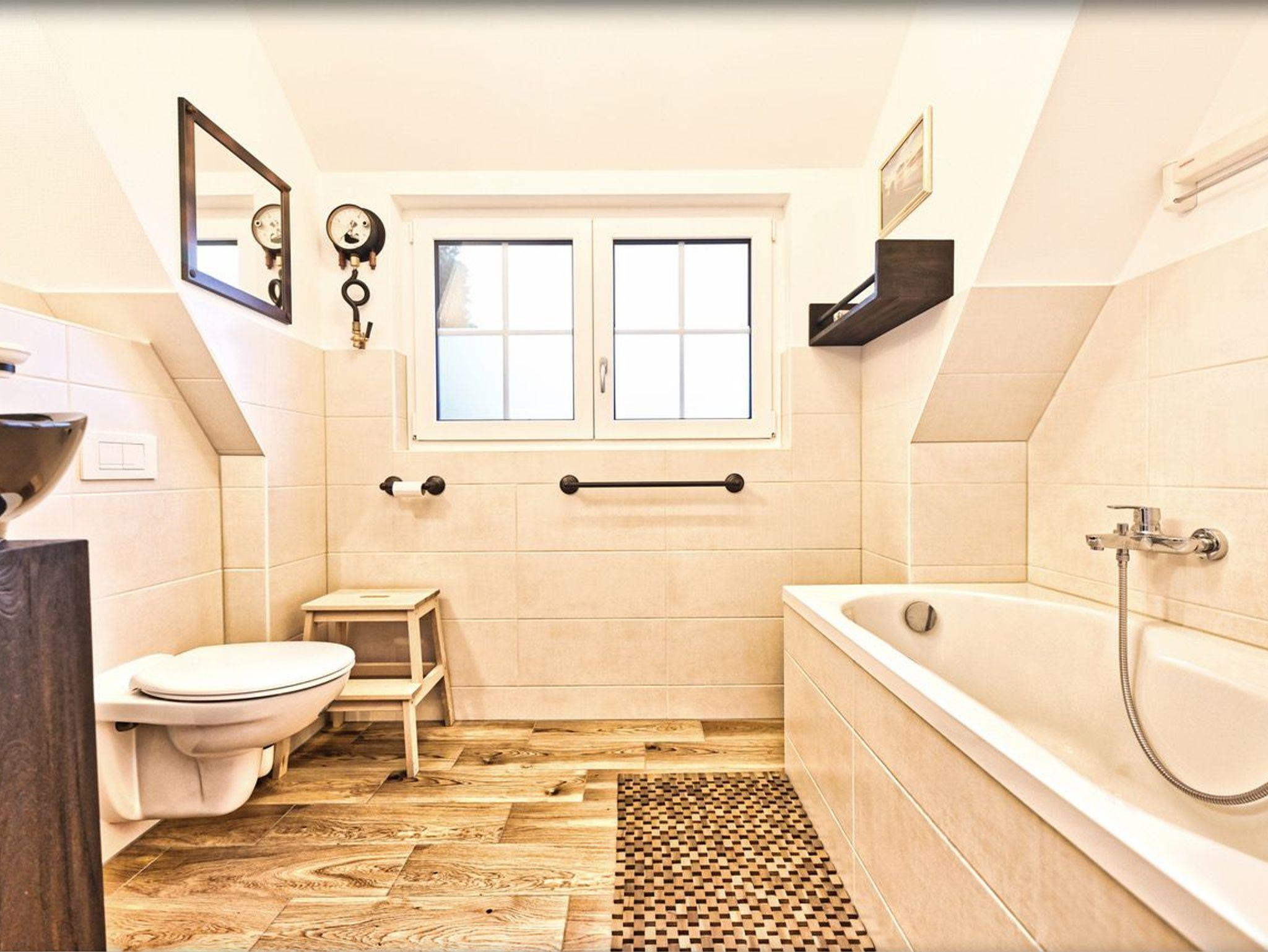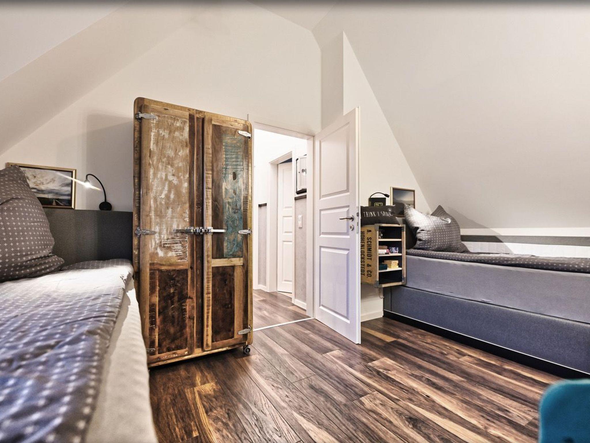 Im Obergeschoss empfängt Sie ein einladendes Schlafzimmer mit einem Doppelbett und einem urigen Kleiderschrank ? ausreichend Platz für Ihre Urlaubsgarderobe. Ein weiteres Schlafzimmer bietet zwei Einzelbetten mit unterschiedlichen Matratzenhärten, um Ihnen optimalen Schlafkomfort zu gewährleisten. Hier können Sie sich zurücklehnen, fernsehen oder in einem der zahlreichen Bücher schmökern. Dank Außenrollläden lassen sich alle Schlafzimmer komplett verdunkeln, sodass Sie in traumhafte Nächte eintauchen können. Ein modernes Badezimmer mit Badewanne rundet das obere Stockwerk ab.
