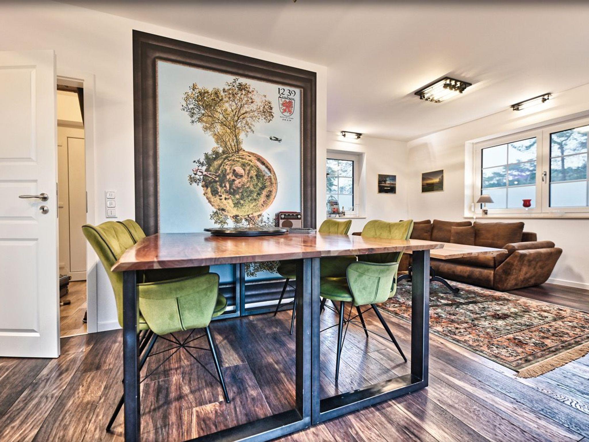 Das Erdgeschoss besticht durch einen offenen, lichtdurchfluteten Wohn- und Essbereich. Auf der gemütlichen Couch können Sie sich entspannen, während ein großer Smart-TV für Unterhaltung sorgt. Die angrenzende, voll ausgestattete Küche mit modernsten Geräten lässt kulinarische Herzen höher schlagen. Ein zusätzliches Badezimmer mit Dusche und Waschmaschine steht ebenfalls zu Ihrer Verfügung.