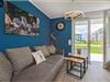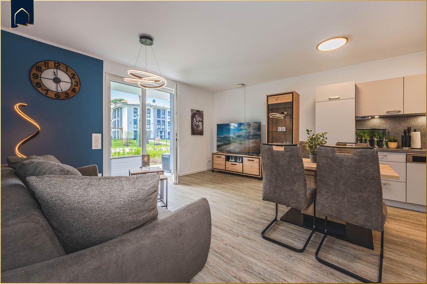Das lichtdurchflutete Wohnzimmer mit gemütlicher Sofaecke, Flachbild-TV und Zugang zur Terrasse lädt zum Verweilen ein. Die offene Küche ist voll ausgestattet – inklusive Backofen, Herd, Spülmaschine, Kühlschrank mit Gefrierfach sowie Kaffeemaschine, Toaster und Wasserkocher. Ein separates Schlafzimmer mit komfortablem Doppelbett bietet Platz für erholsame Nächte, während weitere Schlafmöglichkeiten im Wohnbereich zur Verfügung stehen. Das moderne Bad verfügt über eine bodengleiche Dusche, WC und stilvolle Details.