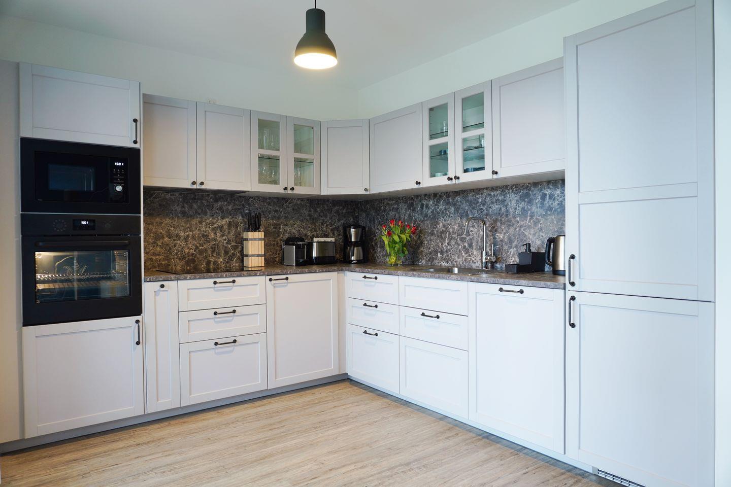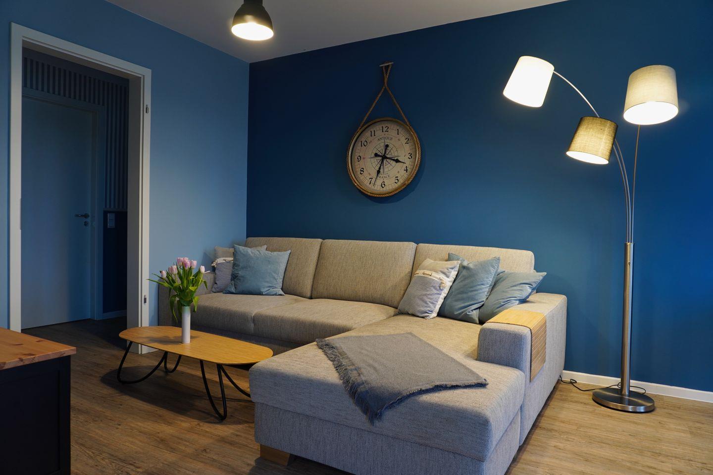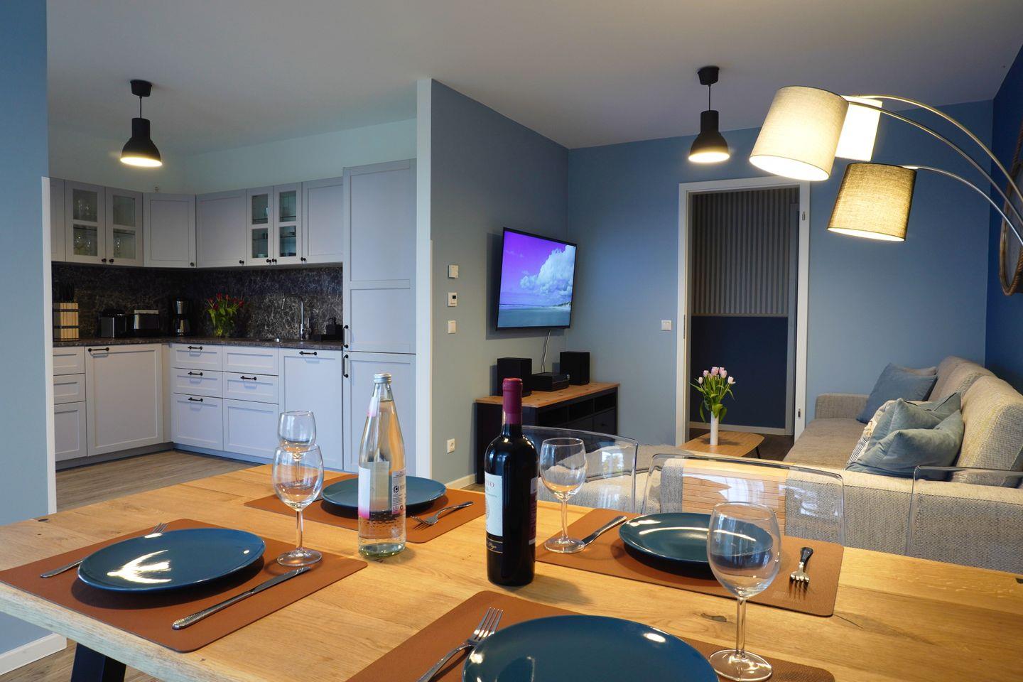Herzlich willkommen im Apartment "Vinetariff". Auf einer Wohnfläche von 96 m² haben Sie in dieser modern eingerichteten Ferienwohnung ausreichend Platz für einen entspannten Urlaub am Stettiner Haff auf Usedom. Der offen gestaltete Wohnbereich ist mit einem ausziehbaren Eck-Sofa sowie modernem Smart-TV ausgestattet. Sie haben vom Wohnzimmer aus Zugang zum Balkon. Der möblierte Balkon mit traumhaften Ausblicken auf das Stettiner Haff bietet einen wunderschönen Ort, um Ihre Mahlzeiten zu genießen und die Aussicht zu bewundern. Die großzügig gestaltete Küchenzeile verfügt über hochwertige Geräte wie Herd, Backofen, Mikrowelle, Kühl- und Gefrierschrank, Kaffeemaschine, Kapselmaschine sowie Spülmaschine. Ausreichend Geschirr, Besteck sowie Töpfe und Pfannen befinden sich in den Schränken.