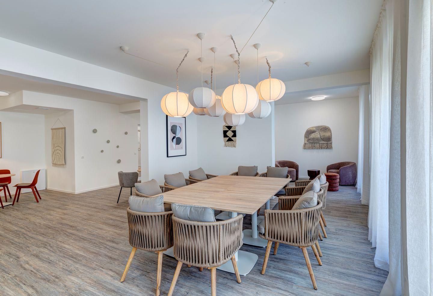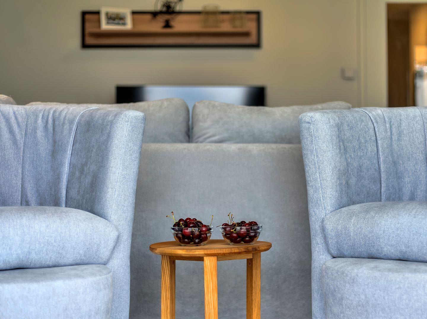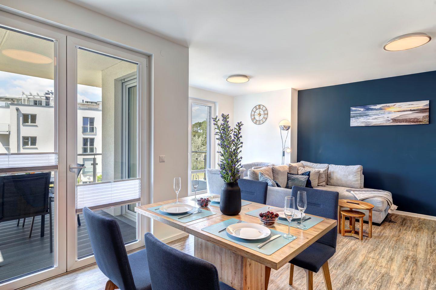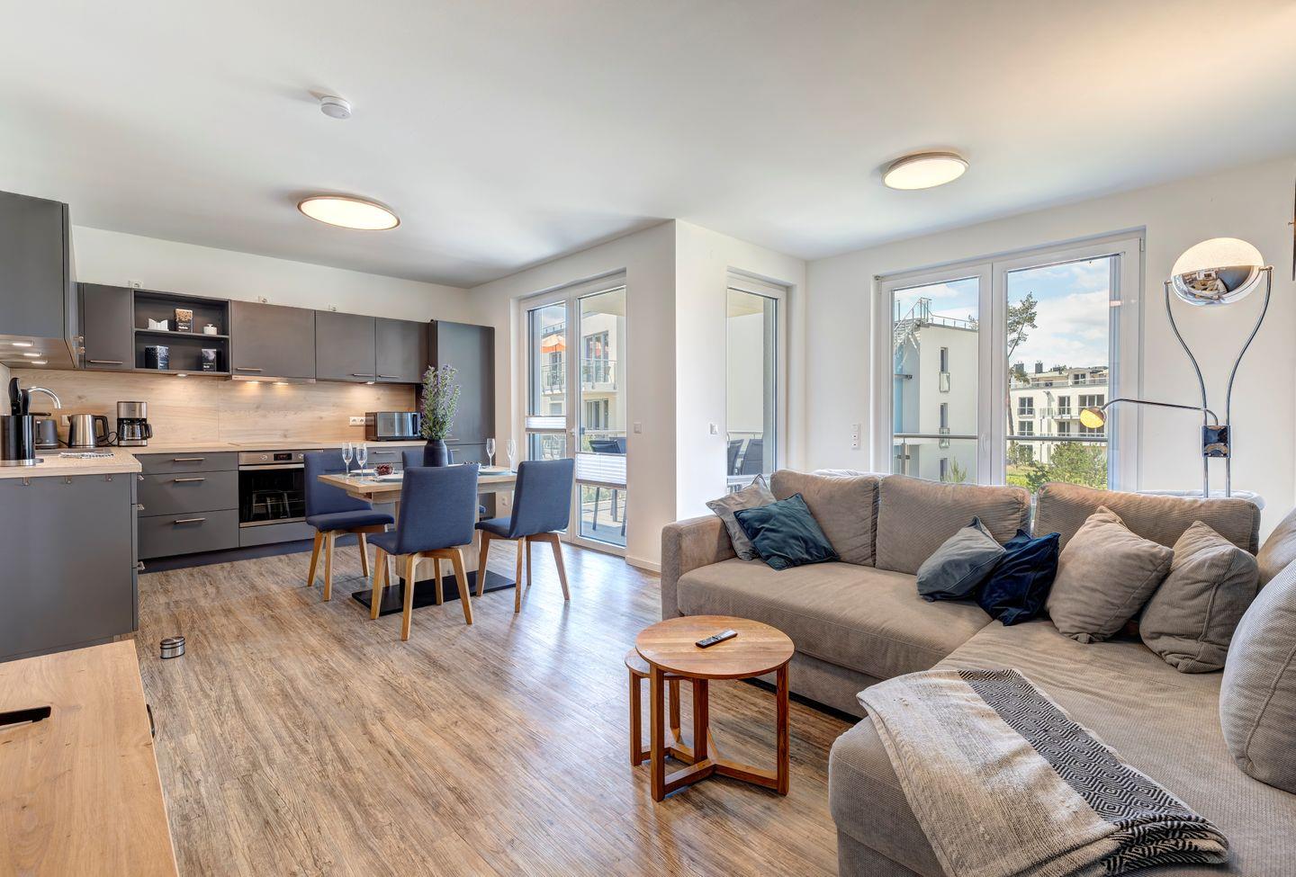 Die Ferienwohnung erstreckt sich über 81 Quadratmeter und bietet Platz für bis zu sechs Gäste. Beim Betreten der Wohnung werden Sie von einer behaglichen Atmosphäre begrüßt, die von natürlichen Holzelementen und warmen Farbtönen geprägt ist. Das Wohnzimmer ist ein einladender Rückzugsort mit bequemen Sitzgelegenheiten und großen Fenstern, die den Wald- und Haffblick in den Raum holen.