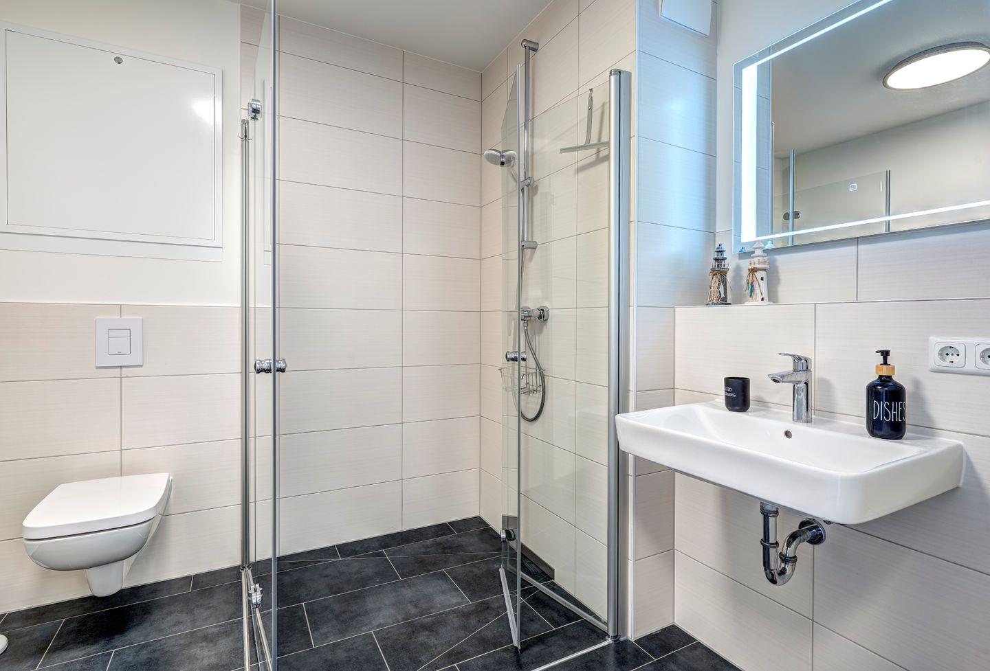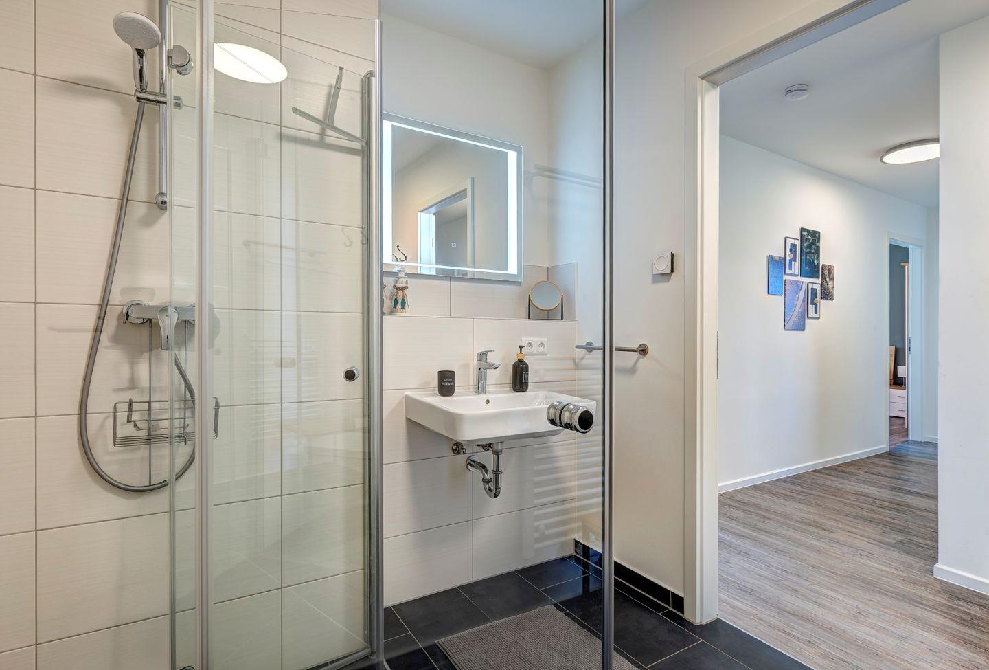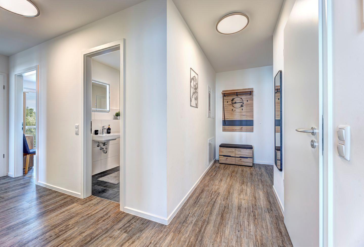 Die Ferienwohnung erstreckt sich über 81 Quadratmeter und bietet Platz für bis zu sechs Gäste. Das Wohnzimmer ist ein Rückzugsort mit bequemer Sofaecke und großen Fenstern. Die voll ausgestattete Küche ermöglicht Ihnen, kulinarische Köstlichkeiten zuzubereiten. Die Schlafzimmer sind ein Ort der Ruhe und der Entspannung. Das komfortable Boxspringbett verspricht erholsame Nächte. Die beiden Badezimmer sind modern gestaltet, mit einer geräumigen Dusche.