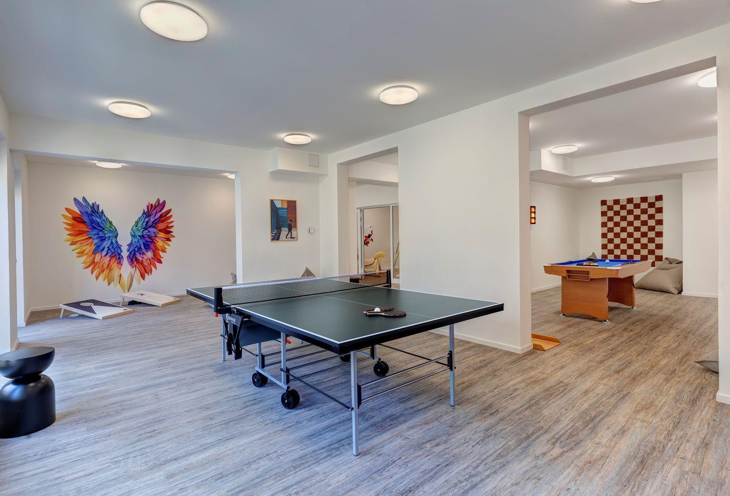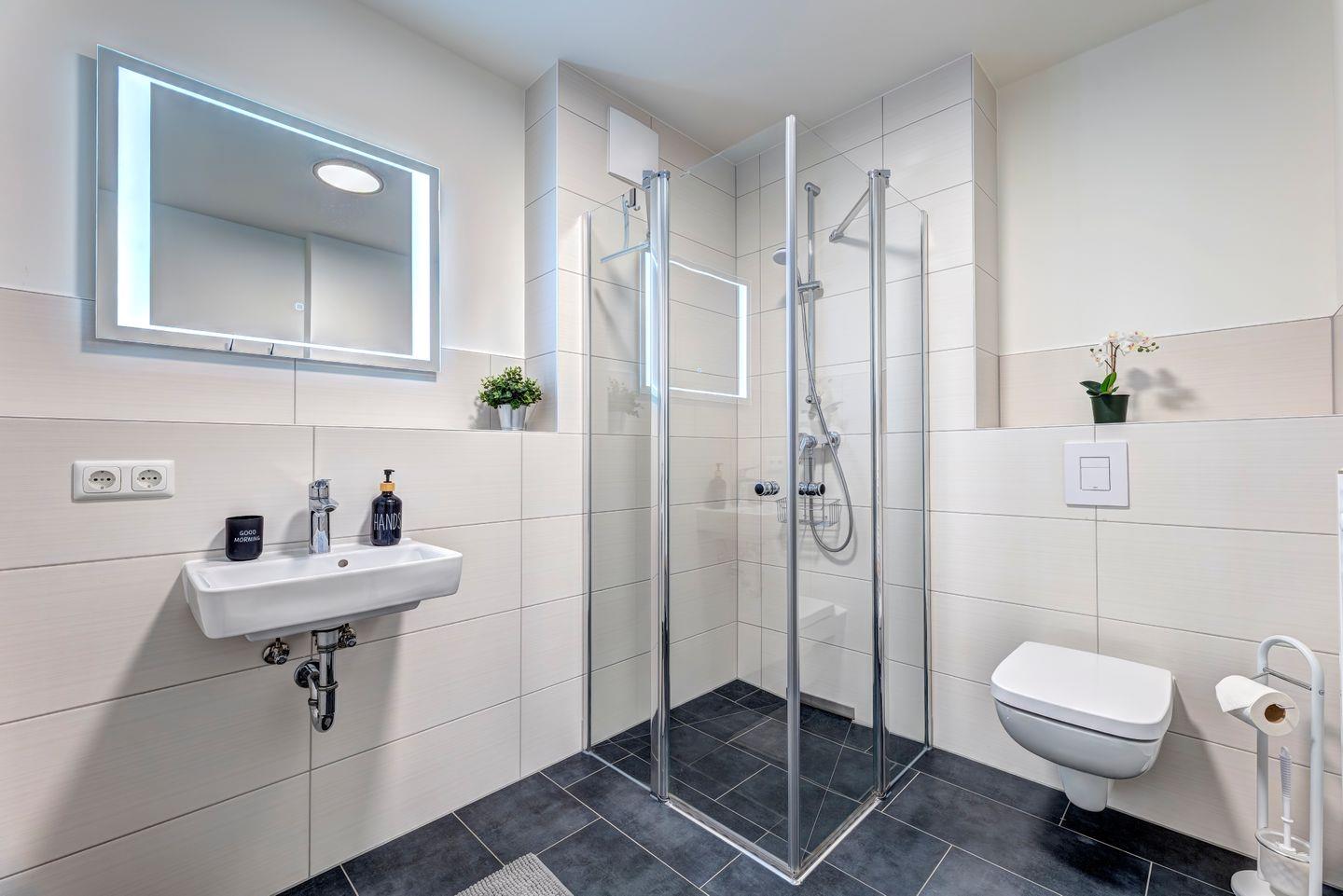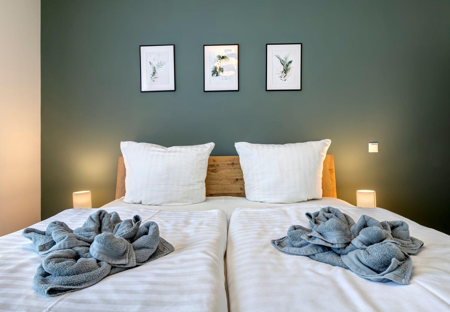 Die Ferienwohnung erstreckt sich über 81 Quadratmeter und bietet Platz für bis zu sechs Gäste. Das Wohnzimmer ist ein Rückzugsort mit bequemer Sofaecke und großen Fenstern. Die voll ausgestattete Küche ermöglicht Ihnen, kulinarische Köstlichkeiten zuzubereiten. Die Schlafzimmer sind ein Ort der Ruhe und der Entspannung. Das komfortable Boxspringbett verspricht erholsame Nächte. Die beiden Badezimmer sind modern gestaltet, mit einer geräumigen Dusche.