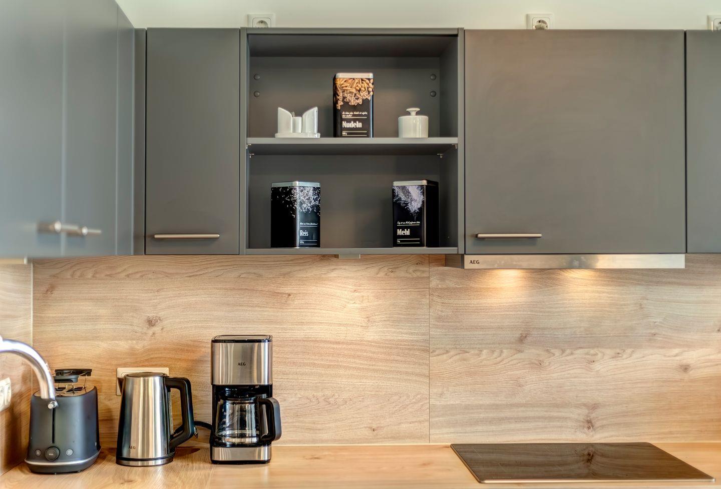 Die voll ausgestattete Küche ermöglicht Ihnen, kulinarische Köstlichkeiten zuzubereiten, die Sie dann auf dem sonnigen Balkon genießen können. Der Ausblick auf das glitzernde Haff ist zu jeder Tageszeit ein Genuss. Hier können Sie morgens Ihren Kaffee trinken oder abends bei einem Glas Wein die Stille des Waldes genießen.