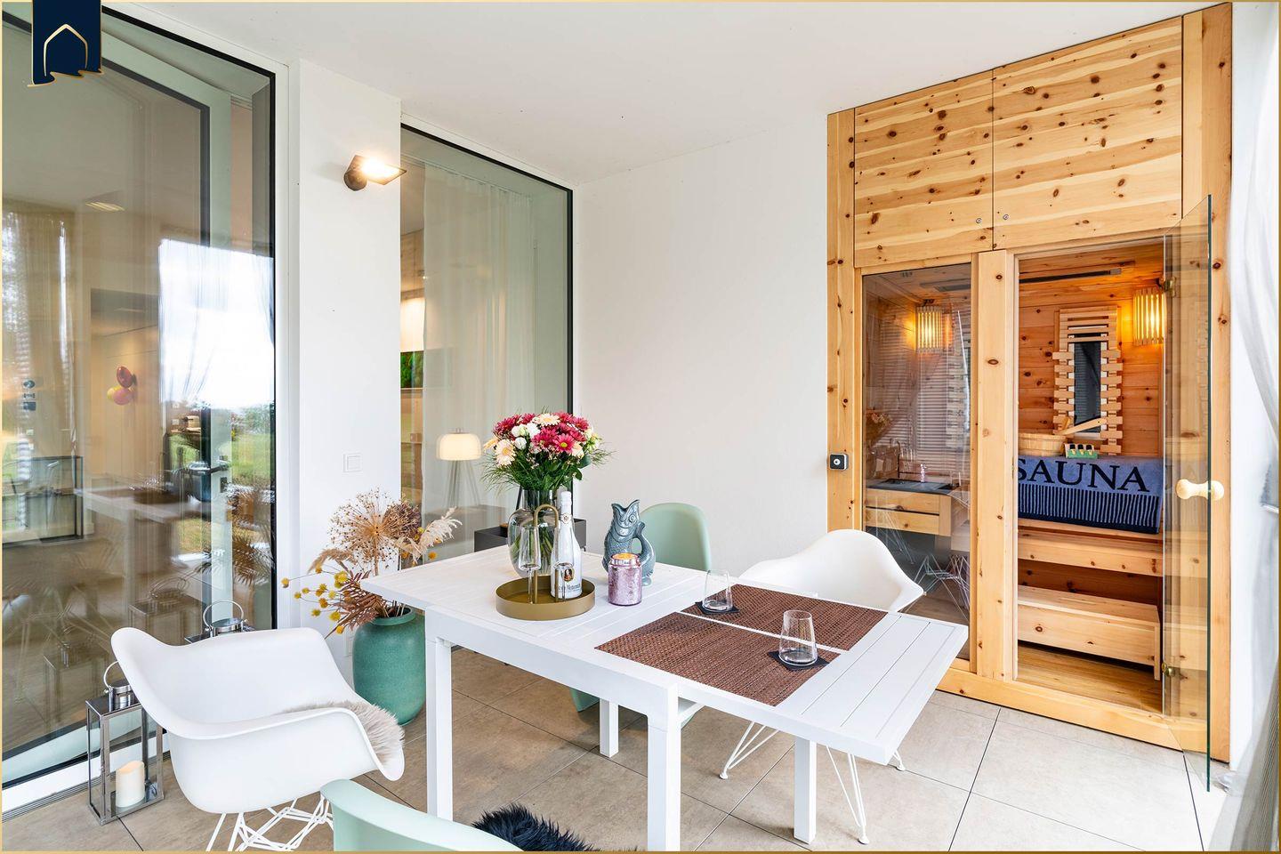 Die moderne Küche ist mit allen Geräten und Utensilien ausgestattet, die Sie für Ihre Selbstverpflegung benötigen – inklusive Backofen, Geschirrspüler, Kaffeemaschine, Espressomaschine und Gefrierfach. Im großzügigen Essbereich genießen Sie gemeinsame Mahlzeiten, während das Wohnzimmer mit Sofa, TV und Gesellschaftsspielen zu gemütlichen Abenden einlädt. Für Workation-Gäste steht ein eigener Schreibtisch zur Verfügung. Die Ferienwohnung ist vollständig klimatisiert und mit Fußbodenheizung ausgestattet, was auch in der kühleren Jahreszeit für ein angenehmes Raumklima sorgt.
