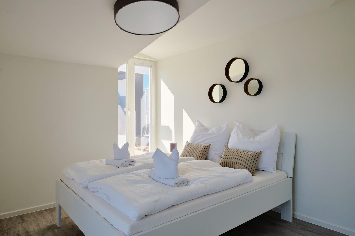 Im oberen Stockwerk befinden sich zwei stilvolle Schlafzimmer mit Doppelbetten und großen Fenstern, die den Blick auf den Wald und das Haff freigeben.