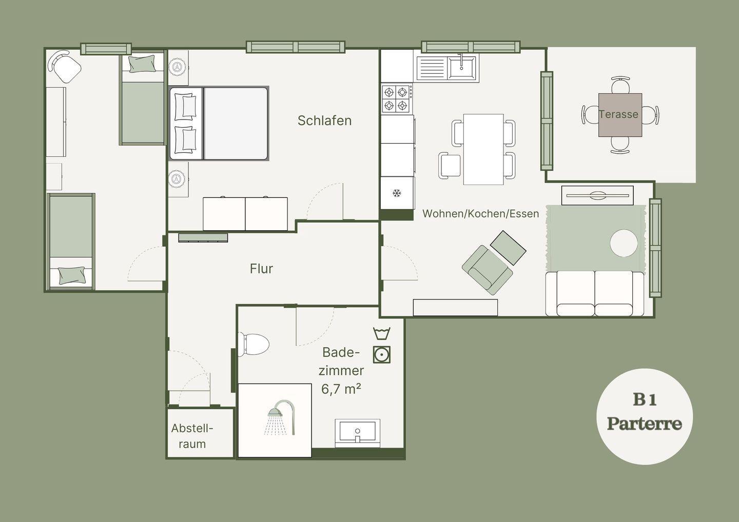 Unser **kinder- und fahrradfreundliches Apartment B1** mit 74 m² ist der perfekte Ort für Familien. Es bietet Platz für bis zu sechs Personen und wurde speziell für einen entspannten Aufenthalt mit Kindern gestaltet. Das separate Kinderzimmer verfügt über bodentiefe Einzelbetten, die den Kleinen einen sicheren Schlafplatz bieten. Im Elternschlafzimmer können Sie sich nach einem aktiven Tag entspannen, während der Wohnbereich mit Schlafsofa und direktem Zugang zur Terrasse auch für gemeinsames Zusammensitzen und Spielen geeignet ist.