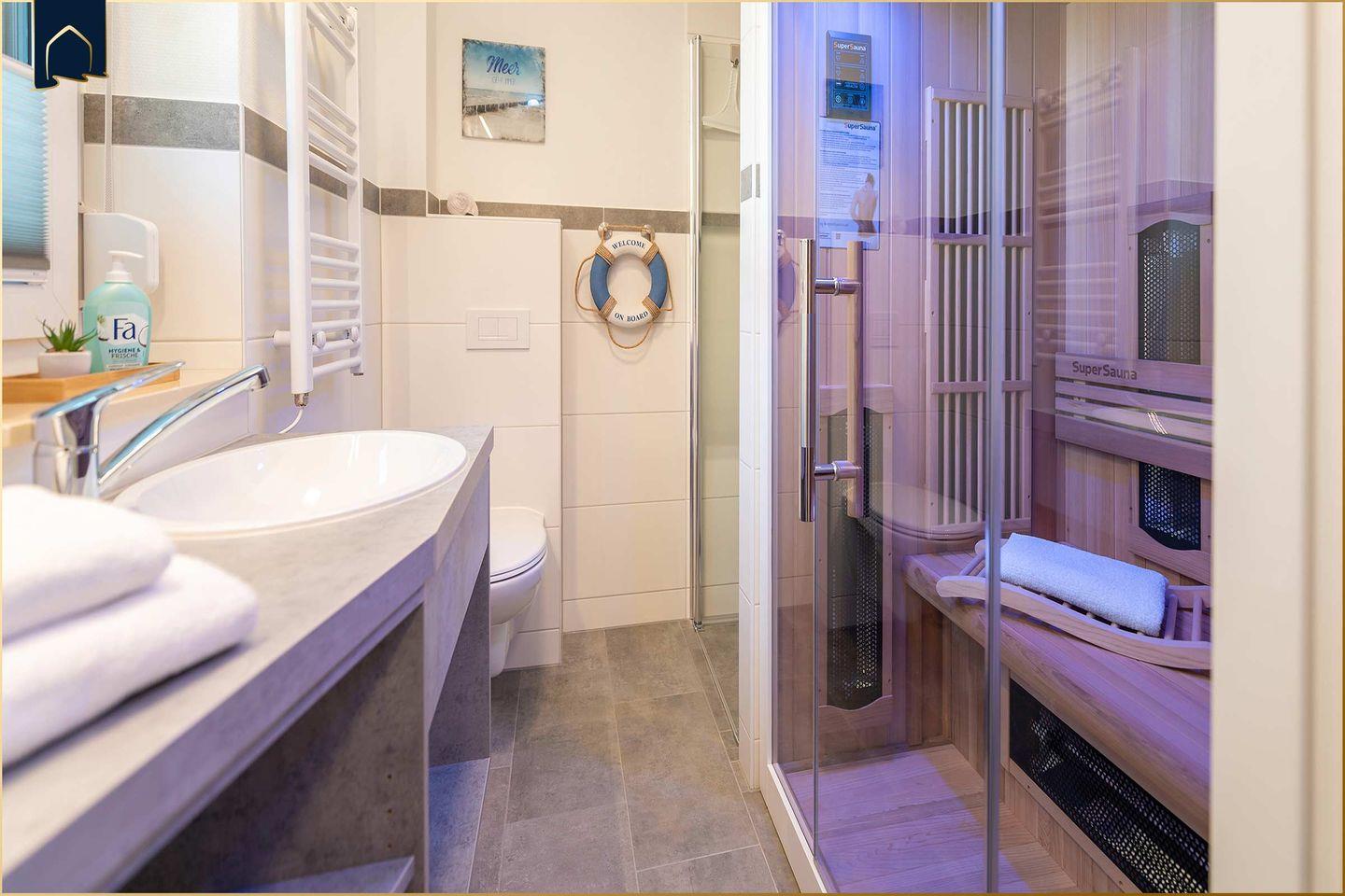 Im lichtdurchfluteten Wohnbereich lädt eine gemütliche Sofaecke mit TV zum Verweilen ein. Ein Kamin sorgt an kühleren Tagen für eine behagliche Atmosphäre. Für Wellness-Momente steht Ihnen eine private Infrarotkabine zur Verfügung – perfekt, um nach einem Ausflug zu entspannen. Die offene Küche ist komplett ausgestattet mit Backofen, Herd, Geschirrspüler, Kühlschrank, Gefrierfach, Mikrowelle, Kaffeemaschine und Toaster. Am großen Esstisch findet die ganze Familie Platz für gemeinsame Mahlzeiten.