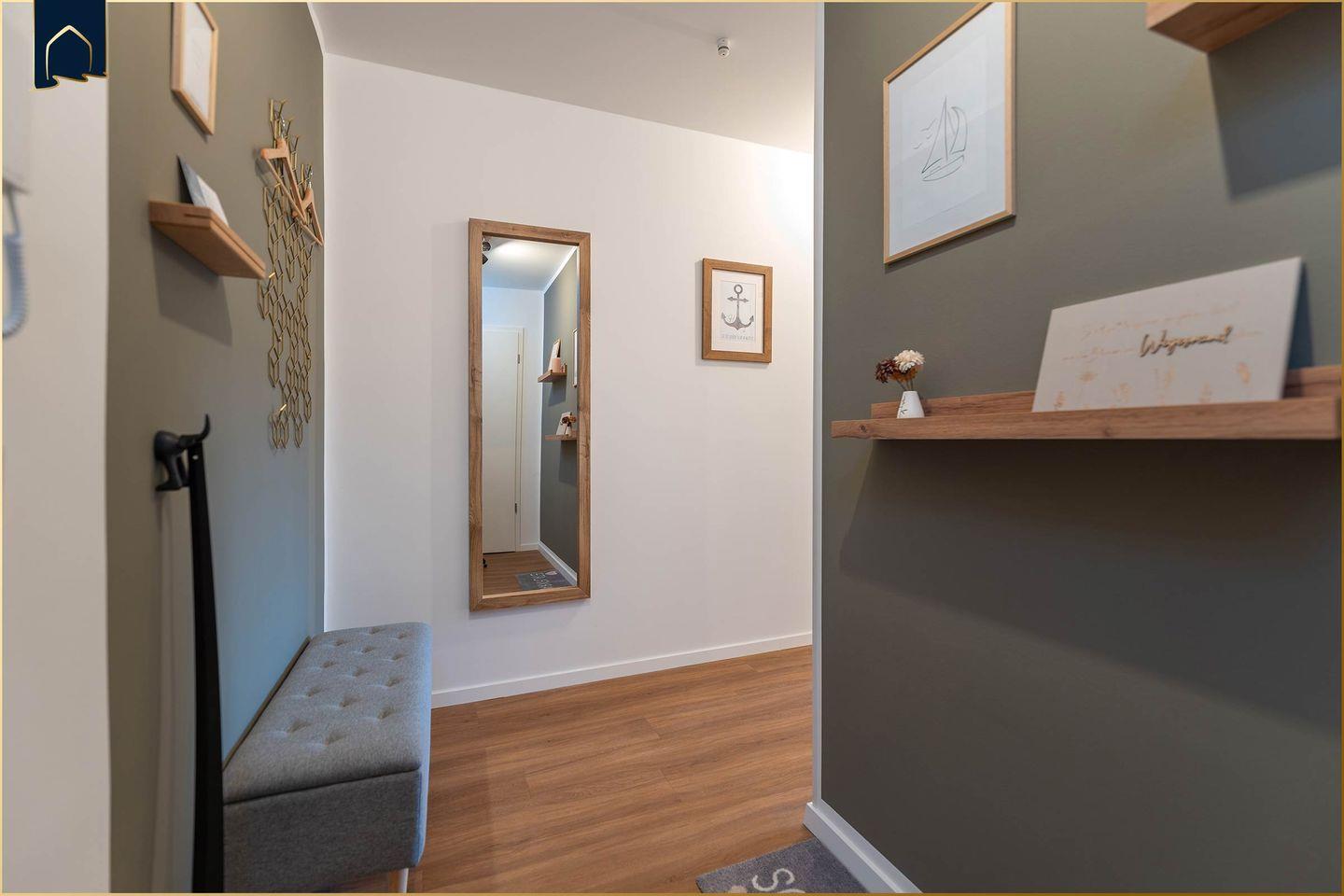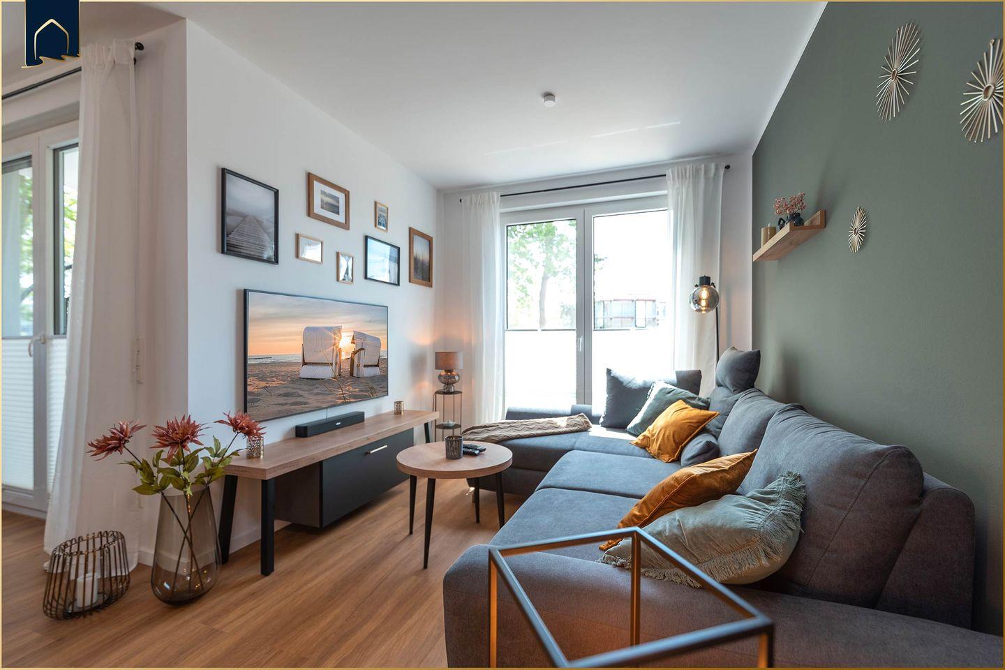 Die stilvolle Ferienwohnung „Haffhafen“ befindet sich in Zirchow/Garz, ganz in der Nähe des malerischen Stettiner Haffs. Sie liegt im 1. Stock eines modernen Hauses mit Aufzug und bietet auf 65 m² Platz für bis zu 4 Personen. Die Wohnung ist offen und hell gestaltet, ideal für Paare, kleine Familien oder auch einen Workation-Aufenthalt. Ein separates Schlafzimmer sorgt für erholsamen Schlaf, während der offene Wohnbereich mit Sofa, Esstisch und großem Smart-TV zum Verweilen einlädt.