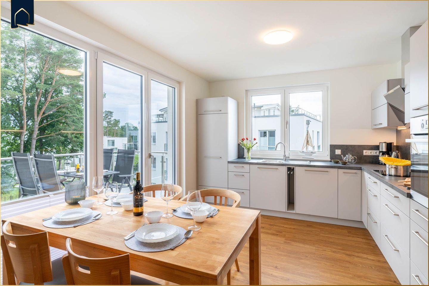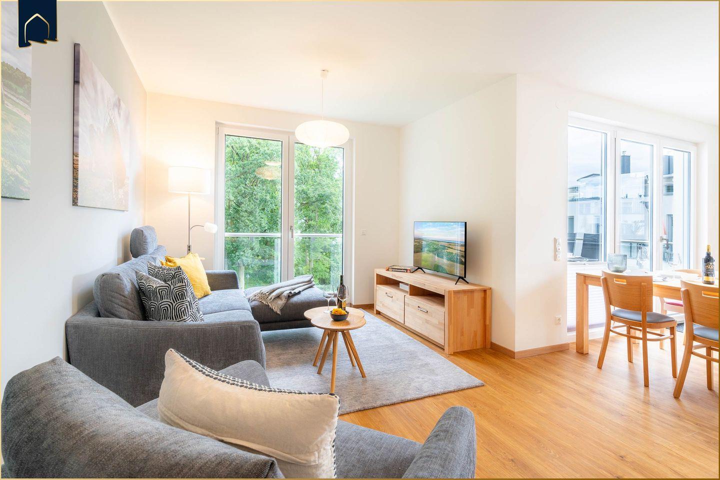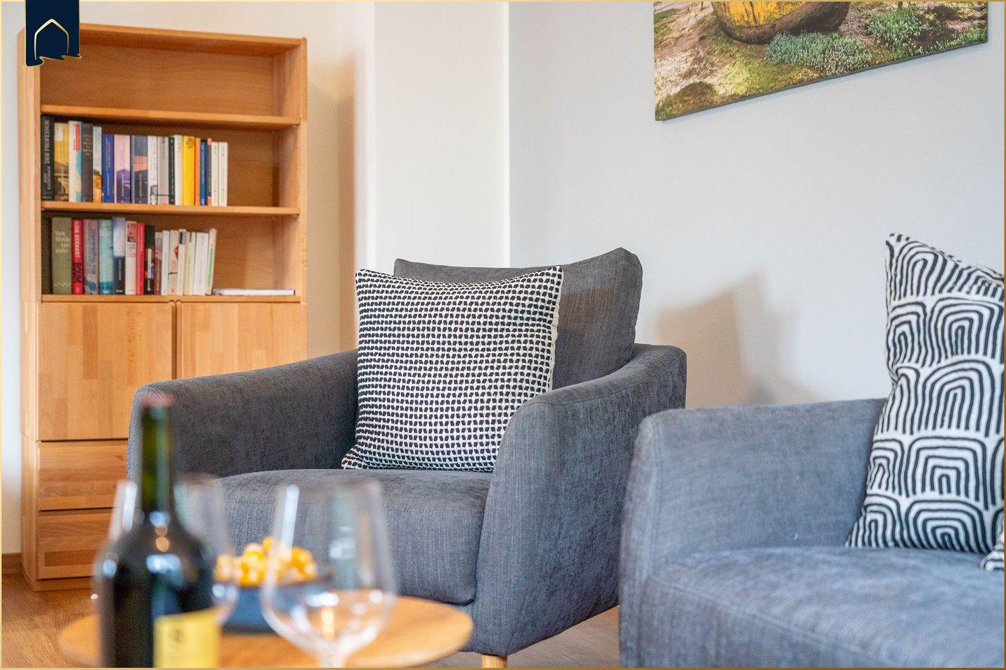 Die Wohnung überzeugt mit 2 separaten Schlafzimmern, einem hellen Wohnbereich mit Sofaecke, TV und einem offenen Essbereich. Die offene Küche lässt mit Backofen, Spülmaschine, Kühlschrank, Kaffeemaschine, Toaster, Wasserkocher und kompletter Ausstattung keine Wünsche offen. Zwei moderne Badezimmer mit bodengleichen Duschen, Fußbodenheizung und WLAN sorgen für zusätzlichen Komfort. Ein echtes Highlight ist die Sauna im Dachgeschoss – perfekt zum Entspannen nach einem Tag am Meer oder einer Wanderung. Im Keller des Hauses finden Sie zudem einen großzügigen Freizeit- und Fitnessraum mit Tischtennisplatte, Kicker, Darts und vielem mehr – ideal für Groß und Klein.
