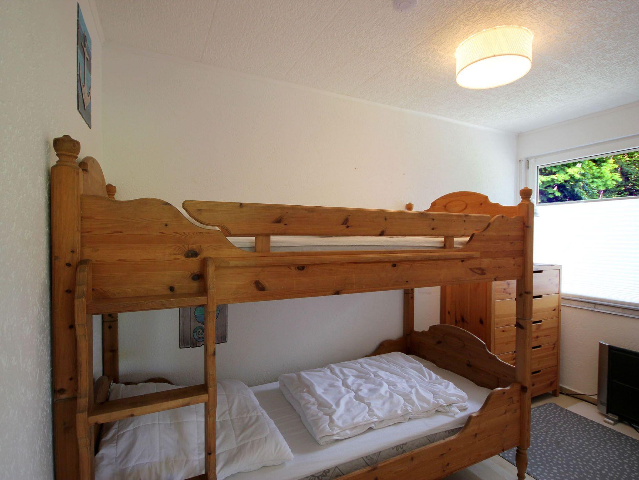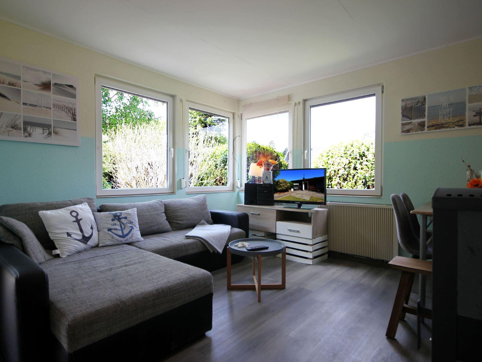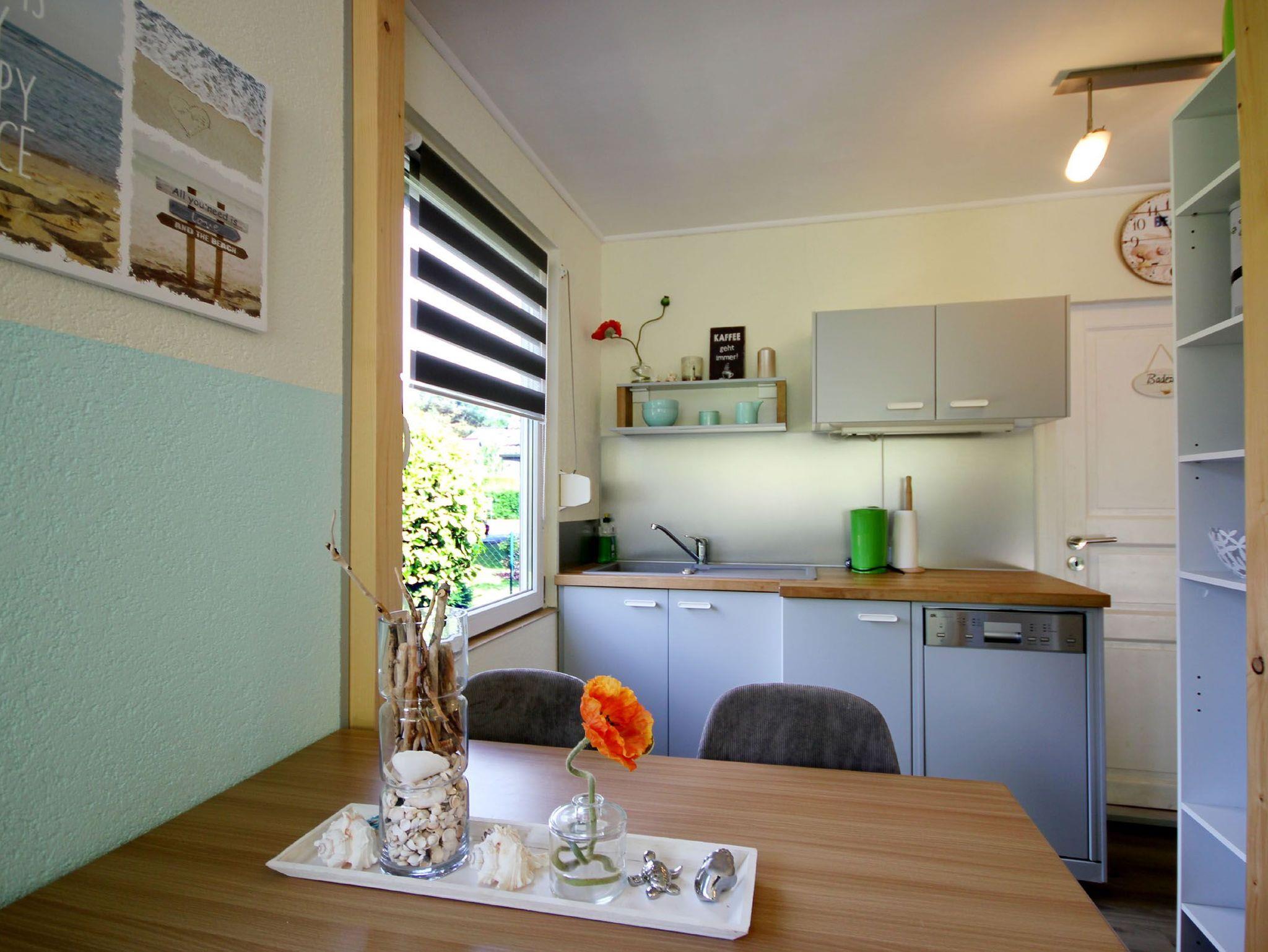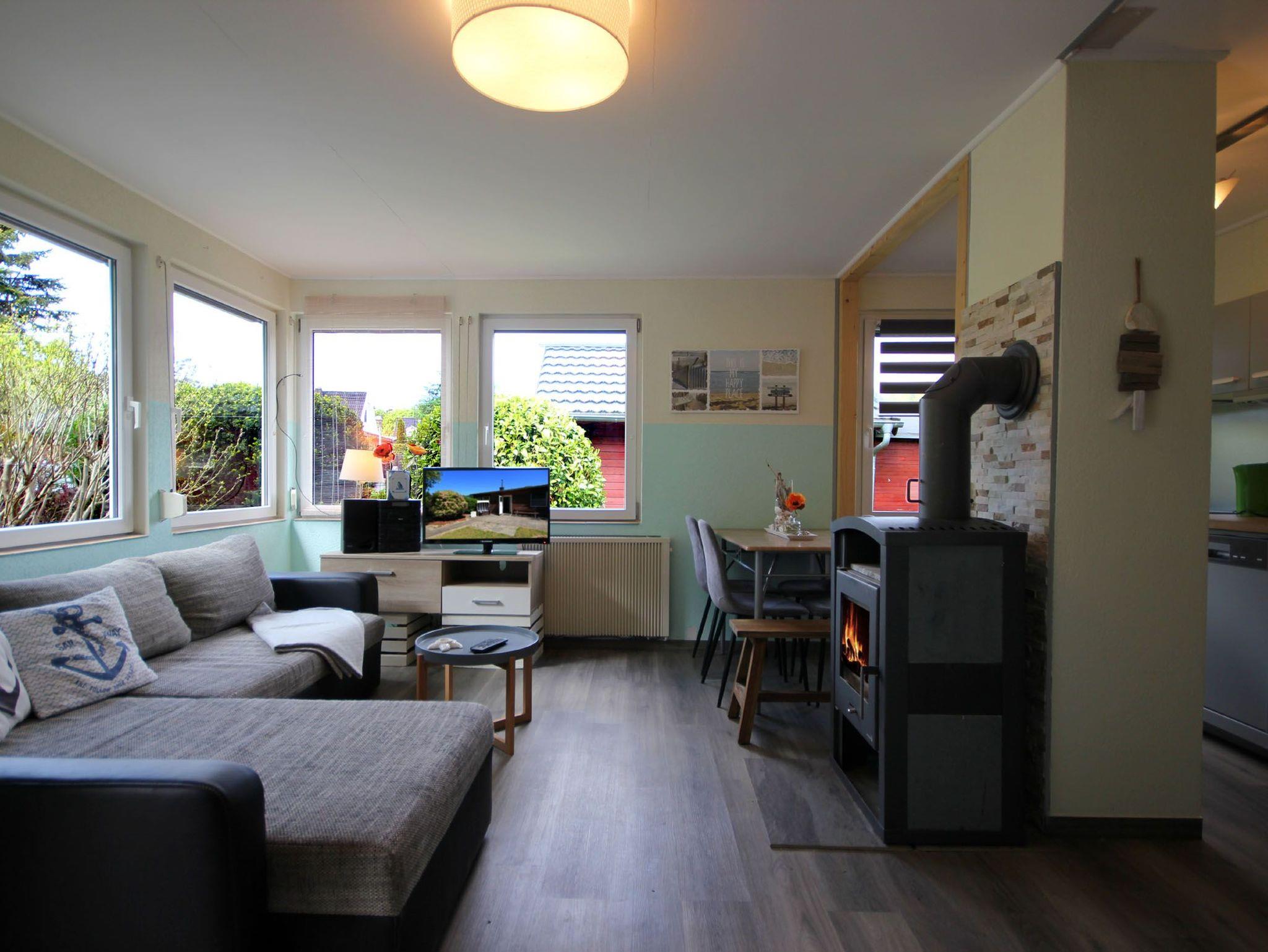 Der Bungalow teilt sich auf in ein Wohnzimmer mit Kamin, einem Essbereich, einer separaten Küche, ein Tageslichtbad sowie zwei Schlafzimmer. Eine angrenzende Terrasse mit Strandkorb und Blick ins Grüne lädt zum Verweilen und Sonnenbaden ein. Im gemütlichen Wohnraum erwartet Sie eine bequeme Sitzecke sowie ein separater Essbereich, ein Kamin und ein Flachbild-TV. Die integrierte Küche verfügt über ein 2-Platten-Kochfeld, einen Kühlschrank mit kleinem Gefrierfach, Geschirrspüler, Kaffeemaschine, Toaster, Mikrowelle und Wasserkocher. Im Tageslichtbad finden Sie eine Dusche, Waschtisch sowie WC. Das Hauptschlafzimmer ist mit einem Doppelbett und einem Kleiderschrank ausgestattet. Das zweite Schlafzimmer verfügt über ein Etagenbett für 2 Personen. Durch den eigenen abschließbaren Garten und die grüne Umgebung ist diese Wohnung ideal für Familien mit Kindern und Haustieren geeignet. Ihren PKW können Sie direkt am Haus abstellen. Hier haben bis zu 2 PKW´s Platz. Fahrräder können Sie im hauseigenen Raum unterstellen. Die unbefestigte Zufahrtsstraße ist für Autos mit geringer Bodenfreiheit nicht geeignet.