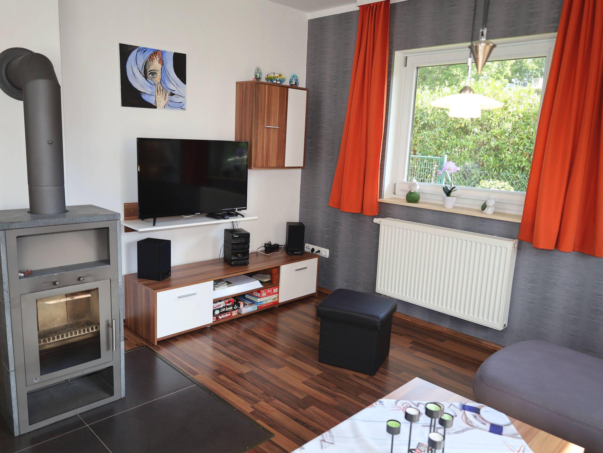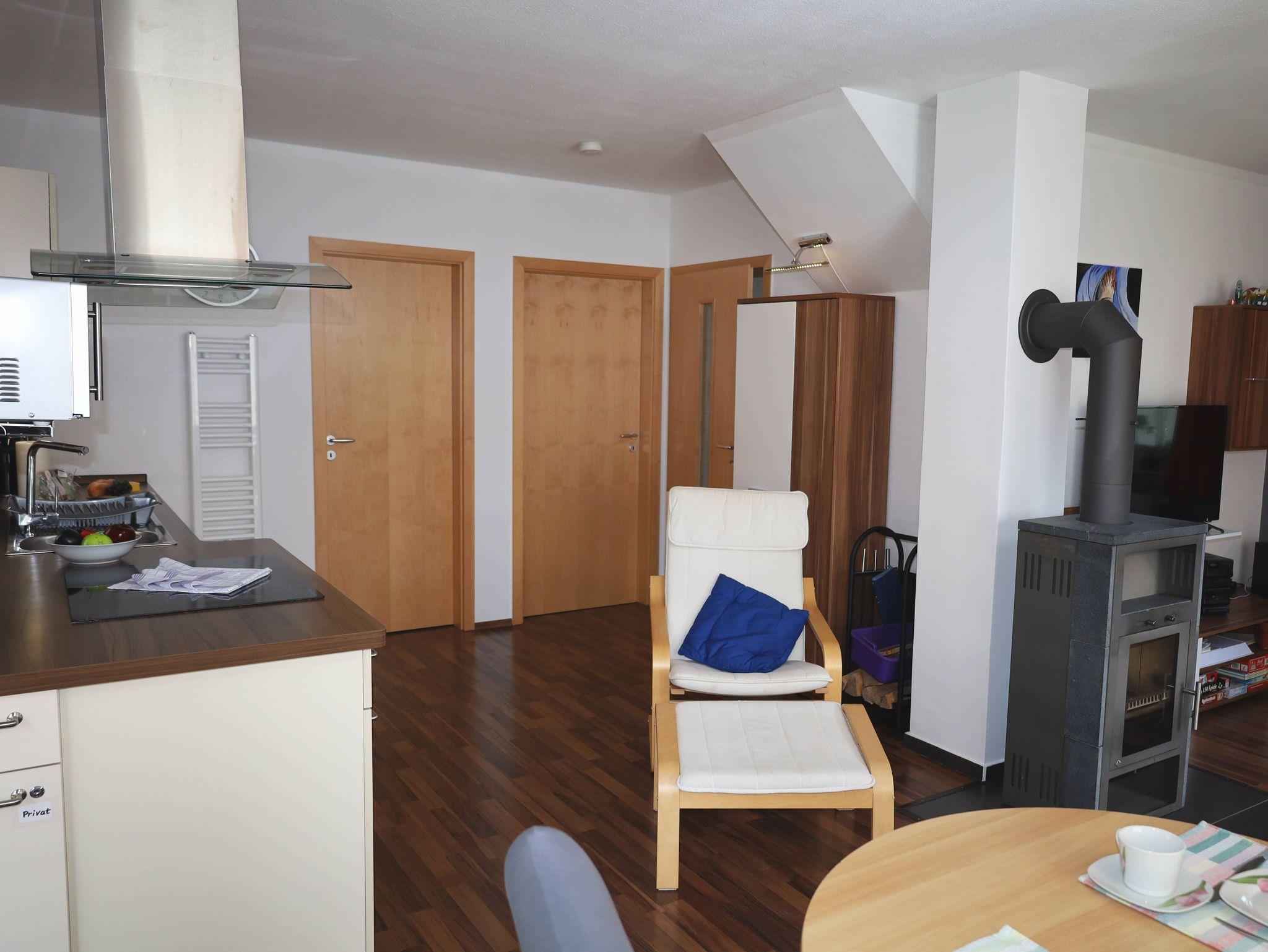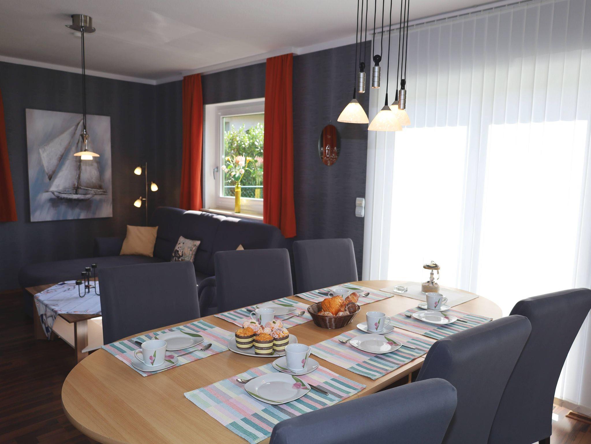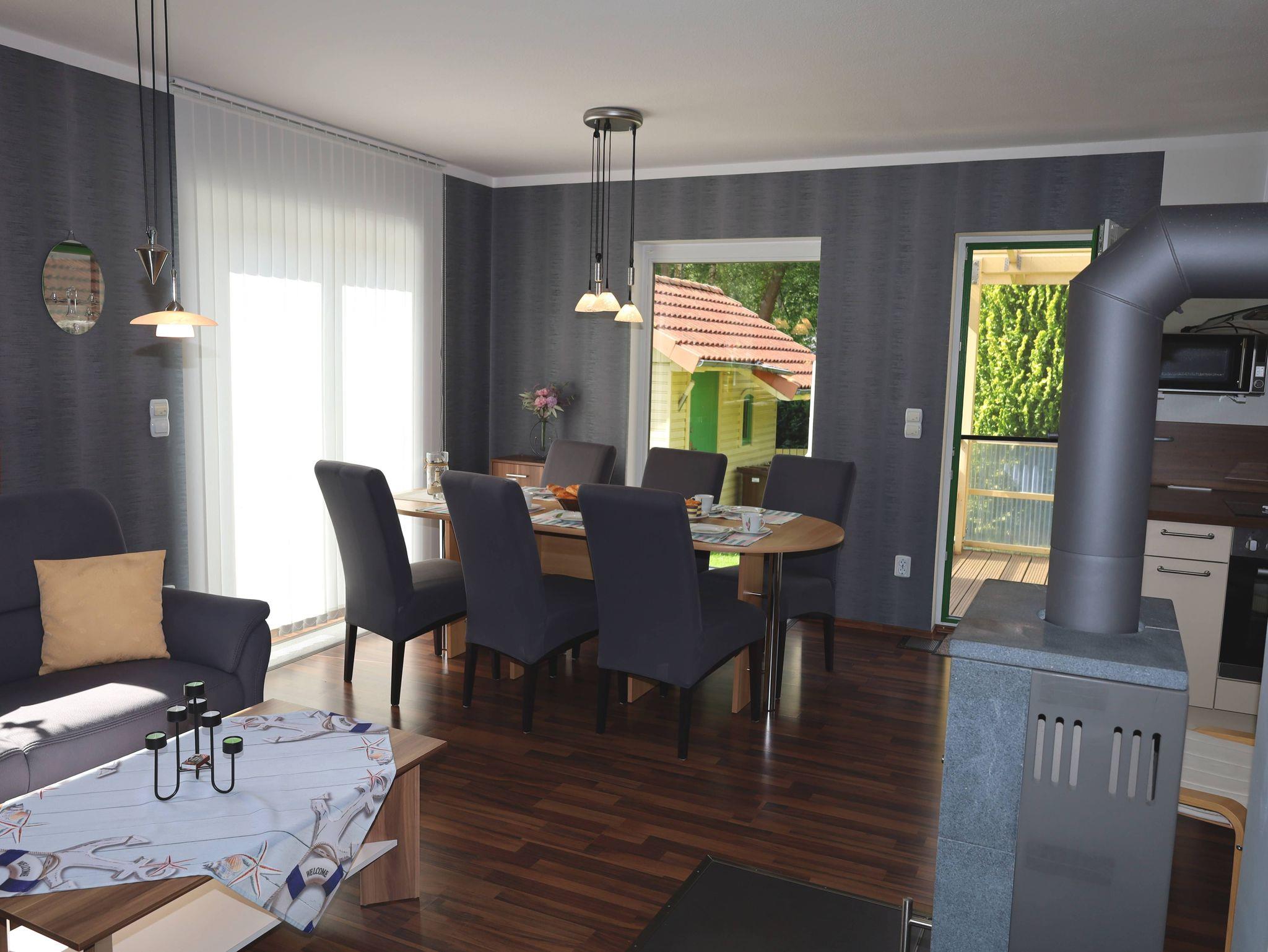 Das Wohnzimmer lädt mit seiner gemütlichen Couch, dem knisternden Kamin und dem Fernseher sowie kostenlosen W-Lan zu entspannten Abenden ein. Am großen Esstisch finden bis zu sechs Personen gemeinsam Platz für ein geselliges Frühstück oder ein Abendessen.