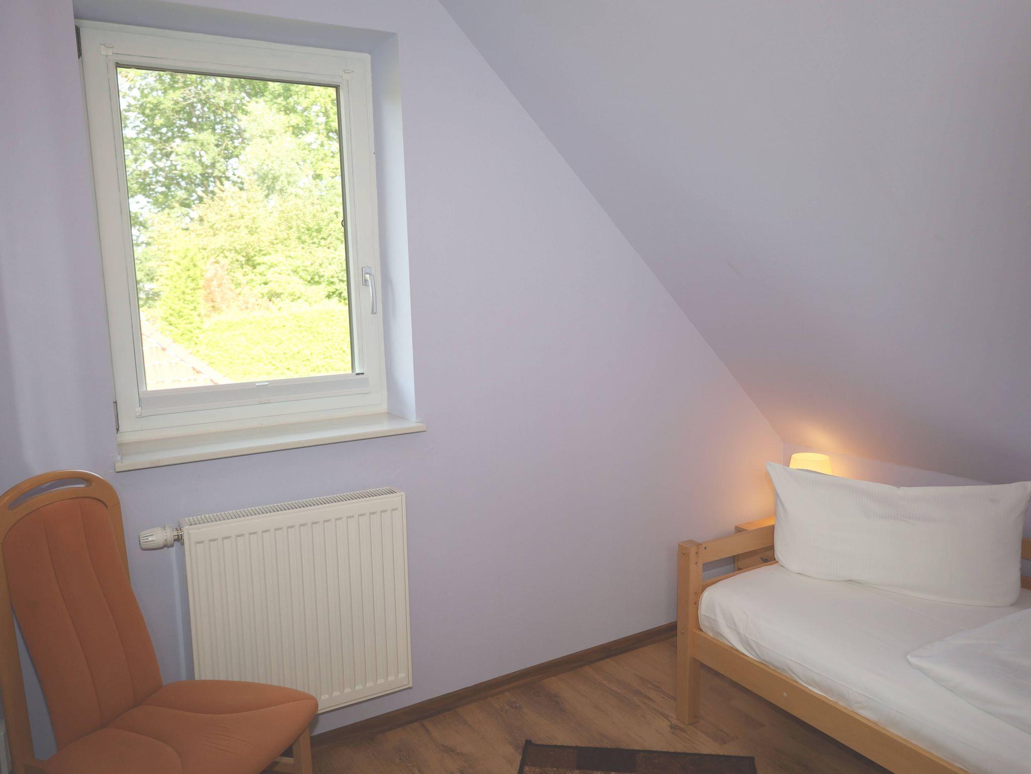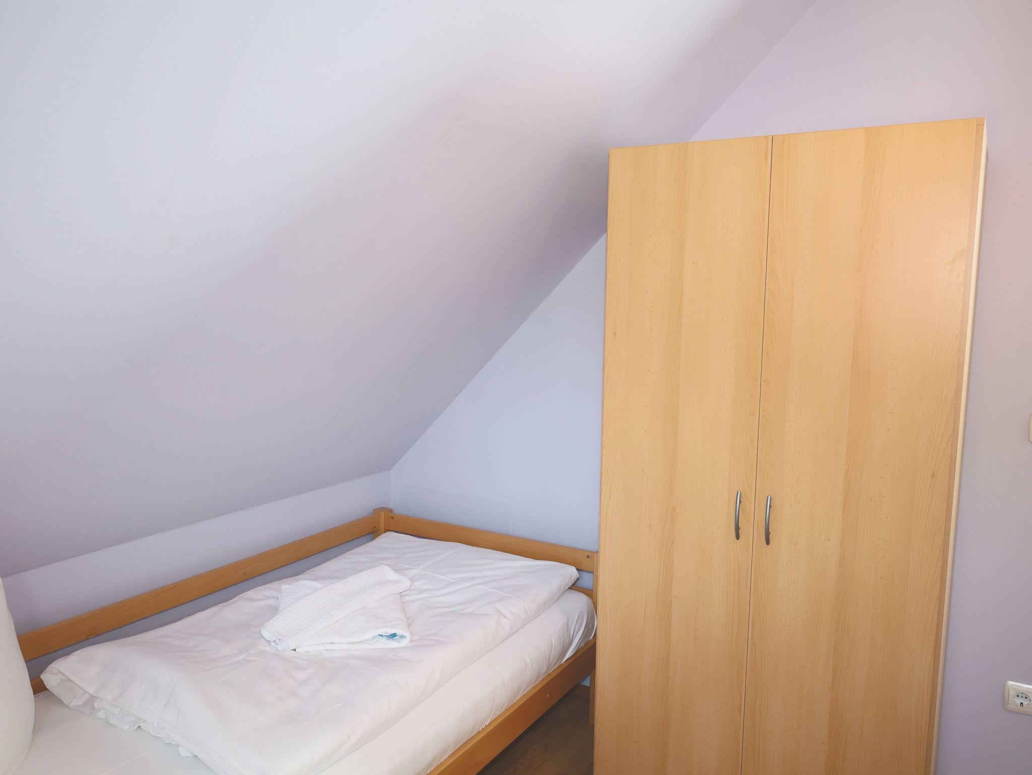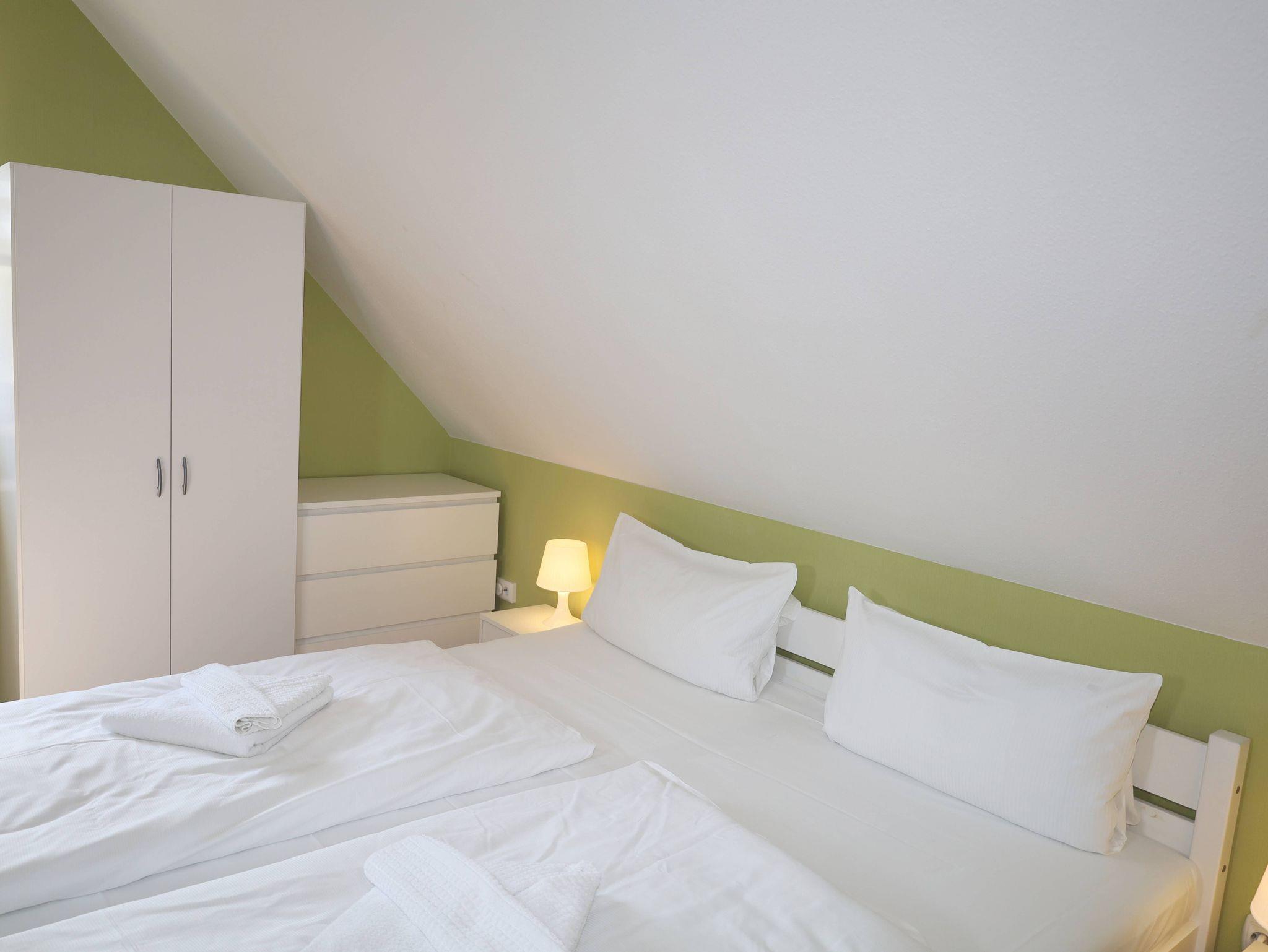 Im Obergeschoss warten weitere gemütliche Rückzugsorte auf Sie: ein Schlafzimmer mit Doppelbett, Kleiderschrank und zusätzlichem Fernseher sowie ein weiteres Schlafzimmer mit Einzelbett.
