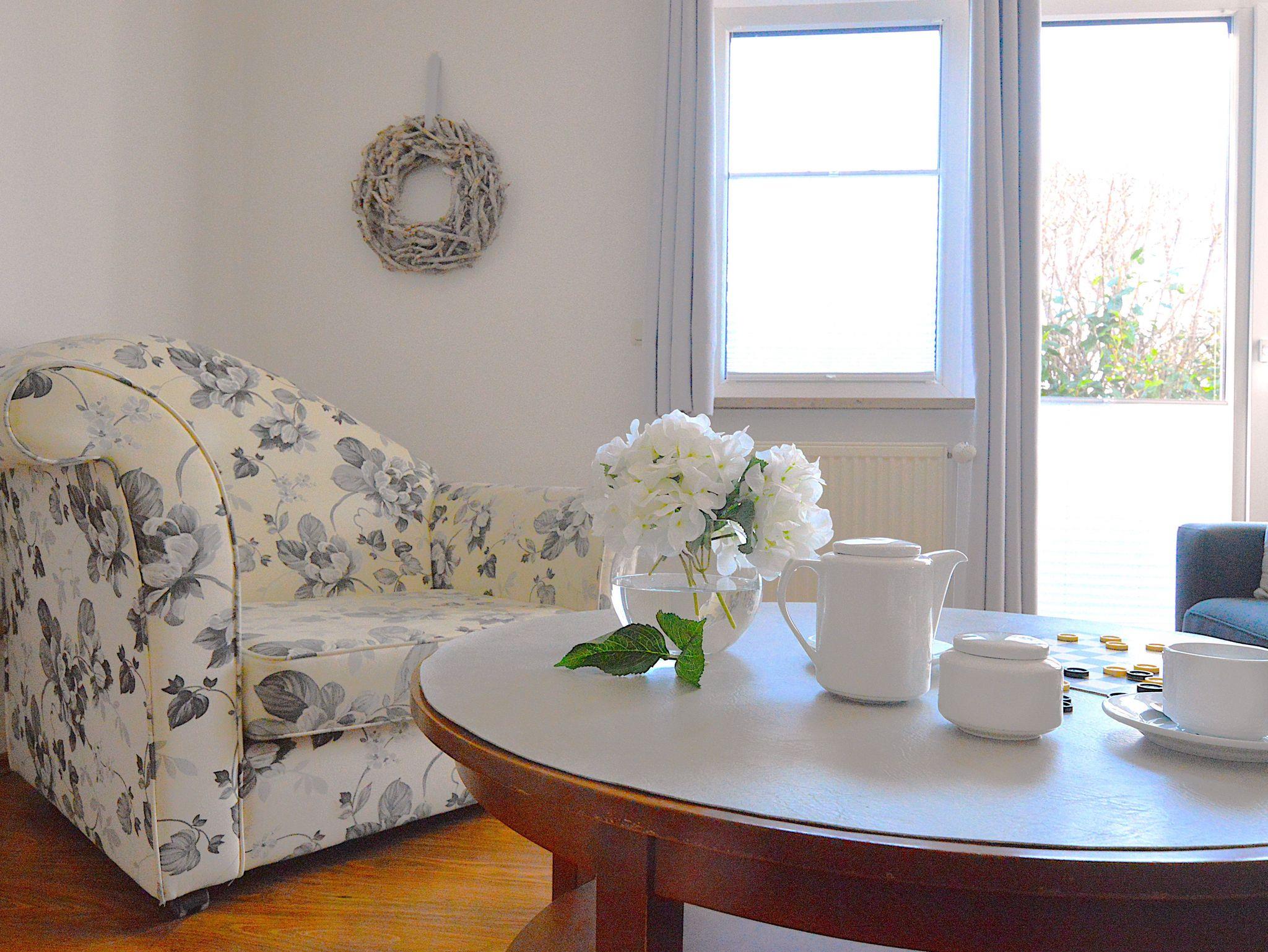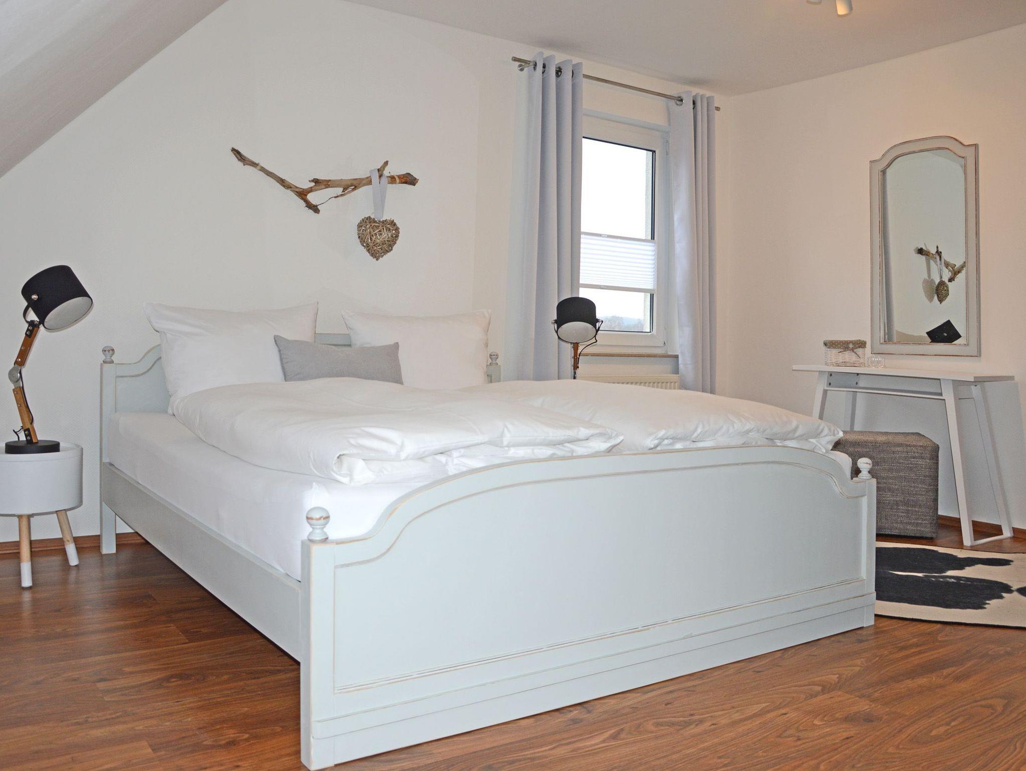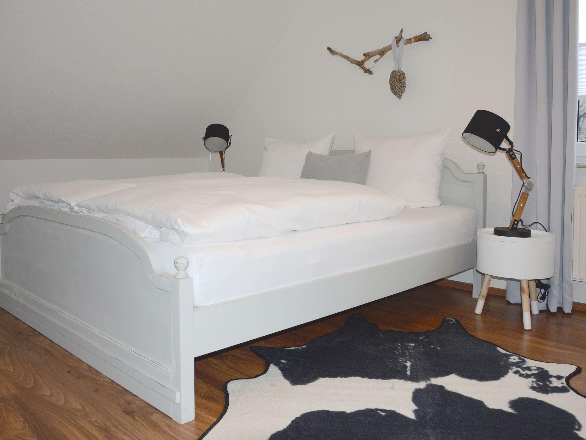 Das große Wohnzimmer mit Essplatz, Couchecke, TV und HiFi-Anlage ist elegant möbliert. Die separate Küche ist komplett ausgestattet mit 4-Platten-Cerankochfeld und Backofen, Mikrowelle, Geschirrspüler, Kühlschrank, Kaffeemaschine, Wasserkocher und Toaster. Im Wirtschaftsraum stehen zusätzlich Gefrierschrank, Waschmaschine, Trockner, Bügelbrett und Bügeleisen bereit. Das erste Schlafzimmer hat ein Doppelbett (Liegefläche 180×200 cm) und ein Babybett (auf Anfrage). Das zweite Schlafzimmer hat ein Doppelbett (Liegefläche 180×200 cm) und einen Kleiderschrank. Auch ein Ankleidezimmer mit Kleiderschränken und Wäschekommode gehört zur Ferienwohnung. Ein komfortables Duschbad mit Eckbadewanne, WC und Haartrockner, sowie ein zweites Bad mit Dusche und WC runden den Komfort ab.