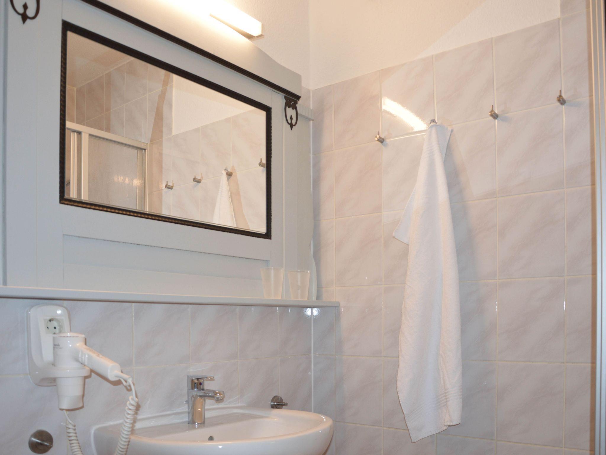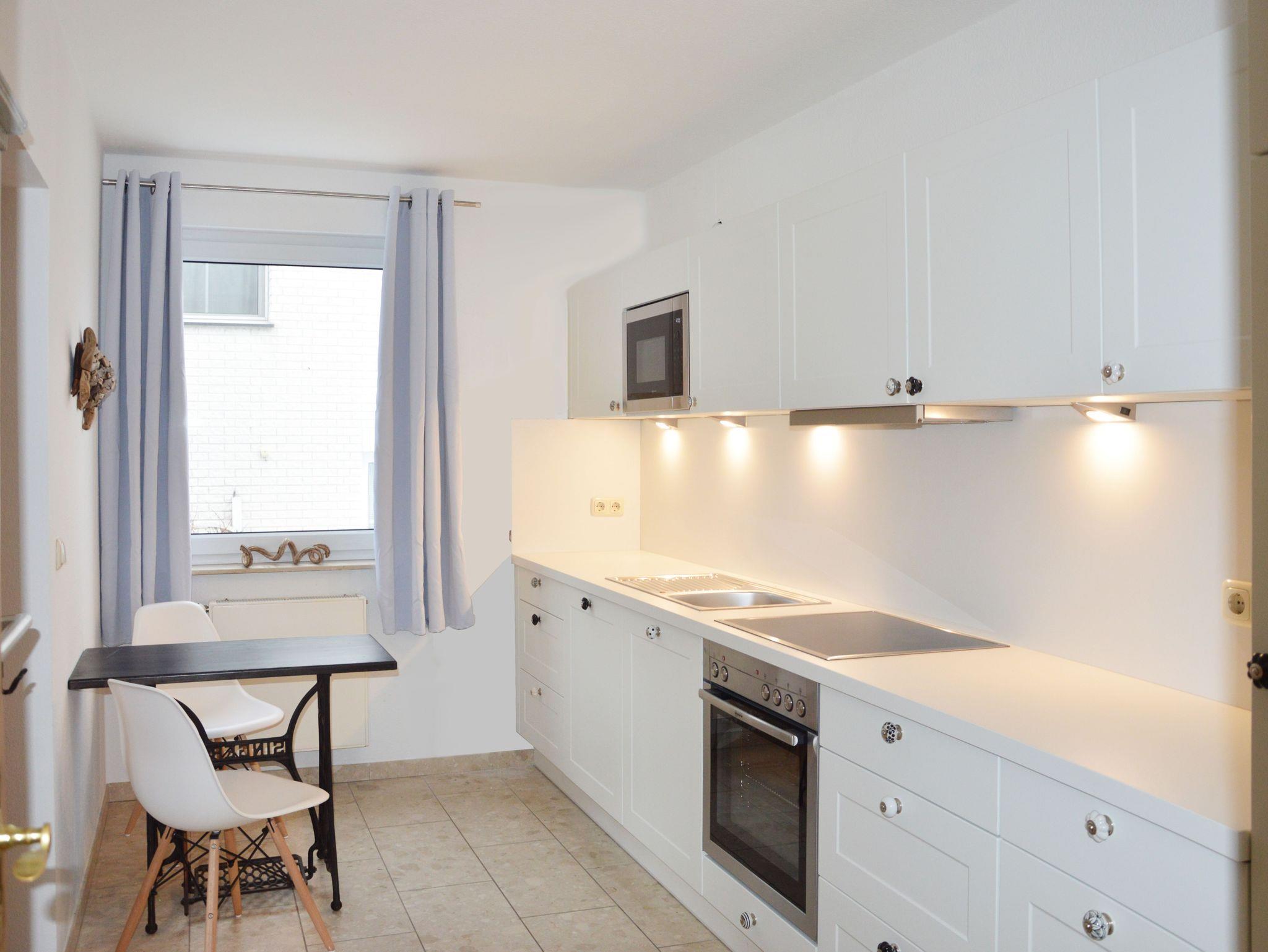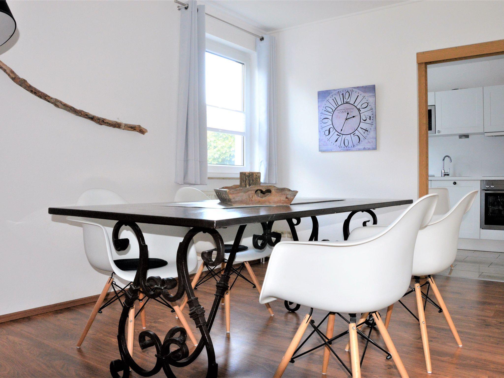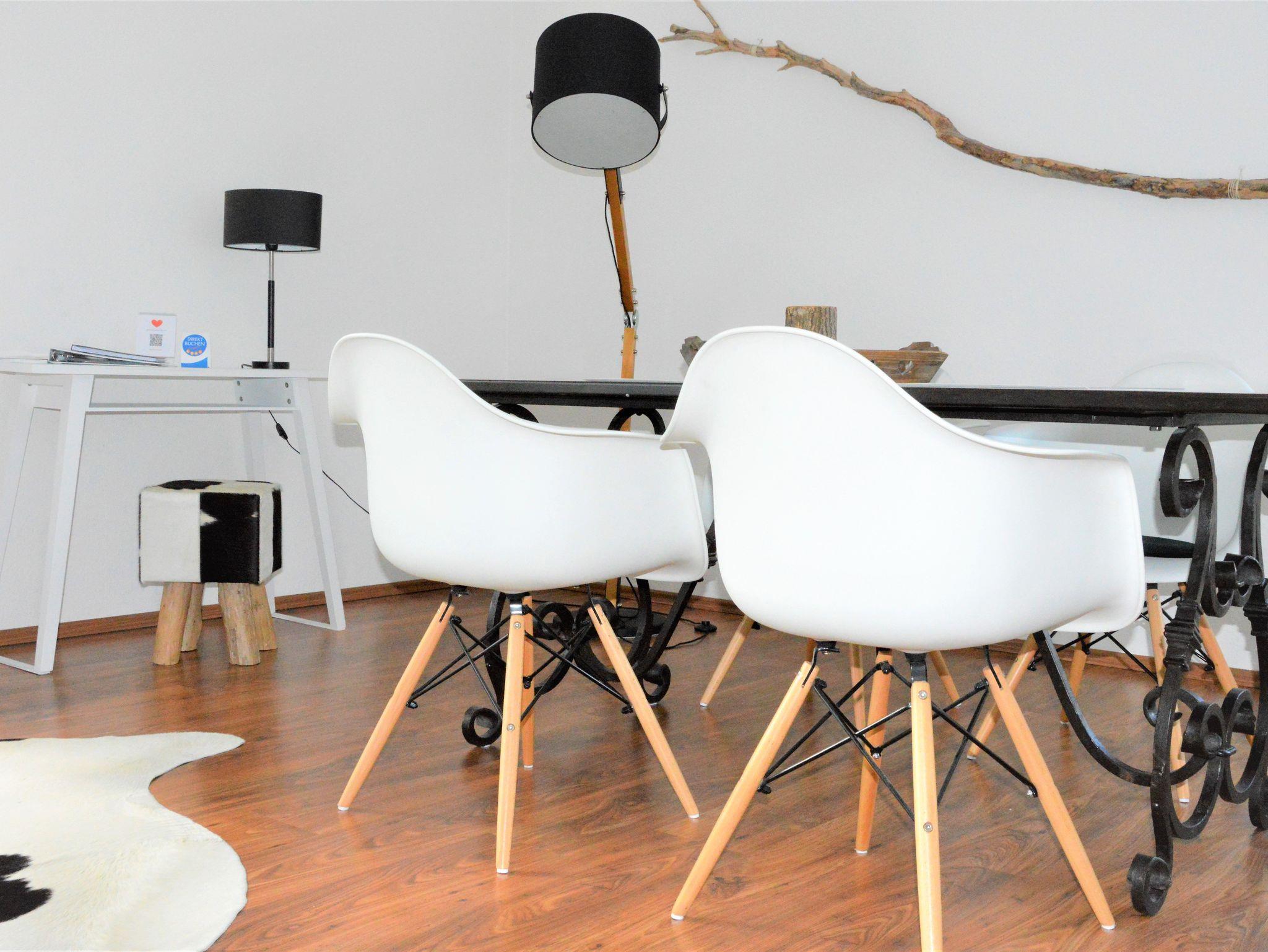 Das große Wohnzimmer mit Essplatz, Couchecke, TV und HiFi-Anlage ist elegant möbliert. Die separate Küche ist komplett ausgestattet mit 4-Platten-Cerankochfeld und Backofen, Mikrowelle, Geschirrspüler, Kühlschrank, Kaffeemaschine, Wasserkocher und Toaster. Im Wirtschaftsraum stehen zusätzlich Gefrierschrank, Waschmaschine, Trockner, Bügelbrett und Bügeleisen bereit. Das erste Schlafzimmer hat ein Doppelbett (Liegefläche 180×200 cm) und ein Babybett (auf Anfrage). Das zweite Schlafzimmer hat ein Doppelbett (Liegefläche 180×200 cm) und einen Kleiderschrank. Auch ein Ankleidezimmer mit Kleiderschränken und Wäschekommode gehört zur Ferienwohnung. Ein komfortables Duschbad mit Eckbadewanne, WC und Haartrockner, sowie ein zweites Bad mit Dusche und WC runden den Komfort ab.