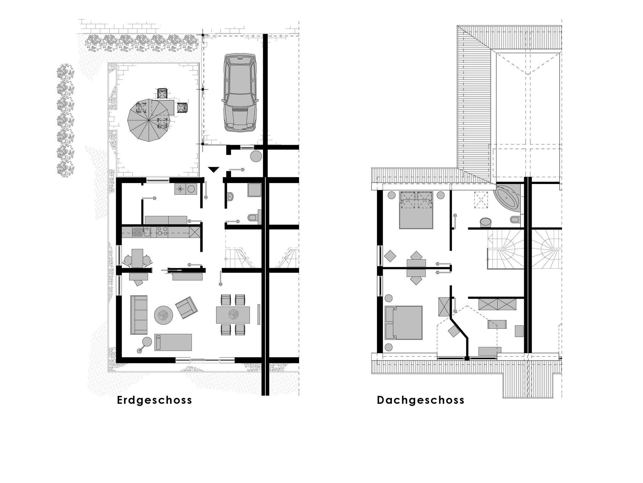 Außerhalb des Hauses steht Ihnen ein über 300m² großer Garten und eine Terasse mit Möbeln, Sonnenschirm und Grill zur alleinigen Nutzung zur Verfügung. Für Ihre PKWs stehen ein überdachter Carport und ein zweiter Stellplatz bereit.