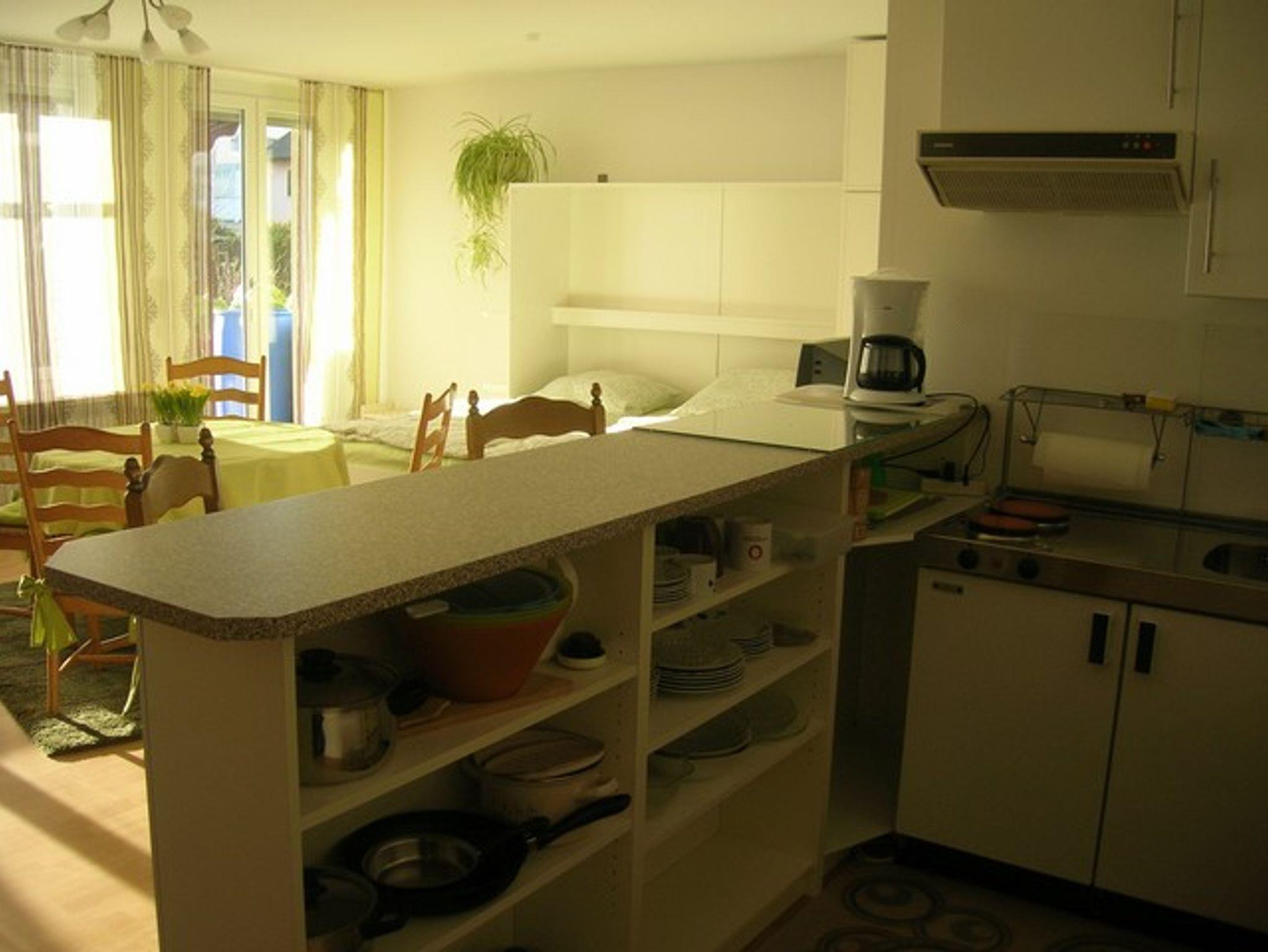 Integriert ist eine kleine und voll eingerichtete Küchenzeile, die durch einen Tresen räumlich abgetrennt scheint. Sie beinhaltet ein Kochfeld mit 2 Kochplatten, eine Mikrowelle und einen normal großen Kühlschrank. Ebenso eine Kaffeemaschine und einen Wasserkocher.