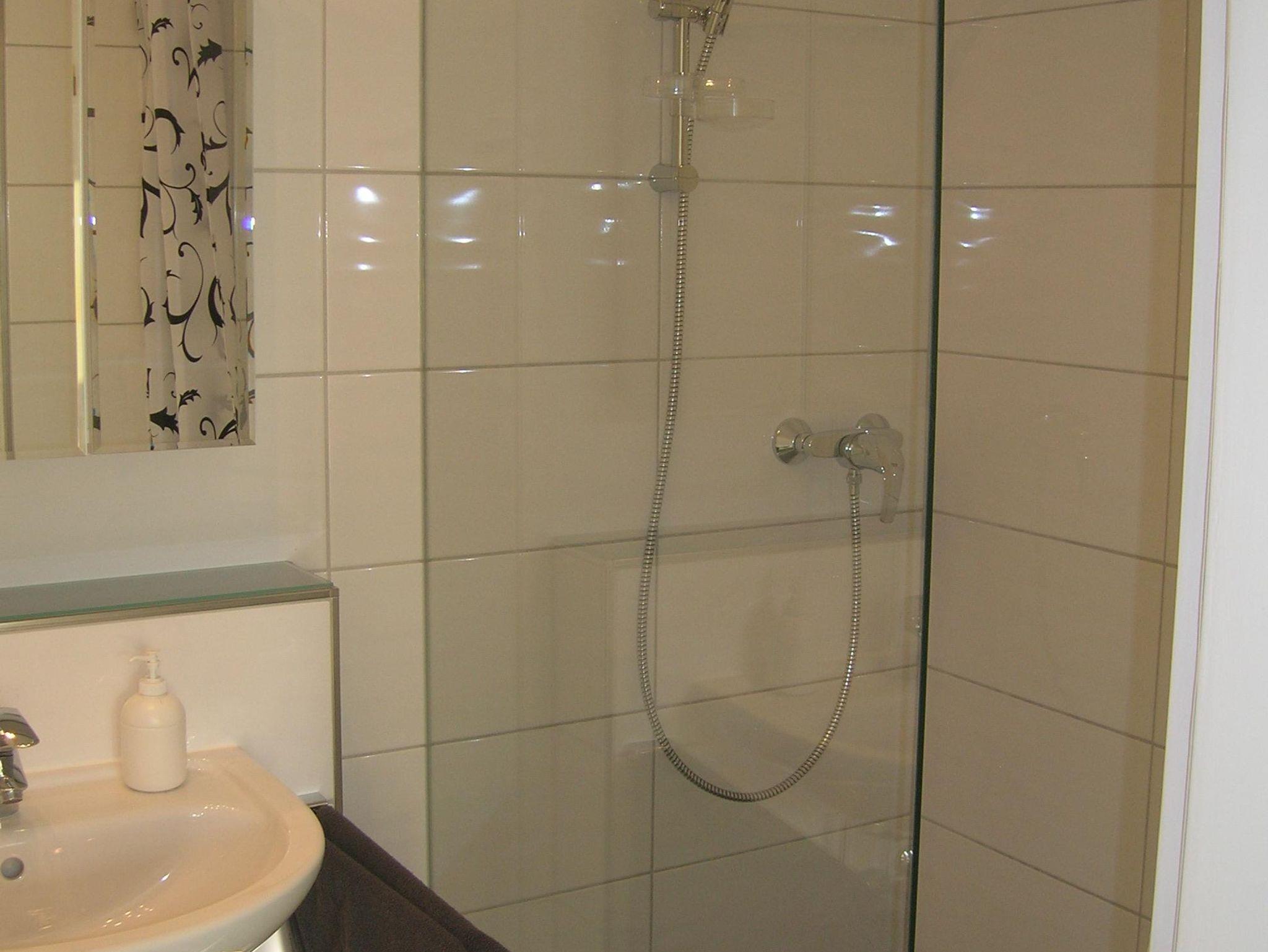 Im kleinen Bad befindet sich eine geräumige Dusche, ein Waschbecken und die Toilette. Frische Handtücher und ein Föhn stehen zur Verfügung.
