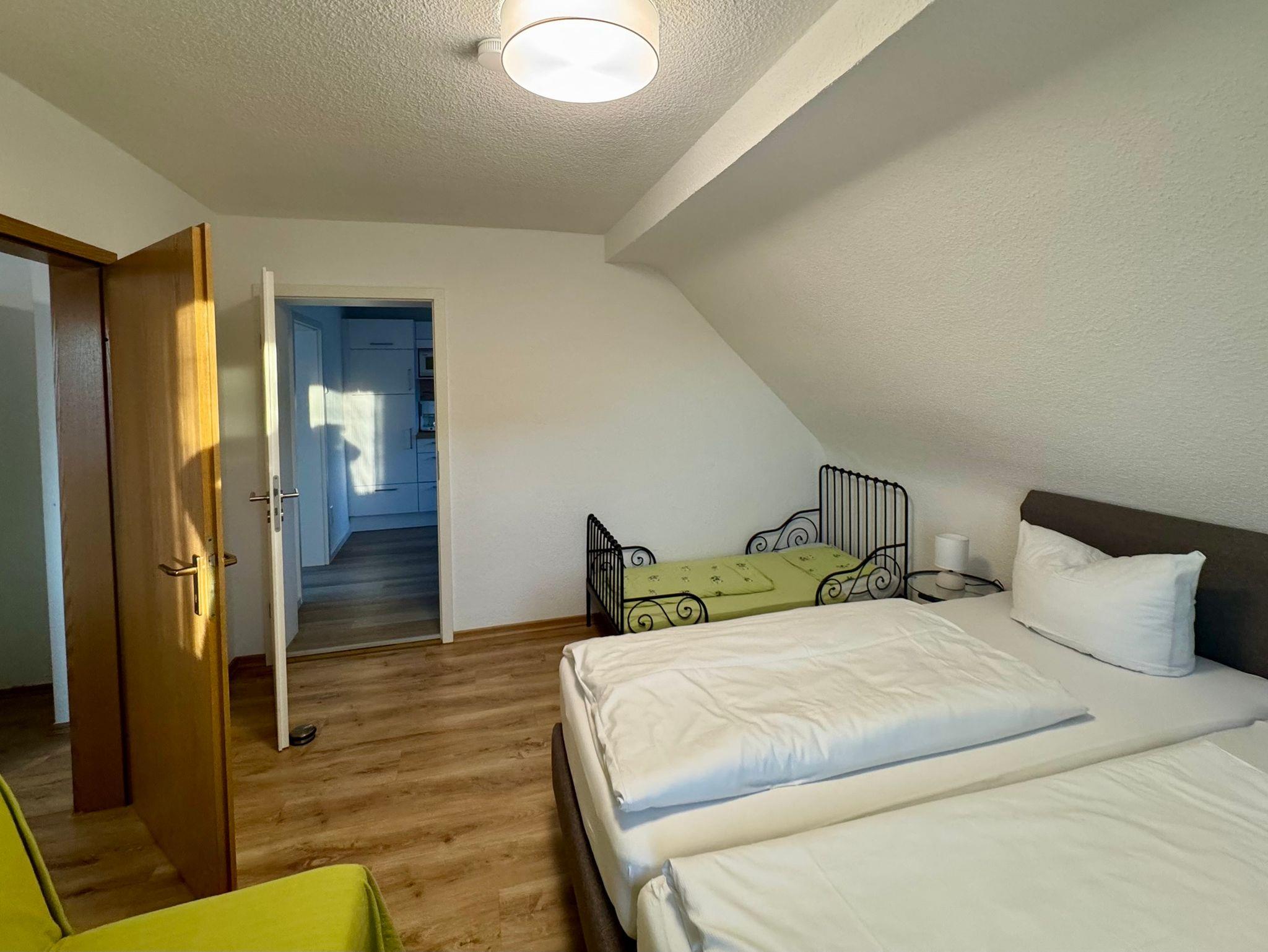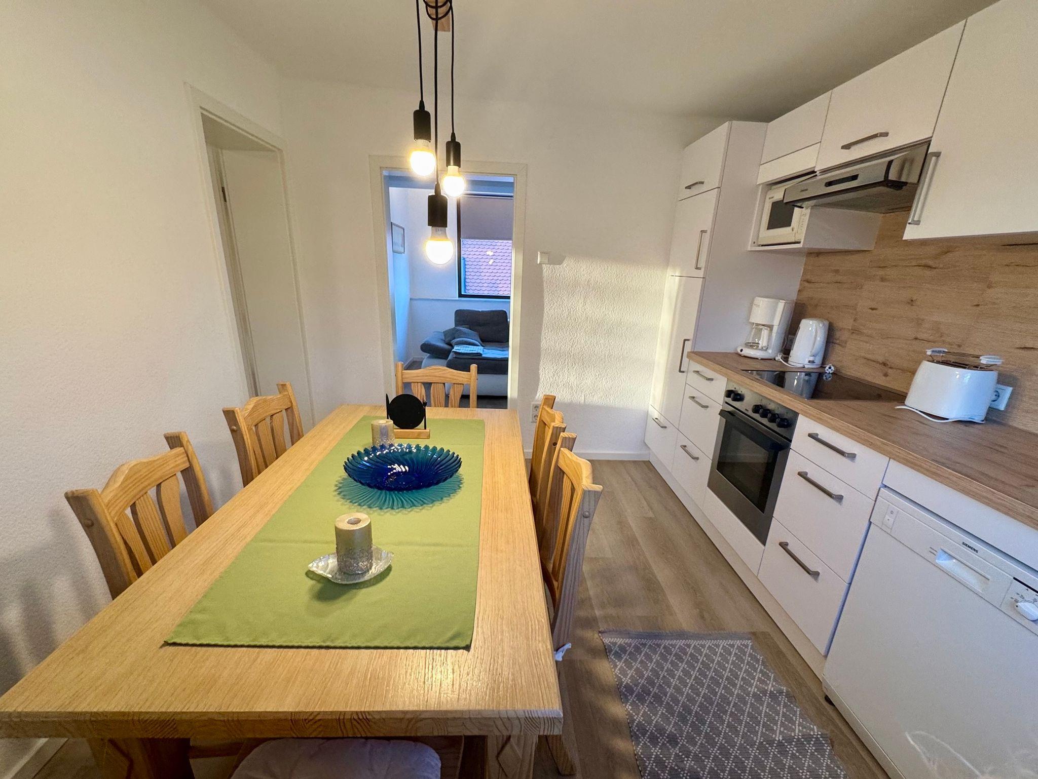 Die 90 m² große Ferienwohnung bietet ein gemütliches Wohnzimmer, das mit einer großen Couch und SAT-TV zum Verweilen einlädt. Beide Schlafzimmer sind jeweils mit einem modernen Doppelbett, einem Kinderbett oder einer Schlafcouch sowie einem Kleiderschrank und Rollos ausgestattet. Außerdem sind alle Fenster in der Wohnung mit Fliegengittern versehen. Die Küche verfügt über eine Kochzeile, die mit einem Wasserkocher, einer Kaffeemaschine, einer Mikrowelle, einem Herd mit Backofen und einer Spülmaschine ausgestattet ist. Zudem befindet sich ein Esstisch, an dem bis zu sechs Personen Platz finden. Im Badezimmer stehen Ihnen ein Handtuchheizkörper, ein WC, ein Doppelwaschbecken und eine großzügige Dusche zur Verfügung.