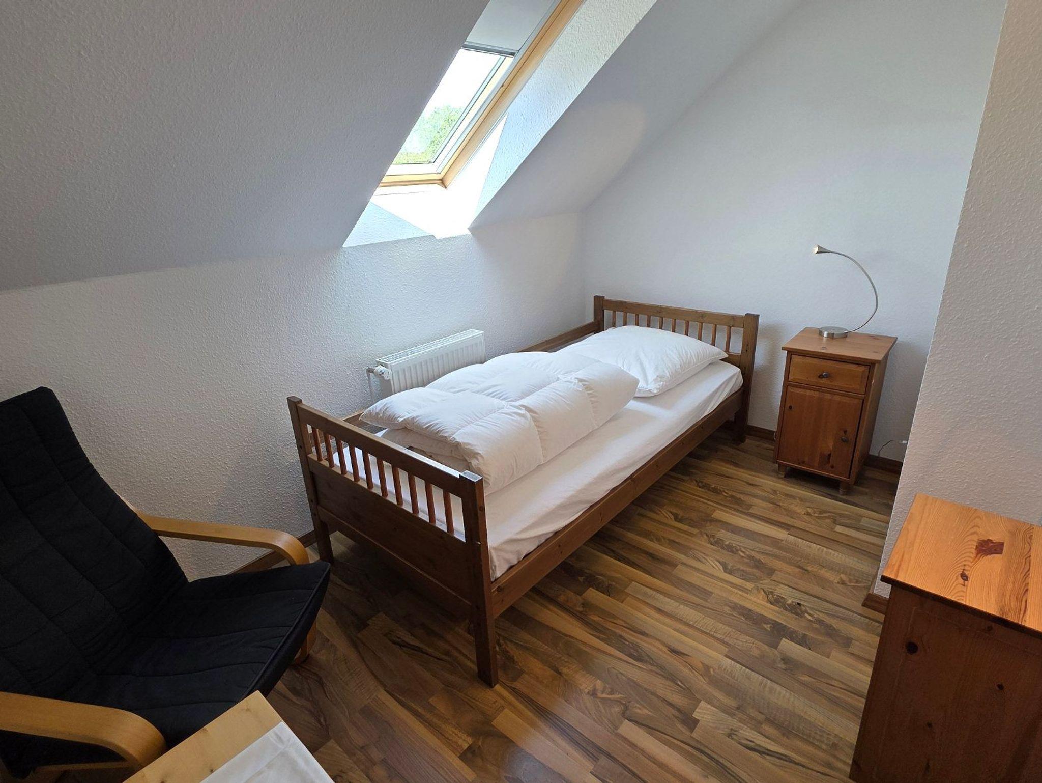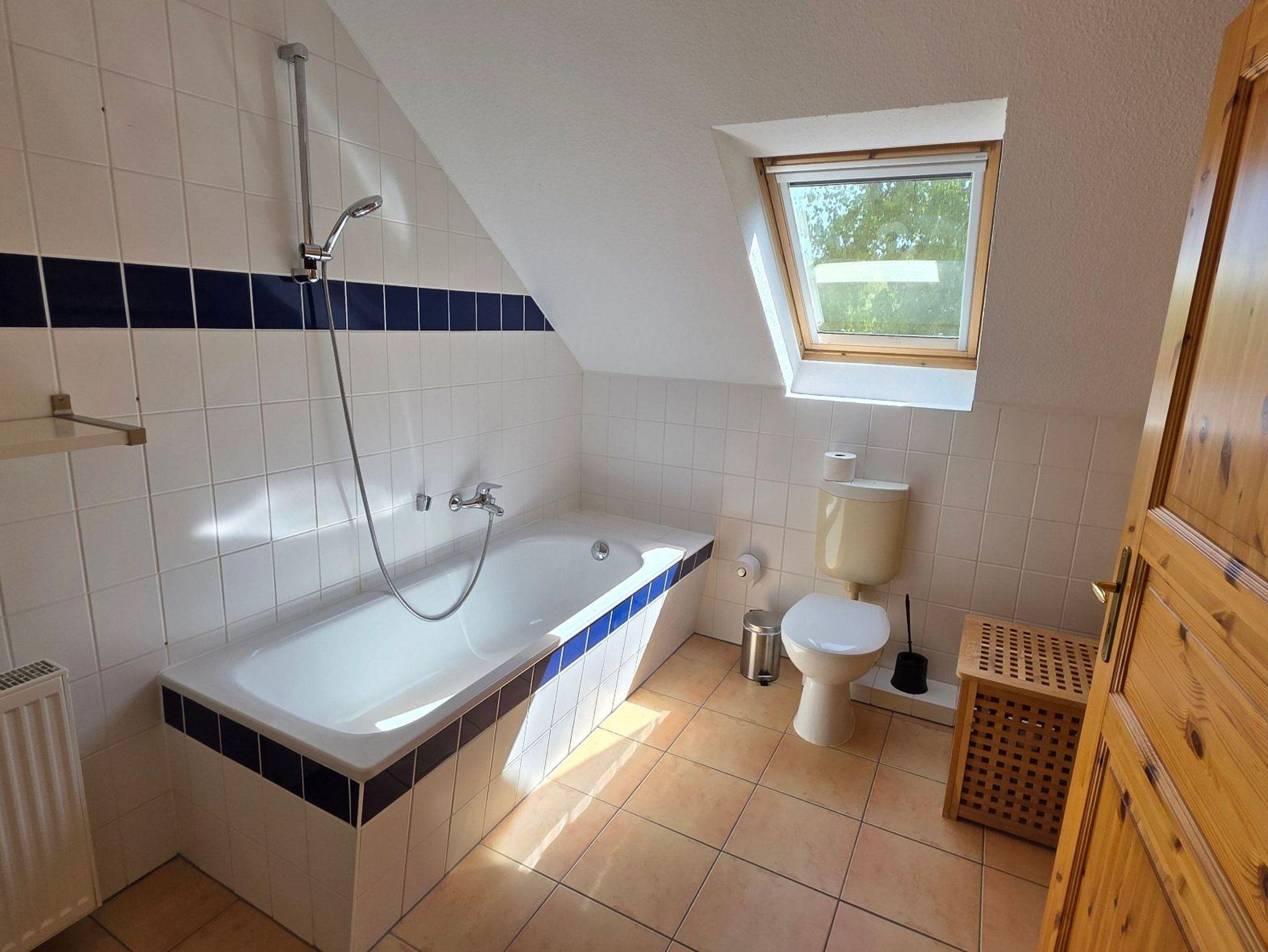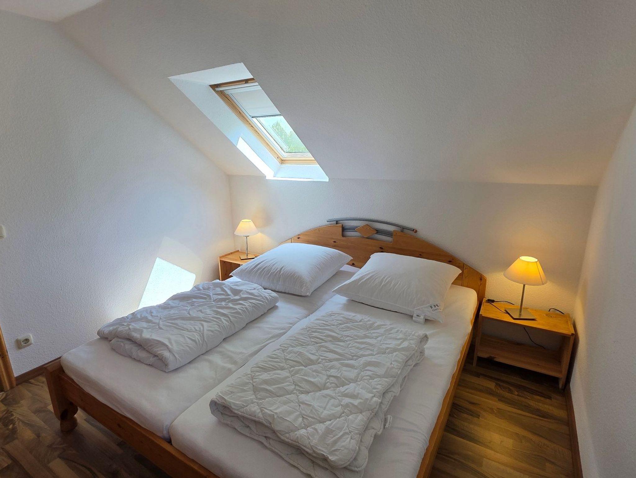 Die Ferienwohnung 5 mit befindet sich in der Ferienanlage Haus am See mit 98 qm auf 2 Etagen (Obergeschoss: Wohnzimmer mit Essplatz, große separate Küche, Gäste-WC, Dachgeschoss: 2 Schlafzimmer mit Doppelbett, 1 Schlafzimmer mit Einzelbett, Bad/Wanne/WC, ). Aus dem Wohnzimmer gelangt man direkt auf den großen Südwest-Balkon. Vom Balkon gelang man über eine Spindeltreppe.