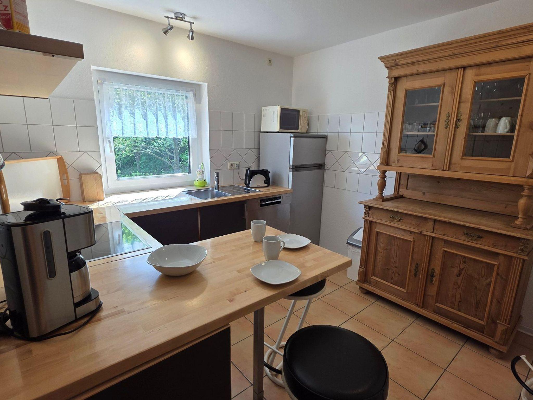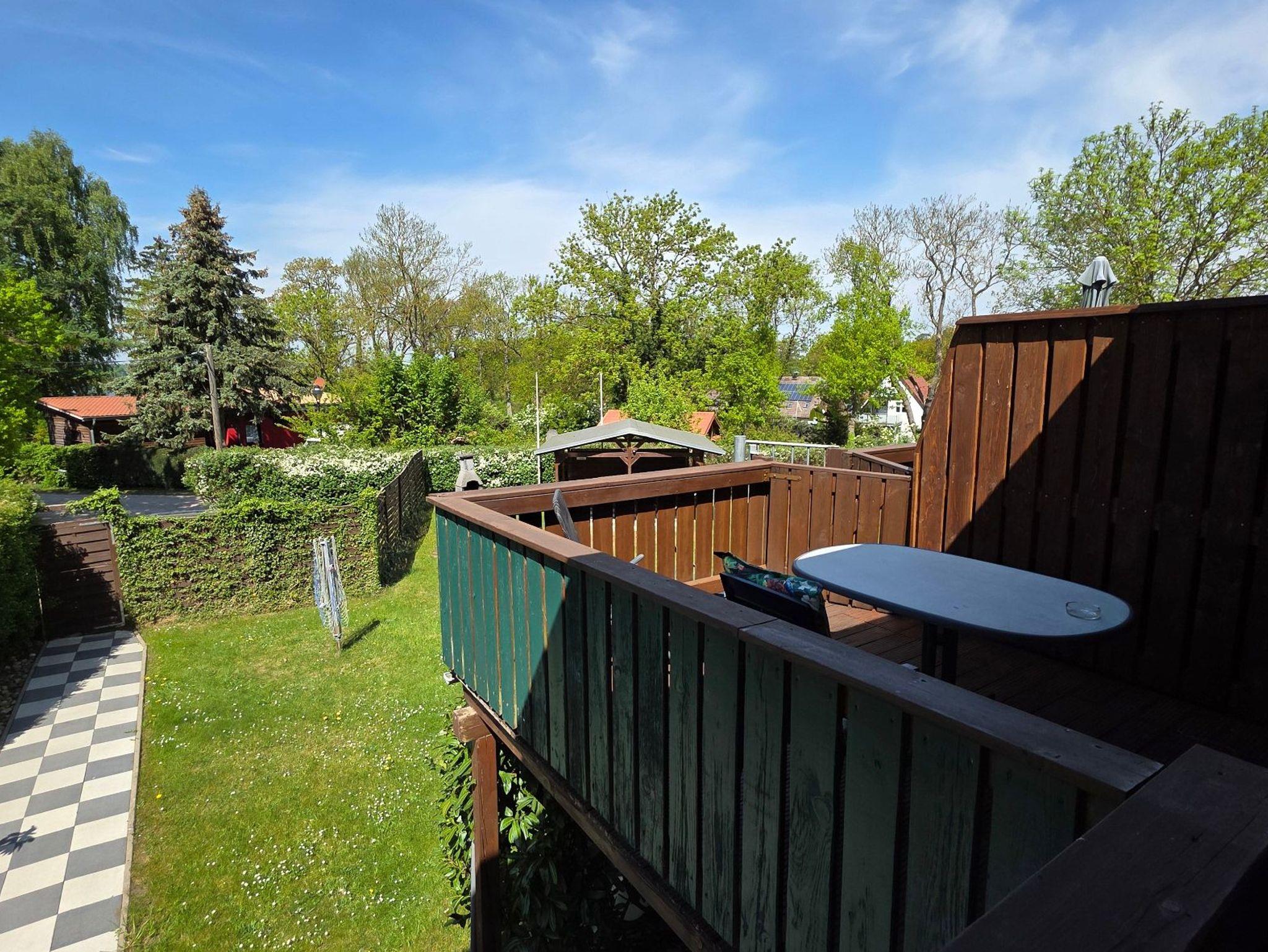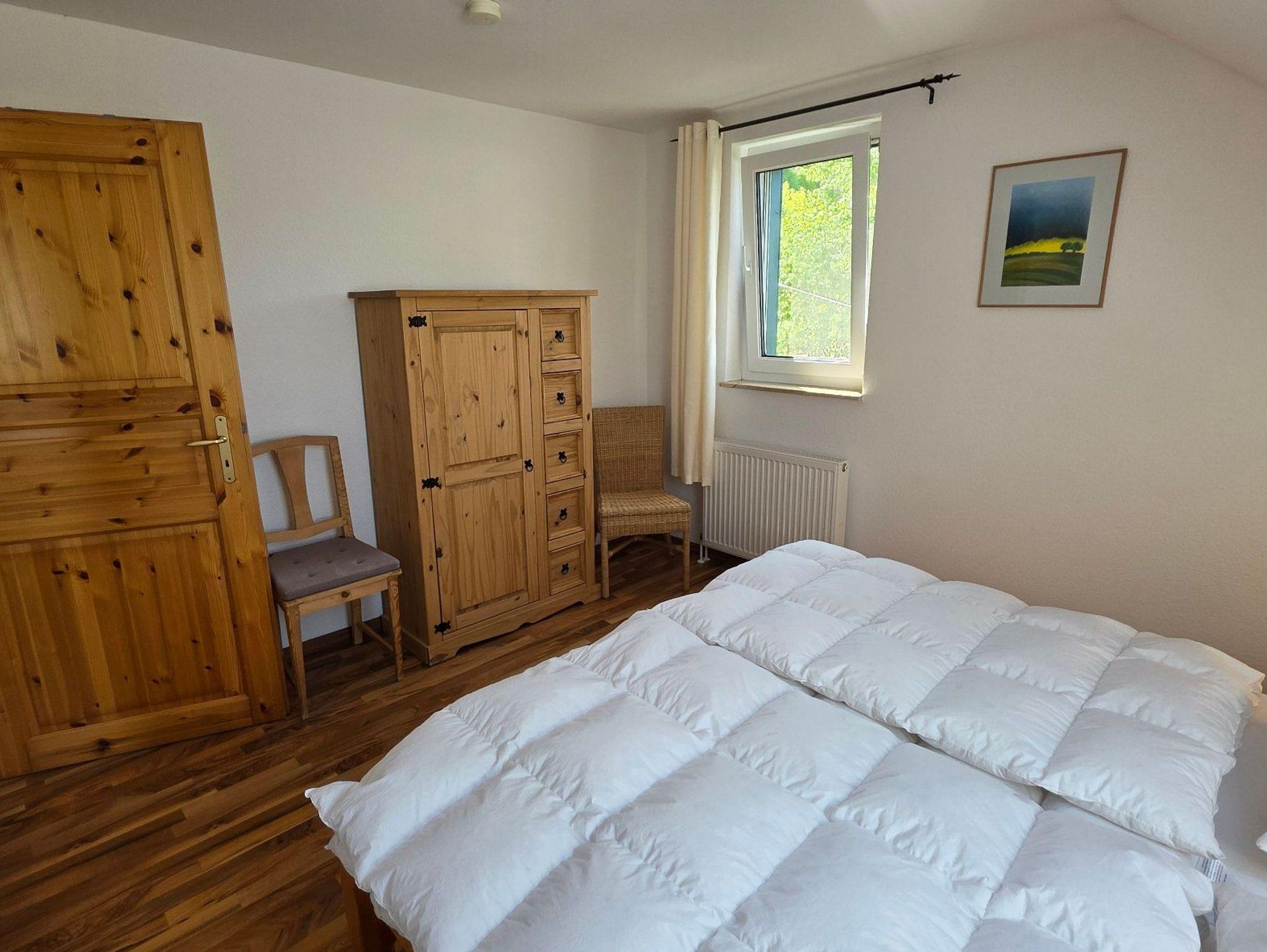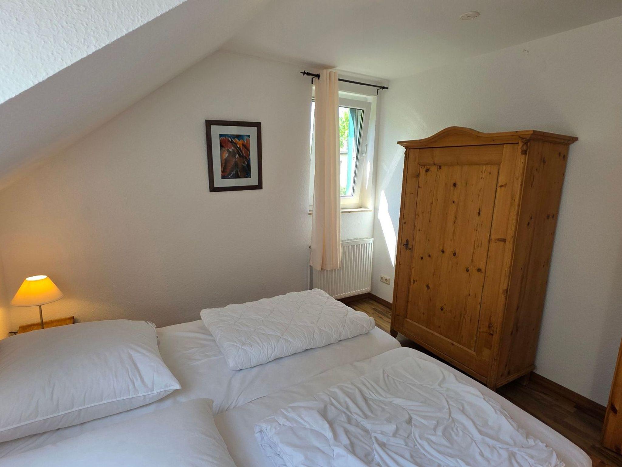 Die Ferienwohnung 5 mit befindet sich in der Ferienanlage Haus am See mit 98 qm auf 2 Etagen (Obergeschoss: Wohnzimmer mit Essplatz, große separate Küche, Gäste-WC, Dachgeschoss: 2 Schlafzimmer mit Doppelbett, 1 Schlafzimmer mit Einzelbett, Bad/Wanne/WC, ). Aus dem Wohnzimmer gelangt man direkt auf den großen Südwest-Balkon. Vom Balkon gelang man über eine Spindeltreppe.