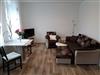 Im Wohnzimmer befinden sich eine Couchgarnitur, ein Flachbild-TV und ein Tisch mit zwei Stühlen.