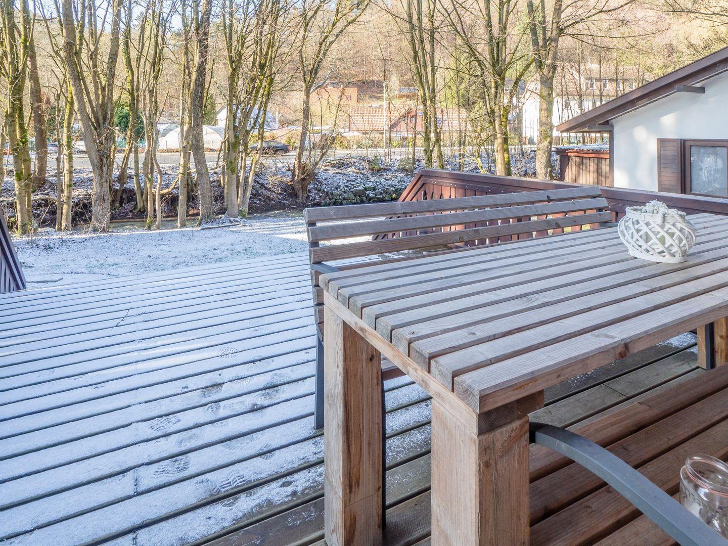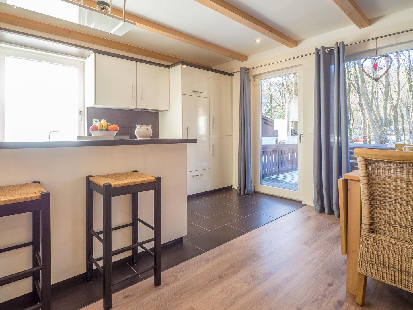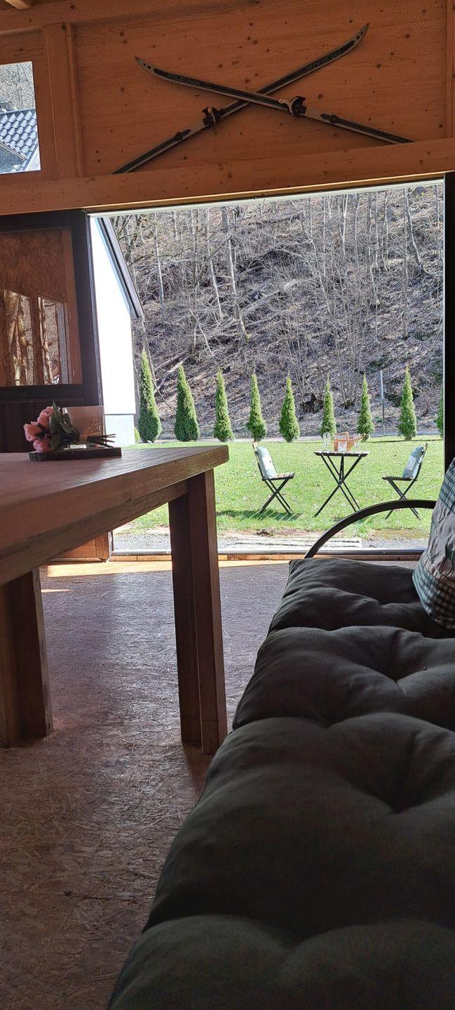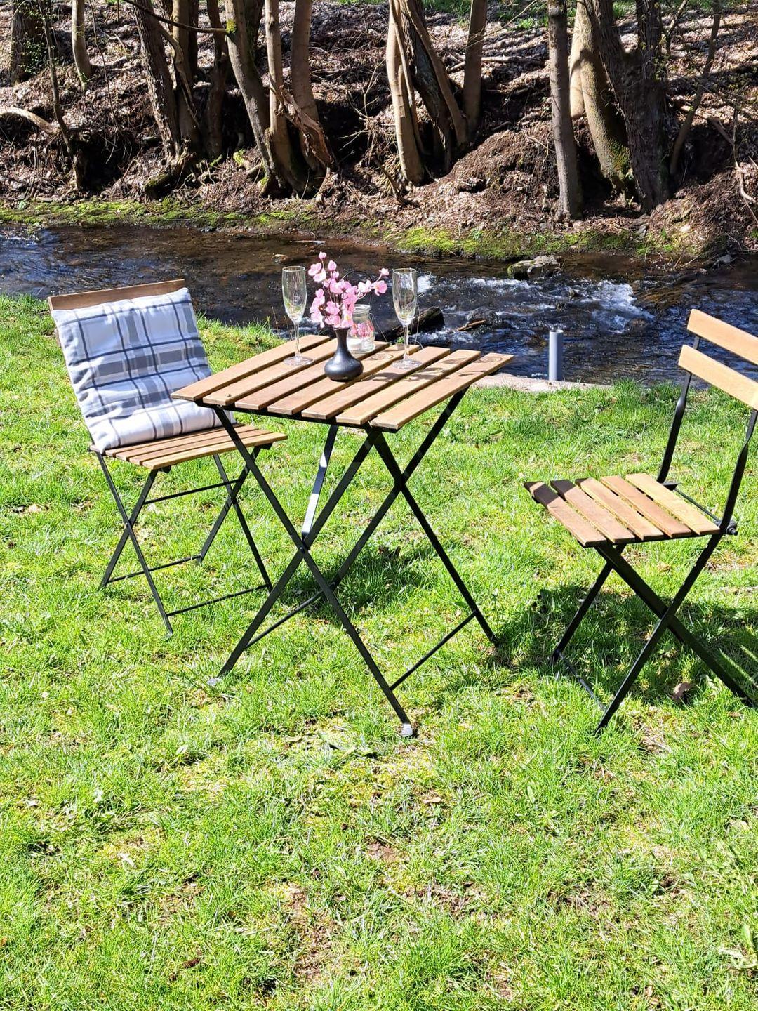 Von der voll ausgestatteten Wohnküche mit Theke, großen Kühlschrank mit Gefrierfach, Essbereich und Ecksofa gelangen Sie auf die Terrasse. Im 850qm großen Aussenbereich steht Ihnen ein Grill und weitere Sitzplätze zur Verfügung. Direkt am Bachlauf steht Ihnen ein beheizbarer