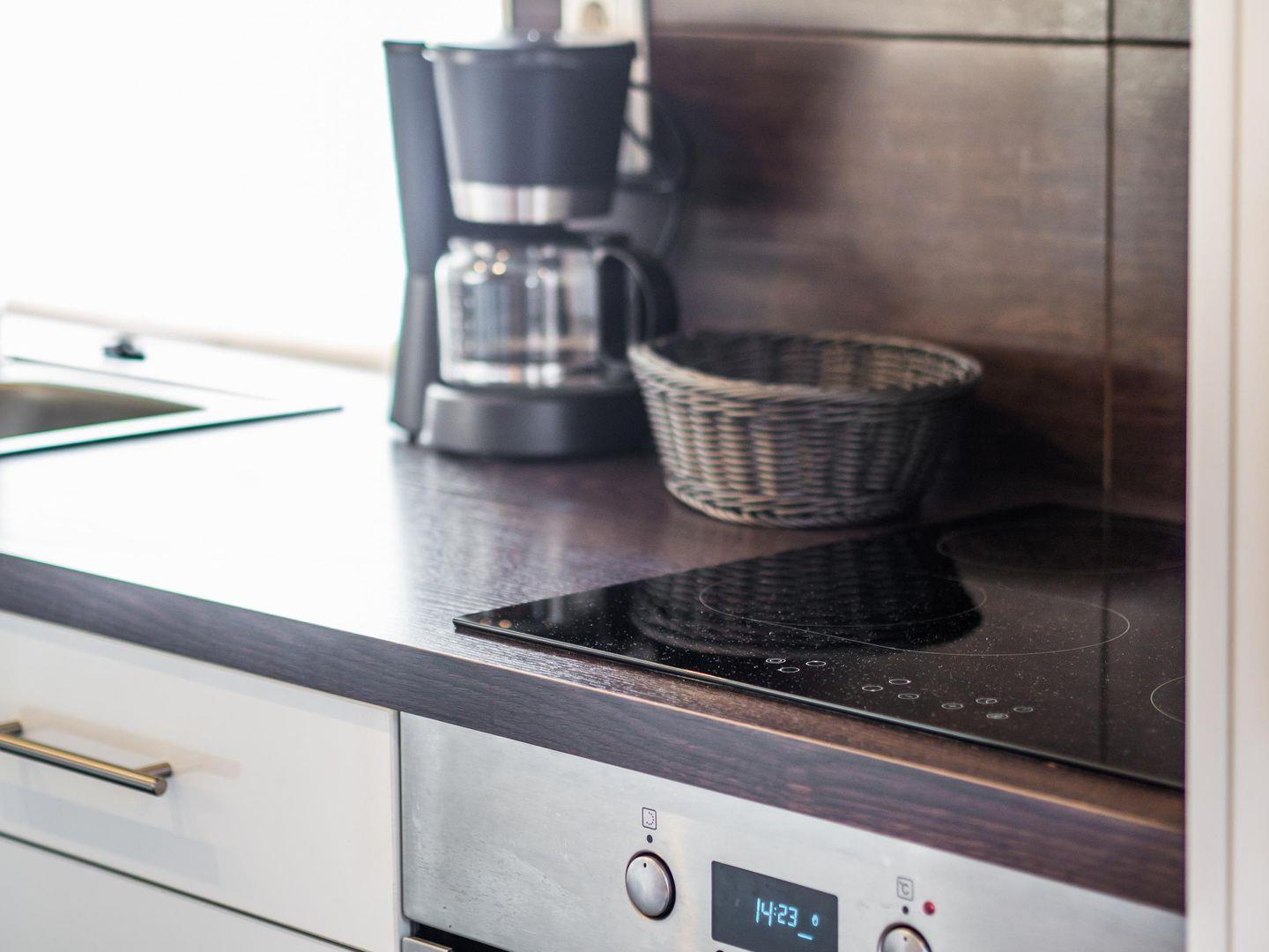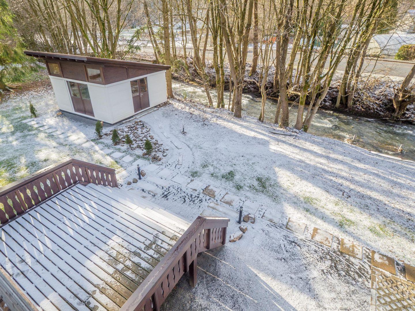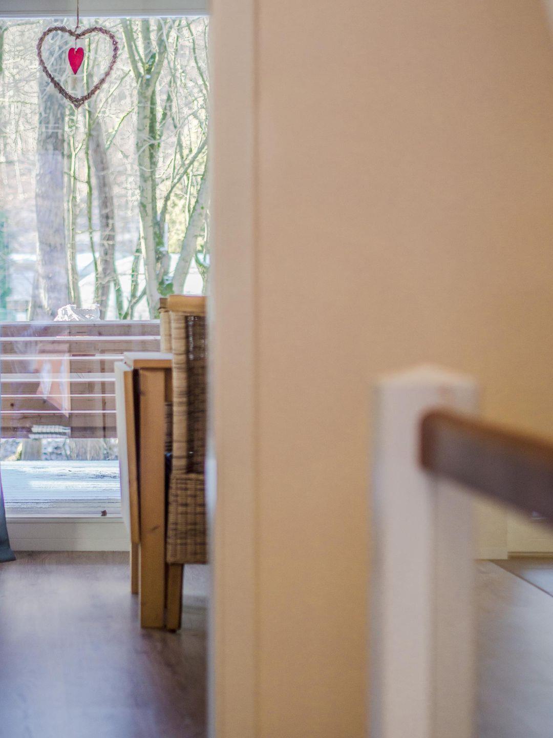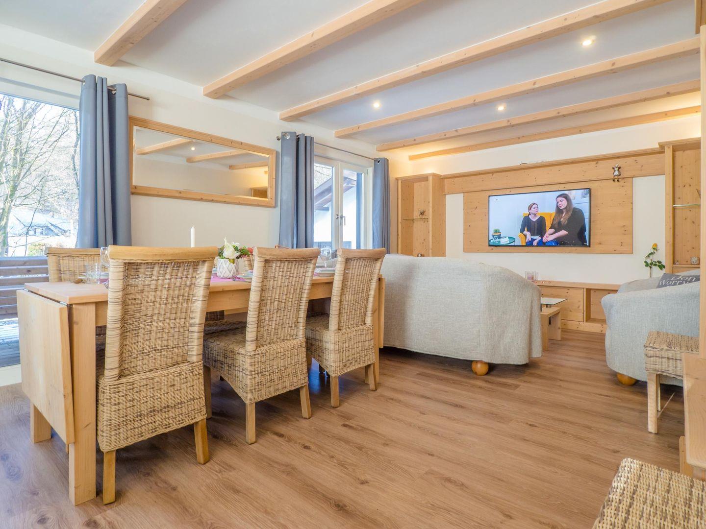 Von der voll ausgestatteten Wohnküche mit Theke, großen Kühlschrank mit Gefrierfach, Essbereich und Ecksofa gelangen Sie auf die Terrasse. Im 850qm großen Aussenbereich steht Ihnen ein Grill und weitere Sitzplätze zur Verfügung. Direkt am Bachlauf steht Ihnen ein beheizbarer