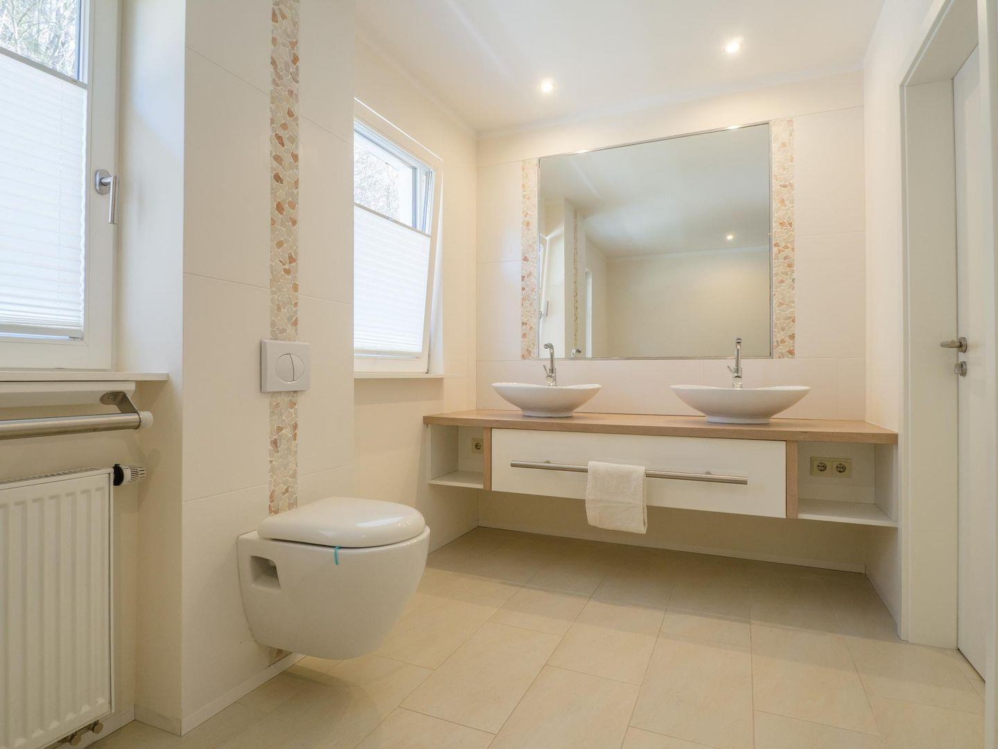 Mittlere Etage: 1 Bad mit Dusche, 2 Waschbecken und WC