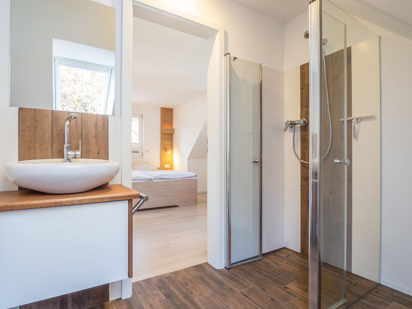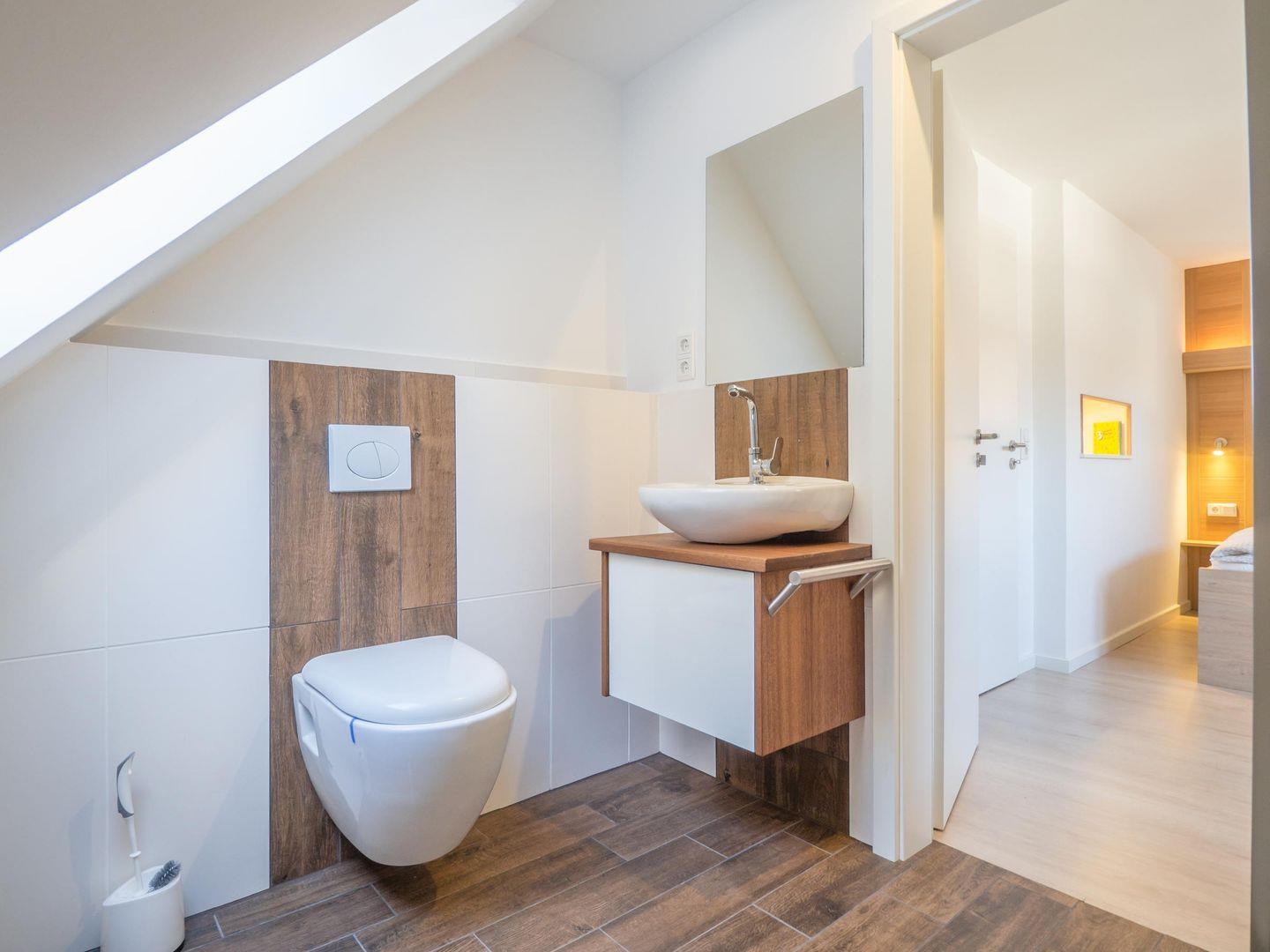 Obere Etage: 1 Bad mit Dusche, Waschbecken und WC