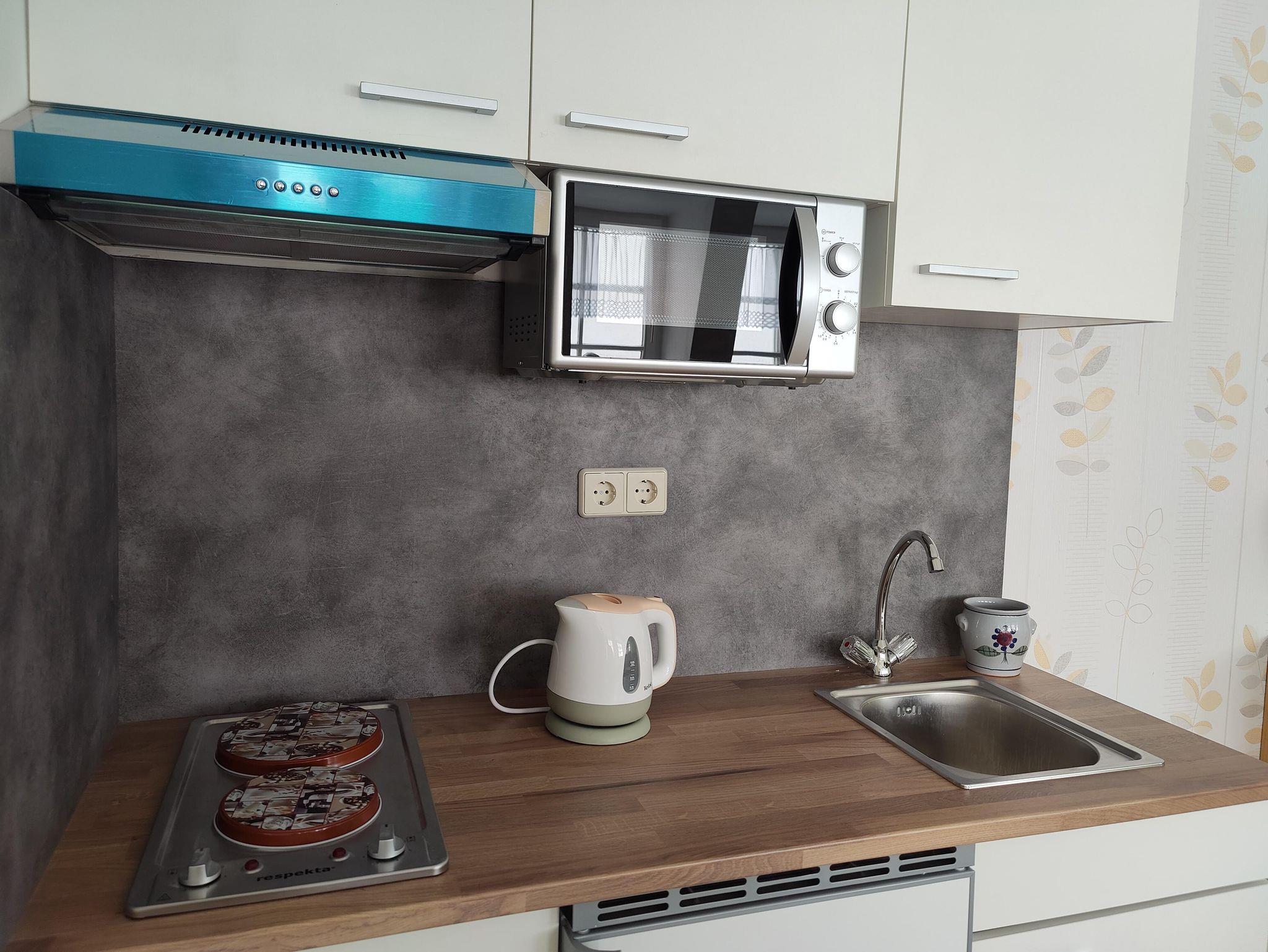 • Küche mit 2 Kochstellen, Kühlschrank, Kaffeemaschine und Mikrowelle