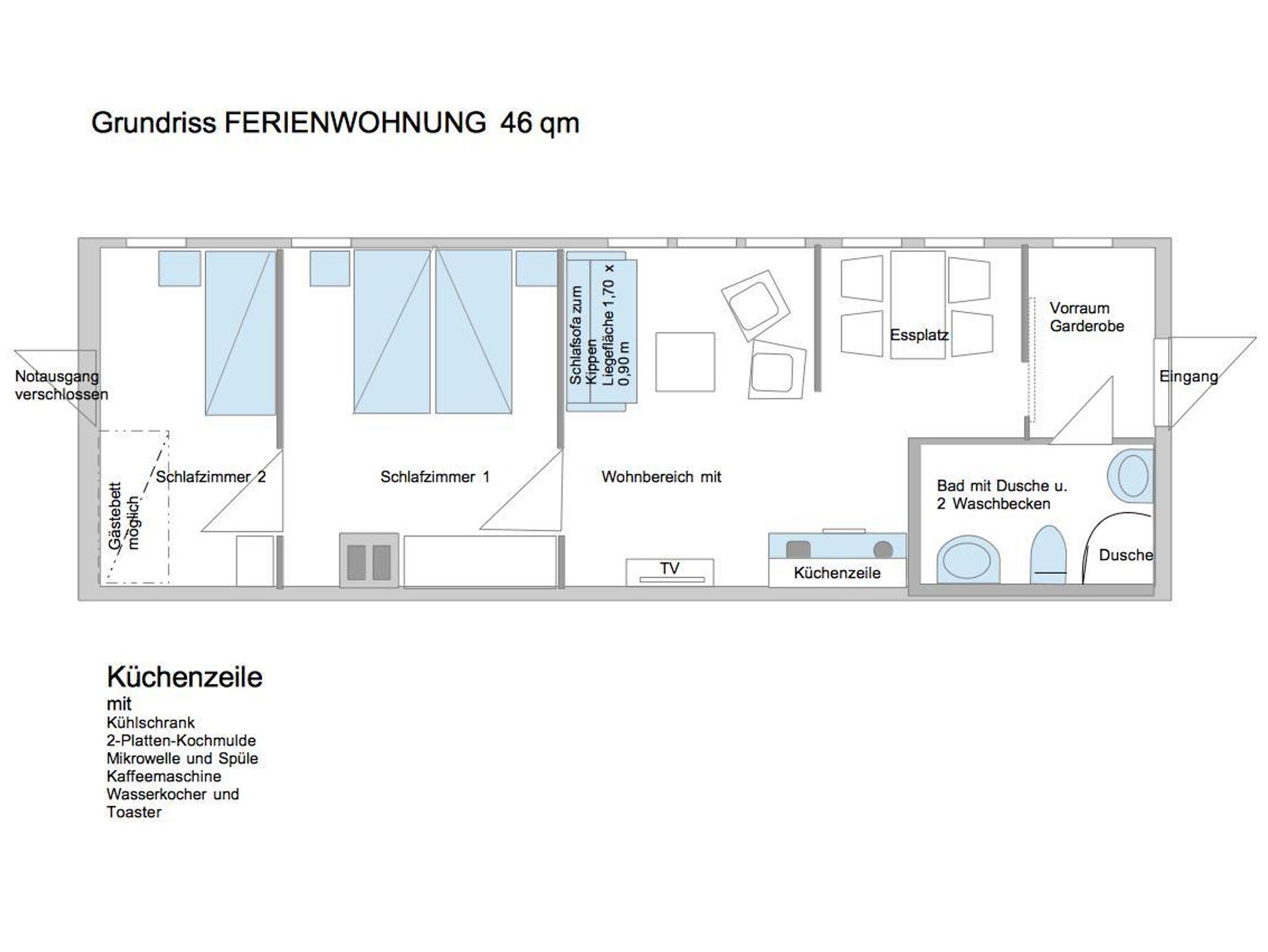 Zur Ferienwohnung für 2 bis max. 5 Personen gehören ein Entrée und ein Bad. Der Küchenbereich mit gut ausgestatteter Küchenzeile und Esstisch machen einen längeren Aufenthalt angenehm. Ein seperater Wohnraum mit angenehmer Sitzgruppe inkl. TV sowie 1 Schlafzimmer mit zwei Betten und 1 Schlafzimmer mit einem Bett komplettieren die Wohnung. Die Schlafmöglichkeiten lassen sich um ein Zustellbett und einer Aufbettung erweitern.